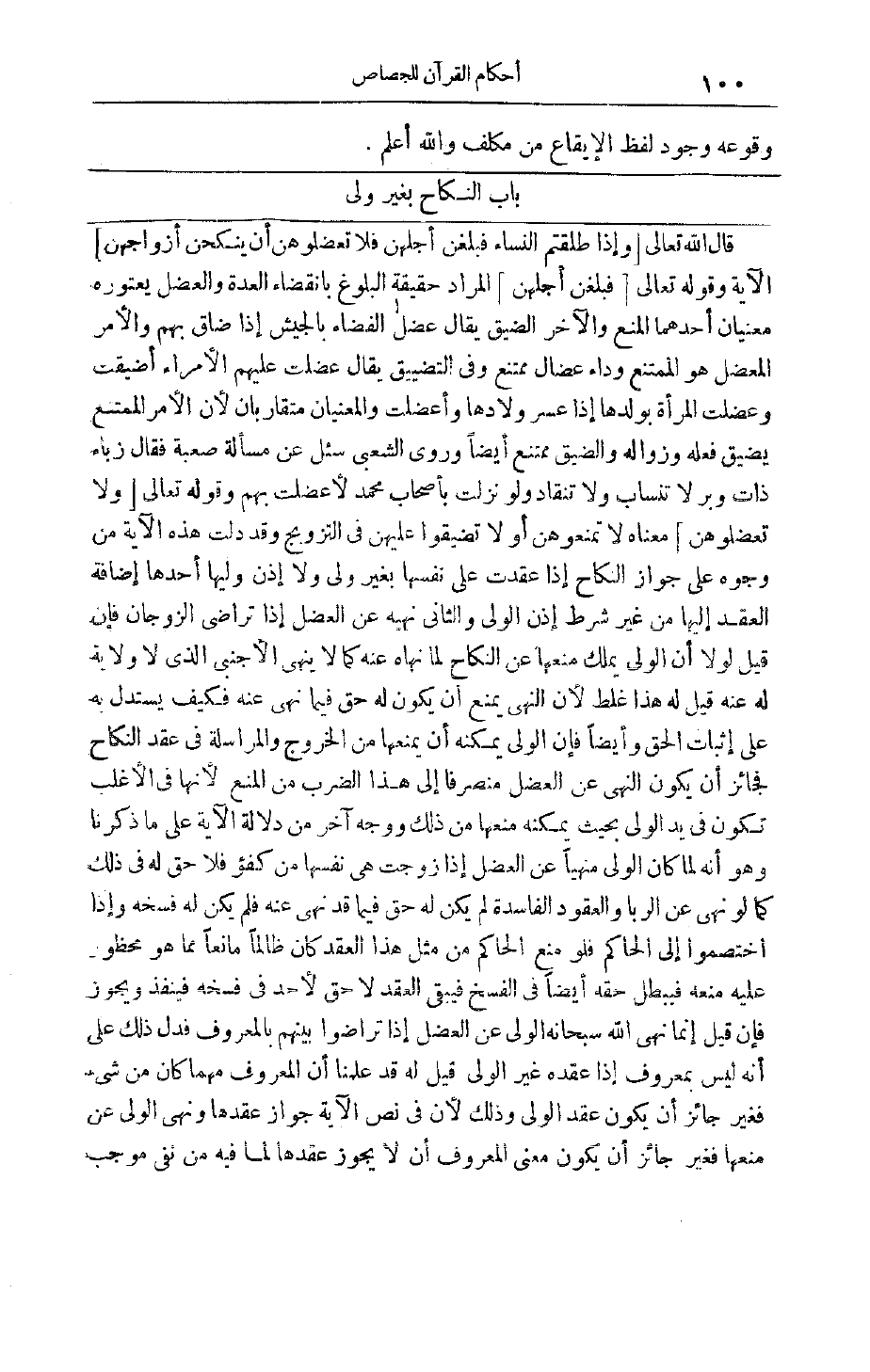 قَالَ اللَّهُ تَعَالَى وَإِذا طَلَّقْتُمُ النِّساءَ فَبَلَغْنَ أَجَلَهُنَّ فَلا تَعْضُلُوهُنَّ أَنْ يَنْكِحْنَ أَزْواجَهُنَّ الآية وقوله تعالى فَبَلَغْنَ أَجَلَهُنَّ الْمُرَادُ حَقِيقَةُ الْبُلُوغِ بِانْقِضَاءِ الْعِدَّةِ وَالْعَضْلُ يَعْتَوِرُهُ مَعْنَيَانِ أَحَدُهُمَا الْمَنْعُ وَالْآخَرُ الضِّيقُ يُقَالُ عَضَلَ الْفَضَاءُ بِالْجَيْشِ إذَا ضَاقَ بِهِمْ وَالْأَمْرُ الْمُعْضِلُ هُوَ الْمُمْتَنِعُ وَدَاءٌ عُضَالٌ مُمْتَنِعٌ وَفِي التَّضْيِيقِ يقال عضلت عليهم الأمراء أضيقت وعضلت الْمَرْأَةُ بِوَلَدِهَا إذَا عَسَرَ وِلَادُهَا وَأَعْضَلَتْ وَالْمَعْنَيَانِ مُتَقَارِبَانِ لِأَنَّ الْأَمْرَ الْمُمْتَنِعَ يَضِيقُ فِعْلُهُ وَزَوَالُهُ والضيق ممتنع أيضا وروى الشَّعْبِيَّ سُئِلَ عَنْ مَسْأَلَةٍ صَعْبَةٍ فَقَالَ زَبَّاءُ ذَاتُ وَبَرٍ لَا تَنْسَابُ وَلَا تَنْقَادُ وَلَوْ نَزَلَتْ بِأَصْحَابِ مُحَمَّدٍ لَأَعْضَلَتْ بِهِمْ وقَوْله تَعَالَى وَلا تَعْضُلُوهُنَّ مَعْنَاهُ لَا تَمْنَعُوهُنَّ أَوْ لَا تُضَيِّقُوا عَلَيْهِنَّ فِي التَّزْوِيجِ وَقَدْ دَلَّتْ هَذِهِ الْآيَةُ مِنْ وُجُوهٍ عَلَى جَوَازِ النِّكَاحِ إذَا عَقَدَتْ عَلَى نَفْسِهَا بِغَيْرِ وَلِيِّ وَلَا إذْنِ وَلِيِّهَا أَحَدُهَا إضَافَةُ الْعَقْدِ إلَيْهَا مِنْ غَيْرِ شَرْطِ إذْنِ الْوَلِيِّ وَالثَّانِي نَهْيُهُ عَنْ الْعَضْلِ إذَا تَرَاضَى الزَّوْجَانِ فَإِنْ قِيلَ لَوْلَا أَنَّ الْوَلِيَّ يَمْلِكُ مَنْعَهَا عَنْ النِّكَاحِ لَمَا نَهَاهُ عَنْهُ كَمَا لَا يُنْهَى الْأَجْنَبِيُّ الَّذِي لَا وِلَايَةَ لَهُ عَنْهُ قِيلَ لَهُ هَذَا غَلَطٌ لِأَنَّ النَّهْيَ يَمْنَعُ أَنْ يَكُونَ لَهُ حَقٌّ فِيمَا نُهِيَ عَنْهُ فَكَيْفَ يُسْتَدَلُّ بِهِ عَلَى إثْبَاتِ الْحَقِّ وَأَيْضًا فَإِنَّ الْوَلِيَّ يُمْكِنُهُ أَنْ يَمْنَعَهَا مِنْ الْخُرُوجِ وَالْمُرَاسَلَةِ فِي عَقْدِ النِّكَاحِ فَجَائِزٌ أَنْ يَكُونَ النَّهْيُ عَنْ الْعَضْلِ مُنْصَرِفًا إلَى هَذَا الضَّرْبِ مِنْ الْمَنْعِ لِأَنَّهَا فِي الْأَغْلَبِ تَكُونُ فِي يَدِ الْوَلِيِّ بِحَيْثُ يُمْكِنُهُ مَنْعُهَا مِنْ ذَلِكَ وَوَجْهٌ آخَرُ مِنْ دَلَالَةِ الْآيَةِ عَلَى مَا ذَكَرْنَا وَهُوَ أَنَّهُ لَمَّا كَانَ الْوَلِيُّ مَنْهِيًّا عَنْ الْعَضْلِ إذَا زَوَّجَتْ هِيَ نَفْسَهَا من كفؤ فَلَا حَقَّ لَهُ فِي ذَلِكَ كَمَا لَوْ نُهِيَ عَنْ الرِّبَا وَالْعُقُودِ الْفَاسِدَةِ لَمْ يَكُنْ لَهُ حَقٌّ فِيمَا قَدْ نُهِيَ عَنْهُ فَلَمْ يَكُنْ لَهُ فَسْخُهُ وَإِذَا اخْتَصَمُوا إلَى الْحَاكِمِ فَلَوْ مَنَعَ الْحَاكِمُ مِنْ مِثْلِ هَذَا الْعَقْدِ كَانَ ظَالِمًا مَانِعًا مِمَّا هُوَ مَحْظُورٌ عَلَيْهِ مَنْعُهُ فَيَبْطُلُ حَقُّهُ أَيْضًا فِي الْفَسْخِ فَيَبْقَى الْعَقْدُ لَا حَقَّ لِأَحَدٍ فِي فَسْخِهِ فَيَنْفُذُ وَيَجُوزُ فَإِنْ قِيلَ إنَّمَا نَهَى اللَّهُ سُبْحَانَهُ الْوَلِيَّ عَنْ الْعَضْلِ إذَا تَرَاضَوْا بَيْنَهُمْ بِالْمَعْرُوفِ فَدَلَّ ذَلِكَ عَلَى أَنَّهُ لَيْسَ بِمَعْرُوفٍ إذَا عَقَدَهُ غَيْرُ الْوَلِيِّ قِيلَ لَهُ قَدْ عَلِمْنَا أَنَّ الْمَعْرُوفَ مَهْمَا كَانَ مِنْ شَيْءٍ فَغَيْرُ جائز أن يكون عقد الولي وذلك لأن في نص الآية جواز عقدها ونهى الولي عن منعها فَغَيْرُ جَائِزٍ أَنْ يَكُونَ مَعْنَى الْمَعْرُوفِ أَنْ لَا يَجُوزَ عَقْدُهَا لِمَا فِيهِ مِنْ نَفْيٍ موجب