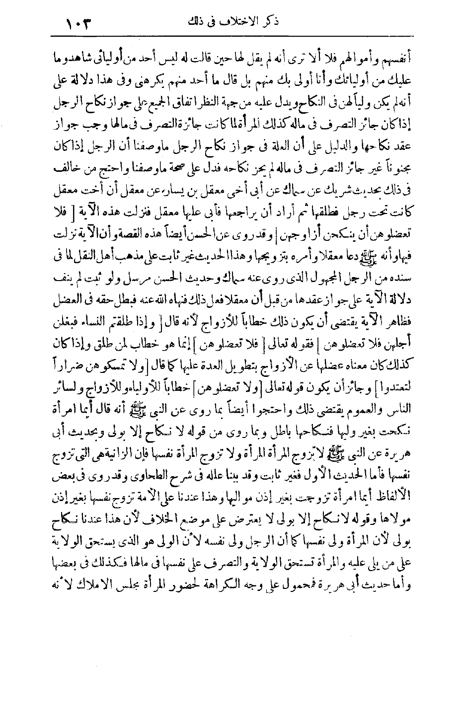 أَنْفُسِهِمْ وَأَمْوَالِهِمْ فَلَا أَلَا تَرَى أَنَّهُ لَمْ يَقُلْ لَهَا حِينَ قَالَتْ لَهُ لَيْسَ أَحَدٌ مِنْ أَوْلِيَائِي شَاهِدٌ وَمَا عَلَيْك مِنْ أَوْلِيَائِك وَأَنَا أَوْلَى بِك مِنْهُمْ بَلْ قَالَ مَا أَحَدٌ مِنْهُمْ يَكْرَهُنِي وَفِي هَذَا دَلَالَةٌ عَلَى أَنَّهُ لَمْ يَكُنْ وَلِيًّا لَهُنَّ فِي النِّكَاحِ وَيَدُلُّ عَلَيْهِ مِنْ جِهَةِ النَّظَرِ اتِّفَاقُ الْجَمِيعِ عَلَى جَوَازِ نِكَاحِ الرَّجُلِ إذَا كَانَ جَائِزَ التَّصَرُّفِ فِي مَالِهِ كَذَلِكَ الْمَرْأَةُ لَمَّا كَانَتْ جَائِزَةَ التَّصَرُّفِ فِي مَالِهَا وَجَبَ جَوَازُ عَقْدِ نِكَاحِهَا وَالدَّلِيلُ عَلَى أَنَّ الْعِلَّةَ فِي جَوَازِ نِكَاحِ الرَّجُلِ مَا وَصَفْنَا أَنَّ الرَّجُلَ إذَا كَانَ مَجْنُونًا غَيْرَ جَائِزِ التَّصَرُّفِ فِي مَالِهِ لم يحز نِكَاحُهُ فَدَلَّ عَلَى صِحَّةِ مَا وَصَفْنَا وَاحْتَجَّ مَنْ خَالَفَ فِي ذَلِكَ بِحَدِيثِ شَرِيكٍ عَنْ سماك عن أُبَيٍّ أَخِي مَعْقِلِ بْنِ يَسَارٍ عَنْ مَعْقِلٍ أَنَّ أُخْتَ مَعْقِلٍ كَانَتْ تَحْتَ رَجُلٍ فَطَلَّقَهَا ثُمَّ أَرَادَ أَنْ يُرَاجِعَهَا فَأَبَى عَلَيْهَا مَعْقِلٌ فَنَزَلَتْ هَذِهِ الْآيَةُ فَلا تَعْضُلُوهُنَّ أَنْ يَنْكِحْنَ أَزْواجَهُنَّ