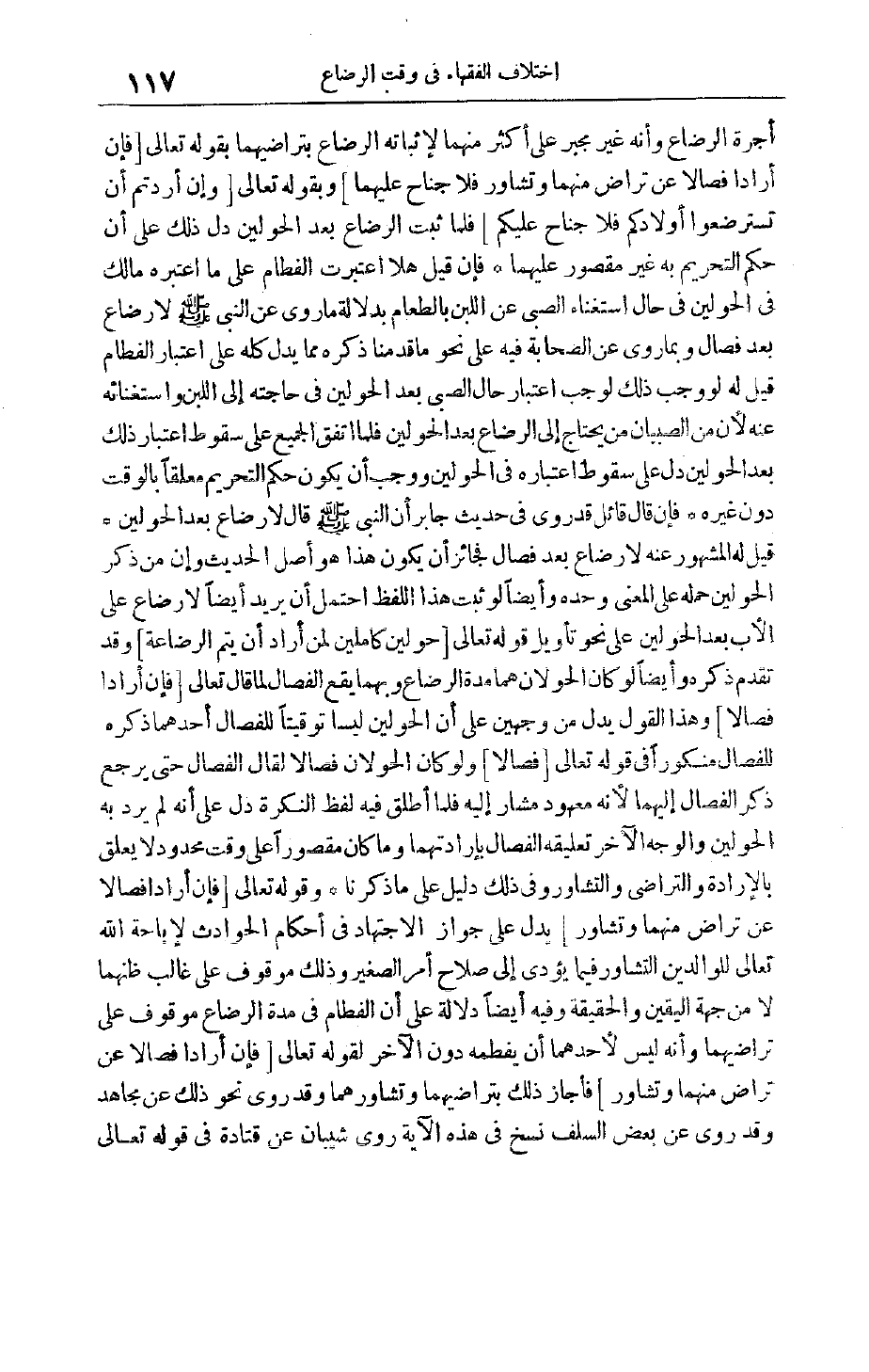 قِيلَ لَهُ الْمَشْهُورُ عَنْهُ لَا رَضَاعَ بَعْدَ فِصَالٍ فَجَائِزٌ أَنْ يَكُونَ هَذَا هُوَ أَصْلُ الْحَدِيثِ وَأَنَّ مَنْ ذَكَرَ الْحَوْلَيْنِ حَمَلَهُ عَلَى الْمَعْنَى وَحْدَهُ وَأَيْضًا لَوْ ثَبَتَ هَذَا اللَّفْظُ احْتَمَلَ أَنْ يُرِيدَ أَيْضًا لَا رَضَاعَ عَلَى الْأَبِ بَعْدَ الْحَوْلَيْنِ عَلَى نَحْوِ تَأْوِيلِ قَوْله تَعَالَى حَوْلَيْنِ كامِلَيْنِ لِمَنْ أَرادَ أَنْ يُتِمَّ الرَّضاعَةَ وَقَدْ تَقَدَّمَ ذِكْرُهُ وَأَيْضًا لَوْ كَانَ الْحَوْلَانِ هُمَا مُدَّةُ الرَّضَاعِ وَبِهِمَا يَقَعُ الْفِصَالُ لَمَا قال تعالى فَإِنْ أَرادا فِصالًا وَهَذَا الْقَوْلُ يَدُلُّ مِنْ وَجْهَيْنِ عَلَى أَنَّ الْحَوْلَيْنِ لَيْسَا تَوْقِيتًا لِلْفِصَالِ أَحَدُهُمَا ذِكْرُهُ لِلْفِصَالِ مَنْكُورًا فِي قَوْله تَعَالَى فِصالًا وَلَوْ كَانَ الْحَوْلَانِ فِصَالًا لَقَالَ الْفِصَالَ حَتَّى يَرْجِعَ ذِكْرُ الْفِصَالِ إلَيْهِمَا لِأَنَّهُ مَعْهُودٌ مُشَارٌ إلَيْهِ فَلَمَّا أَطْلَقَ فِيهِ لَفْظَ النَّكِرَةِ دَلَّ عَلَى أَنَّهُ لَمْ يُرِدْ بِهِ الْحَوْلَيْنِ وَالْوَجْهُ الْآخَرُ تَعْلِيقُهُ الْفِصَالَ بِإِرَادَتِهِمَا وَمَا كَانَ مَقْصُورًا عَلَى وَقْتٍ مَحْدُودٍ لَا يُعَلَّقُ بِالْإِرَادَةِ وَالتَّرَاضِي وَالتَّشَاوُرِ وَفِي ذَلِكَ دَلِيلٌ عَلَى مَا ذَكَرْنَا وقَوْله تَعَالَى فَإِنْ أَرادا فِصالًا عَنْ تَراضٍ مِنْهُما وَتَشاوُرٍ يَدُلُّ عَلَى جَوَازِ الِاجْتِهَادِ فِي أَحْكَامِ الْحَوَادِثِ لِإِبَاحَةِ اللَّهِ تَعَالَى لَلْوَالِدَيْنِ التَّشَاوُرَ فِيمَا يُؤَدِّي إلَى صَلَاحِ أَمْرِ الصَّغِيرِ وَذَلِكَ مَوْقُوفٌ عَلَى غَالِبِ ظَنِّهِمَا لَا مِنْ جِهَةِ الْيَقِينِ وَالْحَقِيقَةِ وَفِيهِ أَيْضًا دَلَالَةٌ عَلَى أَنَّ الْفِطَامَ فِي مُدَّةِ الرَّضَاعِ مَوْقُوفٌ عَلَى تُرَاضِيهِمَا وَأَنَّهُ لَيْسَ لِأَحَدِهِمَا أَنْ يَفْطِمَهُ دُونَ الْآخَرِ لِقَوْلِهِ تَعَالَى فَإِنْ أَرادا فِصالًا عَنْ تَراضٍ مِنْهُما وَتَشاوُرٍ فَأَجَازَ ذَلِكَ بِتَرَاضِيهِمَا وَتَشَاوُرِهِمَا وَقَدْ رُوِيَ نَحْوُ ذَلِكَ عَنْ مُجَاهِدٍ وَقَدْ رُوِيَ عَنْ بَعْضِ السَّلَفِ نَسْخٌ فِي هَذِهِ الْآيَةِ رَوَى شَيْبَانُ عَنْ قَتَادَةَ فِي قَوْله تَعَالَى