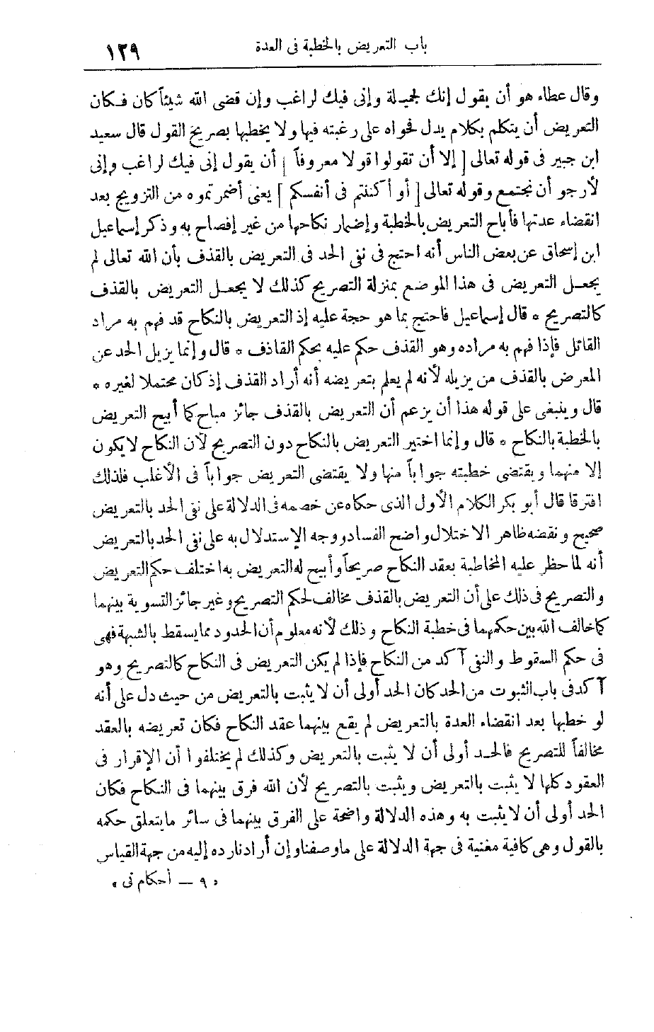 وَقَالَ عَطَاءٌ هُوَ أَنْ يَقُولَ إنَّك لَجَمِيلَةٌ وَإِنِّي فِيك لَرَاغِبٌ وَإِنْ قَضَى اللَّهُ شَيْئًا كَانَ فَكَانَ التَّعْرِيضُ أَنْ يَتَكَلَّمَ بِكَلَامٍ يَدُلُّ فَحَوَاهُ عَلَى رَغْبَتِهِ فِيهَا وَلَا يُخْطِبُهَا بِصَرِيحِ القول قال سعيد ابن جُبَيْرٍ فِي قَوْله تَعَالَى إِلَّا أَنْ تَقُولُوا قَوْلًا مَعْرُوفاً أَنْ يَقُولَ إنِّي فِيك لَرَاغِبٌ وَإِنِّي لَأَرْجُوَ أَنْ نَجْتَمِعَ وقَوْله تَعَالَى أَوْ أَكْنَنْتُمْ فِي أَنْفُسِكُمْ يَعْنِي أَضْمَرْتُمُوهُ مِنْ التَّزْوِيجِ بَعْدَ انْقِضَاءِ عِدَّتِهَا فَأَبَاحَ التَّعْرِيضَ بِالْخِطْبَةِ وَإِضْمَارَ نِكَاحِهَا مِنْ غَيْرِ إفصاح به وذكر إسماعيل ابن إِسْحَاقَ عَنْ بَعْضِ النَّاسِ أَنَّهُ احْتَجَّ فِي نَفْيِ الْحَدِّ فِي التَّعْرِيضِ بِالْقَذْفِ بِأَنَّ اللَّهَ تَعَالَى لَمْ يَجْعَلْ التَّعْرِيضَ فِي هَذَا الْمَوْضِعِ بِمَنْزِلَةِ التَّصْرِيحِ كَذَلِكَ لَا يُجْعَلُ التَّعْرِيضُ بِالْقَذْفِ كَالتَّصْرِيحِ قَالَ إسْمَاعِيلُ فَاحْتَجَّ بِمَا هُوَ حُجَّةٌ عَلَيْهِ إذْ التَّعْرِيضُ بِالنِّكَاحِ قَدْ فُهِمَ بِهِ مُرَادُ الْقَائِلِ فَإِذَا فُهِمَ بِهِ مُرَادُهُ وَهُوَ الْقَذْفُ حُكِمَ عَلَيْهِ بِحُكْمِ الْقَاذِفِ قَالَ وَإِنَّمَا يُزِيلُ الْحَدَّ عَنْ الْمُعَرِّضِ بِالْقَذْفِ مَنْ يُزِيلُهُ لأنه لم يعلم بتعريضه أنه أراد القذف إذْ كَانَ مُحْتَمِلًا لِغَيْرِهِ قَالَ وَيَنْبَغِي عَلَى قَوْلِهِ هَذَا أَنْ يَزْعُمَ أَنَّ التَّعْرِيضَ بِالْقَذْفِ جَائِزٌ مُبَاحٌ كَمَا أُبِيحَ التَّعْرِيضُ بِالْخِطْبَةِ بِالنِّكَاحِ قَالَ وَإِنَّمَا اُخْتِيرَ التَّعْرِيضُ بِالنِّكَاحِ دُونَ التَّصْرِيحِ لِأَنَّ النِّكَاحَ لَا يَكُونُ إلَّا مِنْهُمَا وَيَقْتَضِي خِطْبَتُهُ جَوَابًا مِنْهَا وَلَا يَقْتَضِي التَّعْرِيضُ جَوَابًا فِي الْأَغْلَبِ فَلِذَلِكَ افْتَرَقَا قَالَ أَبُو بَكْرٍ الْكَلَامُ الْأَوَّلُ الَّذِي حَكَاهُ عَنْ خَصْمِهِ فِي الدلالة به عَلَى نَفْيِ الْحَدِّ بِالتَّعْرِيضِ صَحِيحٌ وَنَقْضُهُ ظَاهِرُ الِاخْتِلَالِ وَاضِحُ الْفَسَادِ وَوَجْهُ الِاسْتِدْلَالِ بِهِ عَلَى نَفْيِ الْحَدِّ بِالتَّعْرِيضِ أَنَّهُ لَمَّا حَظَرَ عَلَيْهِ الْمُخَاطَبَةَ بِعَقْدِ النِّكَاحِ صَرِيحًا وَأُبِيحَ لَهُ التَّعْرِيضُ بِهِ اخْتَلَفَ حُكْمُ التَّعْرِيضِ وَالتَّصْرِيحِ فِي ذَلِكَ عَلَى أَنَّ التَّعْرِيضَ بِالْقَذْفِ مُخَالِفٌ لِحُكْمِ التَّصْرِيحِ وَغَيْرُ جَائِزٍ التَّسْوِيَةُ بَيْنَهُمَا كَمَا خَالَفَ اللَّهُ بَيْنَ حُكْمِهِمَا فِي خِطْبَةِ النِّكَاحِ وَذَلِكَ لِأَنَّهُ مَعْلُومٌ أَنَّ الْحُدُودَ مِمَّا يَسْقُطُ بِالشُّبْهَةِ فَهِيَ فِي حُكْمِ السُّقُوطِ وَالنَّفْيُ آكَدُّ مِنْ النِّكَاحِ فَإِذَا لَمْ يَكُنْ التَّعْرِيضُ فِي النِّكَاحِ كَالتَّصْرِيحِ وَهُوَ آكَدُّ فِي بَابِ الثُّبُوتِ مِنْ الْحَدِّ كَانَ الْحَدُّ أَوْلَى أَنْ لَا يَثْبُتَ بِالتَّعْرِيضِ مِنْ حَيْثُ دَلَّ عَلَى أَنَّهُ لَوْ خَطَبَهَا بَعْدَ انْقِضَاءِ الْعِدَّةِ بِالتَّعْرِيضِ لَمْ يَقَعْ بَيْنَهُمَا عَقْدُ النِّكَاحِ فَكَانَ تَعْرِيضُهُ بِالْعَقْدِ مُخَالِفًا لِلتَّصْرِيحِ فَالْحَدُّ أَوْلَى أَنْ لَا يَثْبُتَ بِالتَّعْرِيضِ وَكَذَلِكَ لَمْ يَخْتَلِفُوا أَنَّ الْإِقْرَارَ فِي الْعُقُودِ كُلِّهَا لَا يَثْبُتُ بِالتَّعْرِيضِ وَيَثْبُتُ بِالتَّصْرِيحِ لِأَنَّ اللَّهَ فَرَّقَ بَيْنَهُمَا فِي النِّكَاحِ فَكَانَ الْحَدُّ أَوْلَى أَنْ لَا يَثْبُتَ بِهِ وَهَذِهِ الدَّلَالَةُ وَاضِحَةٌ عَلَى الْفَرْقِ بَيْنَهُمَا فِي سَائِرِ مَا يَتَعَلَّقُ حكمه بالقول وهي كافية مغنية في جِهَةِ الدَّلَالَةِ عَلَى مَا وَصَفْنَا وَإِنْ أَرَدْنَا رده إليه من جهة القياس «9- أحكام في»