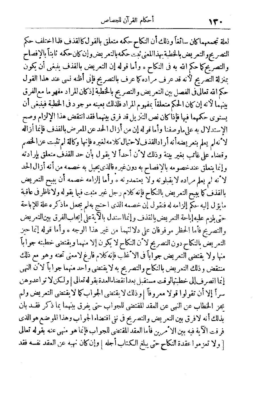 لِعِلَّةٍ تَجْمَعُهُمَا كَانَ سَائِغًا وَذَلِكَ أَنَّ النِّكَاحَ حُكْمُهُ مُتَعَلِّقٌ بِالْقَوْلِ كَالْقَذْفِ فَلَمَّا اخْتَلَفَ حُكْمُ التَّصْرِيحِ وَالتَّعْرِيضِ بِالْخِطْبَةِ بِهَذَا الْمَعْنَى ثَبَتَ حُكْمُهُ بِالتَّعْرِيضِ وَإِنْ كَانَ حُكْمُهُ ثَابِتًا بِالْإِفْصَاحِ وَالتَّصْرِيحِ كَمَا حَكَمَ اللَّهُ بِهِ فِي النِّكَاحِ وَأَمَّا قَوْلُهُ إنَّ التَّعْرِيضَ بِالْقَذْفِ يَنْبَغِي أَنْ يَكُونَ بِمَنْزِلَةِ التَّصْرِيحِ لِأَنَّهُ قَدْ عُرِفَ مُرَادُهُ كَمَا عُرِفَ بِالتَّصْرِيحِ فَإِنِّي أَظُنُّهُ نَسِيَ عِنْدَ هَذَا الْقَوْلِ حُكْمَ اللَّهِ تَعَالَى فِي الْفَصْلِ بَيْنَ التَّعْرِيضِ وَالتَّصْرِيحِ بِالْخِطْبَةِ إذْ كَانَ الْمُرَادُ مَفْهُومًا مَعَ الْفَرْقِ بَيْنَهُمَا لِأَنَّهُ إنْ كَانَ الْحُكْمُ متعلقا بمفهوم المراد فلذلك بِعَيْنِهِ مَوْجُودٌ فِي الْخِطْبَةِ فَيَنْبَغِي أَنْ يَسْتَوِيَ حُكْمُهُمَا فِيهَا فَإِذَا كَانَ نَصُّ التَّنْزِيلِ قَدْ فَرَّقَ بَيْنَهُمَا فَقَدْ اُنْتُقِضَ هَذَا الْإِلْزَامُ وَصَحَّ الِاسْتِدْلَال بِهِ عَلَى مَا وَصَفْنَا وَأَمَّا قَوْلُهُ إنَّ مَنْ أَزَالَ الْحَدَّ عَنْ الْمُعَرِّضِ بِالْقَذْفِ فَإِنَّمَا أَزَالَهُ لِأَنَّهُ لَمْ يَعْلَمْ بِتَعْرِيضِهِ أَنَّهُ أَرَادَ الْقَذْفَ لِاحْتِمَالِ كَلَامِهِ لِغَيْرِهِ فَإِنَّهَا وَكَالَةٌ لَمْ تَثْبُتْ عَنْ الْخَصْمِ وَقَضَاءٌ عَلَى غَائِبٍ بِغَيْرِ بَيِّنَةٍ وَذَلِكَ لِأَنَّ أَحَدًا لَا يَقُولُ بِأَنَّ حَدَّ الْقَذْفِ مُتَعَلِّقٌ بِإِرَادَتِهِ وَإِنَّمَا يَتَعَلَّقُ عِنْدَ خُصُومِهِ بِالْإِفْصَاحِ بِهِ دُونَ غَيْرِهِ فَاَلَّذِي يُحِيلُ بِهِ خَصْمُهُ مِنْ أَنَّهُ أَزَالَ الْحَدَّ لأنه لم يعلم مراده لا يَقْبَلُونَهُ وَلَا يَعْتَمِدُونَهُ وَأَمَّا إلْزَامُهُ خَصْمَهُ أَنْ يُبِيحَ التَّعْرِيضَ بِالْقَذْفِ كَمَا يُبِيحُ التَّعْرِيضَ بِالنِّكَاحِ فإنه كلام رجل غير مثبت فِيمَا يَقُولُهُ وَلَا نَاظِرٍ فِي عَاقِبَةِ مَا يَئُولُ إلَيْهِ حُكْمُ إلْزَامِهِ لَهُ فَنَقُولُ إنَّ خَصْمَهُ الَّذِي احْتَجَّ بِهِ لَمْ يَجْعَلْ مَا ذَكَرَهُ عِلَّةً لِلْإِبَاحَةِ حَتَّى يَلْزَمَ عَلَيْهِ إبَاحَةُ التَّعْرِيضِ بِالْقَذْفِ وَإِنَّمَا اسْتَدَلَّ بِالْآيَةِ عَلَى إيجَابِ الفرق بين التعريض والتصريح فأما الحظر موقوفان عَلَى دَلَالَتِهِمَا مِنْ غَيْرِ هَذَا الْوَجْهِ وَأَمَّا قوله إنما حيز التَّعْرِيضُ بِالنِّكَاحِ دُونَ التَّصْرِيحِ