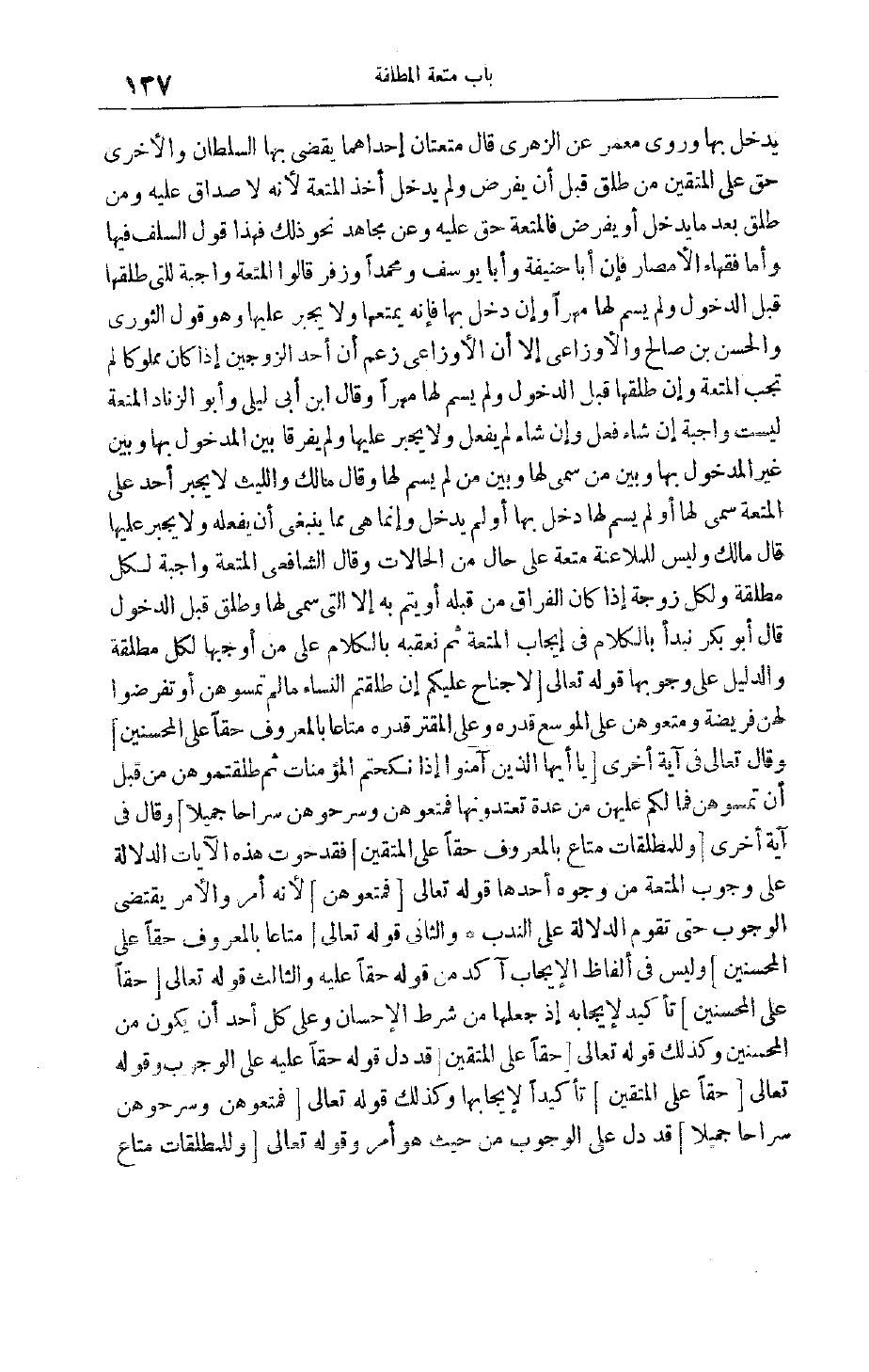 يَدْخُلَ بِهَا وَرَوَى مَعْمَرٌ عَنْ الزُّهْرِيِّ قَالَ مُتْعَتَانِ إحْدَاهُمَا يَقْضِي بِهَا السُّلْطَانُ وَالْأُخْرَى حَقٌّ عَلَى الْمُتَّقِينَ مَنْ طَلَّقَ قَبْلَ أَنْ يَفْرِضَ ولم يدخل أخذ المتعة لأنه لا صداق عليه ومن طلق بعد ما يَدْخُلُ أَوْ يَفْرِضُ فَالْمُتْعَةُ حَقٌّ عَلَيْهِ وَعَنْ مُجَاهِدٍ نَحْوُ ذَلِكَ فَهَذَا قَوْلُ السَّلَفِ فِيهَا وَأَمَّا فُقَهَاءُ الْأَمْصَارِ فَإِنَّ أَبَا حَنِيفَةَ وَأَبَا يُوسُفَ وَمُحَمَّدًا وَزُفَرَ قَالُوا الْمُتْعَةُ وَاجِبَةٌ لِلَّتِي طَلَّقَهَا قَبْلَ الدُّخُولِ وَلَمْ يُسَمِّ لَهَا مَهْرًا وَإِنْ دَخَلَ بِهَا فَإِنَّهُ يُمَتِّعُهَا وَلَا يُجْبَرُ عَلَيْهَا وَهُوَ قَوْلُ الثَّوْرِيِّ وَالْحَسَنِ بْنِ صَالِحٍ وَالْأَوْزَاعِيُّ إلَّا أَنَّ الْأَوْزَاعِيَّ زَعَمَ أَنَّ أَحَدَ الزَّوْجَيْنِ إذَا كَانَ مَمْلُوكًا لَمْ تَجِبْ الْمُتْعَةُ وَإِنْ طَلَّقَهَا قَبْلَ الدُّخُولِ وَلَمْ يُسَمِّ لَهَا مَهْرًا وَقَالَ ابْنُ أَبِي لَيْلَى وَأَبُو الزِّنَادِ الْمُتْعَةُ لَيْسَتْ وَاجِبَةً إنْ شَاءَ فَعَلَ وَإِنْ شَاءَ لَمْ يَفْعَلْ وَلَا يُجْبَرُ عَلَيْهَا وَلَمْ يُفَرِّقَا بَيْنَ الْمَدْخُولِ بِهَا وَبَيْنَ غَيْرِ الْمَدْخُولِ بِهَا وَبَيْنَ مَنْ سُمِّيَ لَهَا وَبَيْنَ مَنْ لَمْ يُسَمَّ لَهَا وَقَالَ مَالِكٌ وَاللَّيْثُ لَا يُجْبَرُ أَحَدٌ عَلَى الْمُتْعَةِ سَمَّى لَهَا أَوْ لَمْ يُسَمِّ لَهَا دَخَلَ بِهَا أَوْ لَمْ يَدْخَلْ وَإِنَّمَا هِيَ مِمَّا يَنْبَغِي أَنْ يَفْعَلَهُ وَلَا يُجْبَرَ عَلَيْهَا قَالَ مَالِكٌ وَلَيْسَ لِلْمُلَاعَنَةِ مُتْعَةٌ عَلَى حَالٍ مِنْ الْحَالَاتِ وَقَالَ الشَّافِعِيُّ الْمُتْعَةُ وَاجِبَةٌ لِكُلِّ مُطَلَّقَةٍ وَلِكُلِّ زَوْجَةٍ إذَا كَانَ الْفِرَاقُ مِنْ قِبَلِهِ أَوْ يَتِمُّ بِهِ إلَّا الَّتِي سَمَّى لَهَا وَطَلَّقَ قَبْلَ الدُّخُولِ قَالَ أَبُو بَكْرٍ نَبْدَأُ بِالْكَلَامِ فِي إيجَابِ الْمُتْعَةِ ثُمَّ نَعْقُبُهُ بِالْكَلَامِ عَلَى مَنْ أَوْجَبَهَا لِكُلِّ مُطَلَّقَةٍ وَالدَّلِيلُ عَلَى وُجُوبِهَا قَوْله تَعَالَى لا جُناحَ عَلَيْكُمْ إِنْ طَلَّقْتُمُ النِّساءَ مَا لَمْ تَمَسُّوهُنَّ أَوْ تَفْرِضُوا لَهُنَّ فَرِيضَةً وَمَتِّعُوهُنَّ عَلَى الْمُوسِعِ قَدَرُهُ وَعَلَى الْمُقْتِرِ قَدَرُهُ مَتاعاً بِالْمَعْرُوفِ حَقًّا عَلَى الْمُحْسِنِينَ وَقَالَ تَعَالَى فِي آيَةٍ أُخْرَى يَا أَيُّهَا الَّذِينَ آمَنُوا إِذا نَكَحْتُمُ الْمُؤْمِناتِ ثُمَّ طَلَّقْتُمُوهُنَّ مِنْ قَبْلِ أَنْ تَمَسُّوهُنَّ فَما لَكُمْ عَلَيْهِنَّ مِنْ عِدَّةٍ تَعْتَدُّونَها فَمَتِّعُوهُنَّ وَسَرِّحُوهُنَّ سَراحاً جَمِيلًا وَقَالَ فِي آيَةٍ أُخْرَى وَلِلْمُطَلَّقاتِ مَتاعٌ بِالْمَعْرُوفِ حَقًّا عَلَى الْمُتَّقِينَ فَقَدْ حَوَتْ هَذِهِ الْآيَاتُ الدَّلَالَةَ عَلَى وُجُوبِ الْمُتْعَةِ مِنْ وُجُوهٍ أَحَدُهَا قَوْله تَعَالَى فَمَتِّعُوهُنَّ لِأَنَّهُ أَمْرٌ وَالْأَمْرُ يَقْتَضِي الْوُجُوبَ حَتَّى تَقُومَ الدَّلَالَةُ عَلَى النَّدْبِ وَالثَّانِي قَوْله تَعَالَى مَتاعاً بِالْمَعْرُوفِ حَقًّا عَلَى الْمُحْسِنِينَ وَلَيْسَ فِي أَلْفَاظِ الْإِيجَابِ آكَدُ مِنْ قَوْلِهِ حَقًّا عَلَيْهِ وَالثَّالِثُ قَوْله تَعَالَى حَقًّا عَلَى الْمُحْسِنِينَ تَأْكِيدٌ لِإِيجَابِهِ إذْ جَعَلَهَا مِنْ شَرْطِ الْإِحْسَانِ وَعَلَى كُلِّ أَحَدٍ أَنْ يَكُونَ مِنْ الْمُحْسِنِينَ وكذلك قوله تعالى حَقًّا عَلَى الْمُتَّقِينَ قَدْ دَلَّ قَوْلُهُ حَقَّا عَلَيْهِ عَلَى الْوُجُوبِ وقوله تعالى حَقًّا عَلَى الْمُتَّقِينَ تأكيدا لِإِيجَابِهَا وَكَذَلِكَ قَوْله تَعَالَى فَمَتِّعُوهُنَّ وَسَرِّحُوهُنَّ سَراحاً جَمِيلًا قَدْ دَلَّ عَلَى الْوُجُوبِ مِنْ حَيْثُ هُو