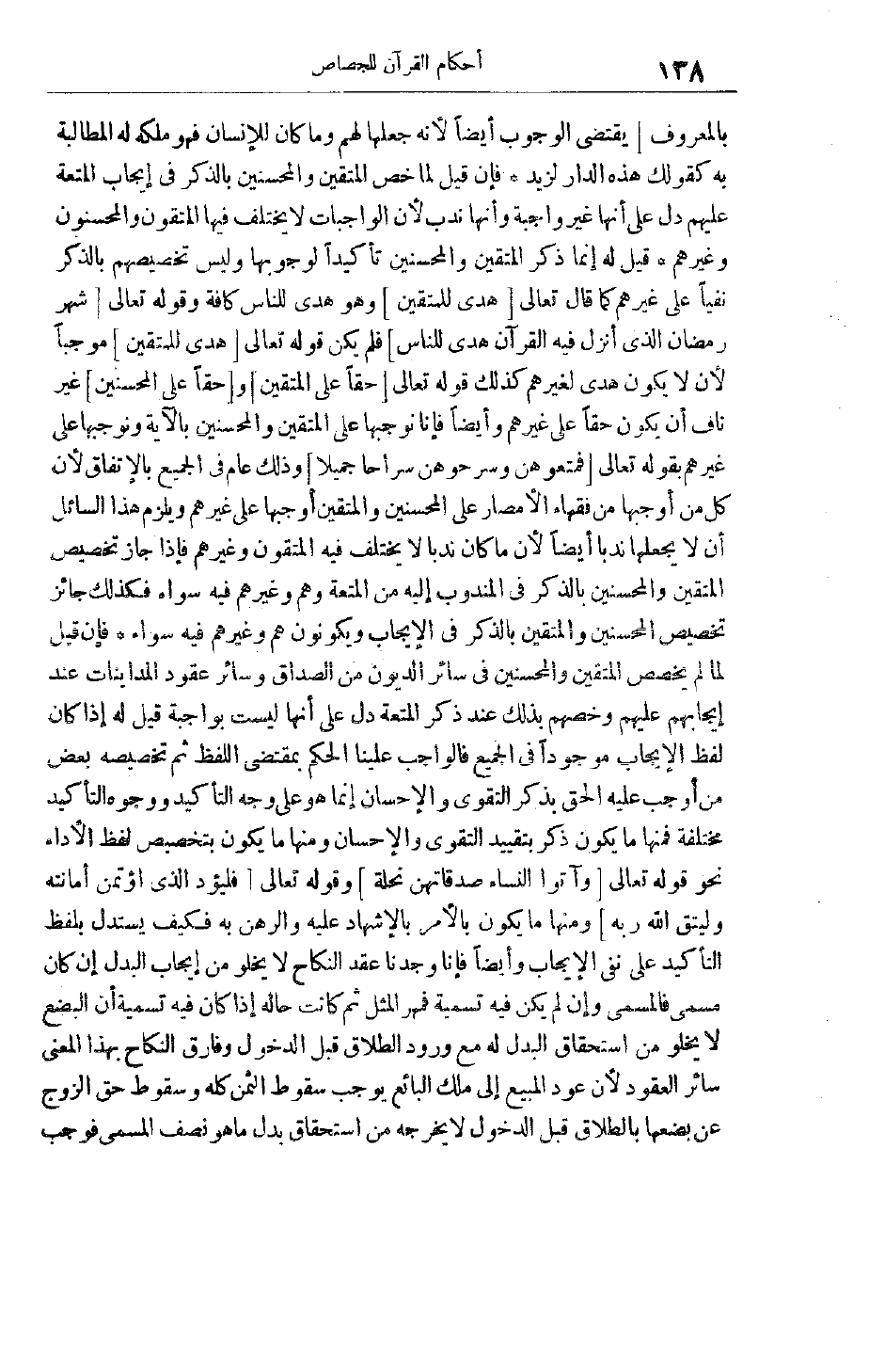 تَعَالَى شَهْرُ رَمَضانَ الَّذِي أُنْزِلَ فِيهِ الْقُرْآنُ هُدىً لِلنَّاسِ فلم يكن قوله تعالى هُدىً لِلْمُتَّقِينَ مُوجِبًا لَأَنْ لَا يَكُونَ هُدًى لِغَيْرِهِمْ كَذَلِكَ قوله تعالى حَقًّا عَلَى الْمُتَّقِينَ وحَقًّا عَلَى الْمُحْسِنِينَ غَيْرُ نَافٍ أَنْ يَكُونَ حَقًّا عَلَى غَيْرِهِمْ وَأَيْضًا فَإِنَّا نُوجِبُهَا عَلَى الْمُتَّقِينَ وَالْمُحْسِنِينَ بِالْآيَةِ وَنُوجِبُهَا عَلَى غَيْرِهِمْ بِقَوْلِهِ تَعَالَى فَمَتِّعُوهُنَّ وَسَرِّحُوهُنَّ سَراحاً جَمِيلًا وَذَلِكَ عَامٌّ فِي الْجَمِيعِ بِالِاتِّفَاقِ لِأَنَّ كُلَّ مَنْ أَوْجَبَهَا مِنْ فُقَهَاءِ الْأَمْصَارِ عَلَى الْمُحْسِنِينَ وَالْمُتَّقِينَ أَوْجَبَهَا عَلَى غَيْرِهِمْ وَيَلْزَمُ هَذَا السَّائِلَ أَنْ لَا يَجْعَلَهَا نَدْبًا أَيْضًا لِأَنَّ مَا كَانَ نَدْبًا لَا يَخْتَلِفُ فِيهِ الْمُتَّقُونَ وَغَيْرُهُمْ فَإِذَا جَازَ تَخْصِيصُ الْمُتَّقِينَ وَالْمُحْسِنِينَ بِالذِّكْرِ فِي الْمَنْدُوبِ إلَيْهِ مِنْ الْمُتْعَةِ وَهُمْ وَغَيْرُهُمْ فِيهِ سَوَاءٌ فَكَذَلِكَ جَائِزٌ تَخْصِيصُ الْمُحْسِنِينَ وَالْمُتَّقِينَ بِالذِّكْرِ فِي الْإِيجَابِ وَيَكُونُونَ هُمْ وَغَيْرُهُمْ فِيهِ سَوَاءً فَإِنْ قِيلَ لَمَّا لَمْ يُخَصِّصْ الْمُتَّقِينَ وَالْمُحْسِنِينَ فِي سَائِرِ الدُّيُونِ مِنْ الصَّدَاقِ وَسَائِرِ عُقُودِ المداينات عند إيجابهم عَلَيْهِمْ وَخَصَّهُمْ بِذَلِكَ عِنْدَ ذِكْرِ الْمُتْعَةِ دَلَّ عَلَى أَنَّهَا لَيْسَتْ بِوَاجِبَةٍ قِيلَ لَهُ إذَا كَانَ لَفْظُ الْإِيجَابِ مَوْجُودًا فِي الْجَمِيعِ فَالْوَاجِبُ عَلَيْنَا الْحُكْمُ بِمُقْتَضَى اللَّفْظِ ثُمَّ تَخْصِيصُهُ بَعْضَ مَنْ أَوْجَبَ عَلَيْهِ الْحَقَّ بِذِكْرِ التَّقْوَى وَالْإِحْسَانِ إنَّمَا هُوَ عَلَى وَجْهِ التَّأْكِيدِ وَوُجُوهُ التَّأْكِيدِ مُخْتَلِفَةٌ فَمِنْهَا مَا يَكُونُ ذُكِرَ بِتَقْيِيدِ التَّقْوَى وَالْإِحْسَانِ وَمِنْهَا مَا يَكُونُ بِتَخْصِيصِ لَفْظِ الْأَدَاءِ نَحْوُ قَوْله تَعَالَى وَآتُوا النِّساءَ صَدُقاتِهِنَّ نِحْلَةً وقَوْله تَعَالَى فَلْيُؤَدِّ الَّذِي اؤْتُمِنَ أَمانَتَهُ وَلْيَتَّقِ اللَّهَ رَبَّهُ وَمِنْهَا مَا يَكُونُ بِالْأَمْرِ بِالْإِشْهَادِ عَلَيْهِ وَالرَّهْنِ بِهِ فَكَيْفَ يُسْتَدَلُّ بِلَفْظِ التَّأْكِيدِ عَلَى نَفْيِ الْإِيجَابِ وَأَيْضًا فَإِنَّا وَجَدْنَا عَقْدَ النِّكَاحِ لَا يَخْلُو مِنْ إيجَابِ الْبَدَلِ إنْ كَانَ مُسَمًّى فَالْمُسَمَّى وَإِنْ لَمْ يَكُنْ فِيهِ تَسْمِيَةٌ فَمَهْرُ الْمِثْلِ ثُمَّ كَانَتْ حَالُهُ إذَا كَانَ فِيهِ تَسْمِيَةٌ أَنَّ الْبُضْعَ لَا يَخْلُو مِنْ اسْتِحْقَاقِ الْبَدَلِ لَهُ مَعَ وُرُودِ الطَّلَاقِ قَبْلَ الدُّخُولِ وَفَارَقَ النِّكَاحُ بِهَذَا الْمَعْنَى سَائِرَ الْعُقُودِ لِأَنَّ عَوْدَ الْمَبِيعِ إلَى مِلْكِ الْبَائِعِ يُوجِبُ سُقُوطَ الثَّمَنِ كُلِّهِ وَسُقُوطُ حَقِّ الزَّوْجِ عَنْ بُضْعِهَا بِالطَّلَاقِ قَبْلَ الدُّخُولِ لَا يُخْرِجُهُ مِنْ اسْتِحْقَاقِ بدل ما هو نِصْفُ الْمُسَمَّى فَوَجَبَ