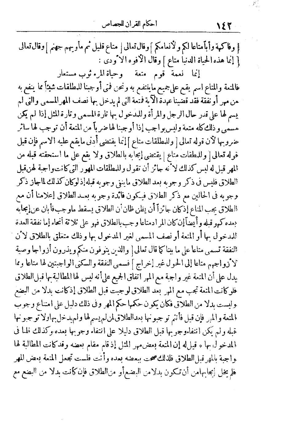 فَالْمُتْعَةُ وَالْمَتَاعُ اسْمٌ يَقَعُ عَلَى جَمِيعِ مَا يُنْتَفَعُ بِهِ وَنَحْنُ فمتى أوجبنا للمطلقات شيئا مما ينفع بِهِ مِنْ مَهْرٍ أَوْ نَفَقَةٍ فَقَدْ قَضَيْنَا عُهْدَةَ الْآيَةِ فَمُتْعَةُ الَّتِي لَمْ يُدْخَلْ بِهَا نِصْفُ الْمَهْرِ الْمُسَمَّى وَاَلَّتِي لَمْ يُسَمَّ لَهَا عَلَى قِدْرِ حَالِ الرَّجُلِ وَالْمَرْأَةِ وَلِلْمَدْخُولِ بِهَا تارة المسمى وتارة الْمِثْلِ إذَا لَمْ يَكُنْ مُسَمًّى وَذَلِكَ كُلُّهُ مُتْعَةٌ وَلَيْسَ بِوَاجِبٍ إذَا أَوْجَبْنَا لَهَا ضَرْبًا من المتعة أن توجب لَهَا سَائِرَ ضُرُوبِهَا لِأَنَّ قَوْله تَعَالَى وَلِلْمُطَلَّقاتِ مَتاعٌ إنَّمَا يَقْتَضِي أَدْنَى مَا يَقَعُ عَلَيْهِ الِاسْمُ فإن قيل قوله تعالى وَلِلْمُطَلَّقاتِ مَتاعٌ يَقْتَضِي إيجَابَهُ بِالطَّلَاقِ وَلَا يَقَعُ عَلَى مَا اسْتَحَقَّتْهُ قَبْلَهُ مِنْ الْمَهْرِ قِيلَ لَهُ لَيْسَ كَذَلِكَ لِأَنَّهُ جَائِزٌ أَنْ تَقُولَ وَلِلْمُطْلَقَاتِ الْمُهُورُ الَّتِي كَانَتْ وَاجِبَةً لَهُنَّ قَبْلَ الطَّلَاقِ فَلَيْسَ فِي ذِكْرِ وُجُوبِهِ بَعْدَ الطَّلَاقِ مَا يَنْفِي وُجُوبَهُ قَبْلَهُ إذْ لَوْ كَانَ كَذَلِكَ لَمَا جَازَ ذِكْرُ وُجُوبِهِ فِي الْحَالَيْنِ مَعَ ذِكْرِ الطَّلَاقِ فَيَكُونُ فَائِدَةُ وُجُوبِهِ بَعْدَ الطَّلَاقِ إعْلَامَنَا أَنَّ مَعَ الطَّلَاقِ يَجِبُ الْمَتَاعُ إذْ كَانَ جَائِزًا أَنْ يَظُنَّ ظَانٌّ أَنَّ الطَّلَاقَ يُسْقِطُ مَا وَجَبَ فَأَبَانَ عَنْ إيجَابِهِ بَعْدَهُ كَهُوَ قَبْلَهُ وَأَيْضًا إنْ كَانَ الْمُرَادُ مَتَاعًا وَجَبَ بِالطَّلَاقِ فَهُوَ عَلَى ثَلَاثَةِ أَنْحَاءٍ إمَّا نَفَقَةُ الْعِدَّةِ لِلْمَدْخُولِ بِهَا أَوْ الْمُتْعَةُ أَوْ نِصْفُ الْمُسَمَّى لِغَيْرِ الْمَدْخُولِ بِهَا وَذَلِكَ مُتَعَلِّقٌ بِالطَّلَاقِ لِأَنَّ النَّفَقَةَ تُسَمَّى مَتَاعًا عَلَى مَا بَيَّنَّا كَمَا قَالَ تَعَالَى وَالَّذِينَ يُتَوَفَّوْنَ مِنْكُمْ وَيَذَرُونَ أَزْواجاً وَصِيَّةً لِأَزْواجِهِمْ مَتاعاً إِلَى الْحَوْلِ غَيْرَ إِخْراجٍ