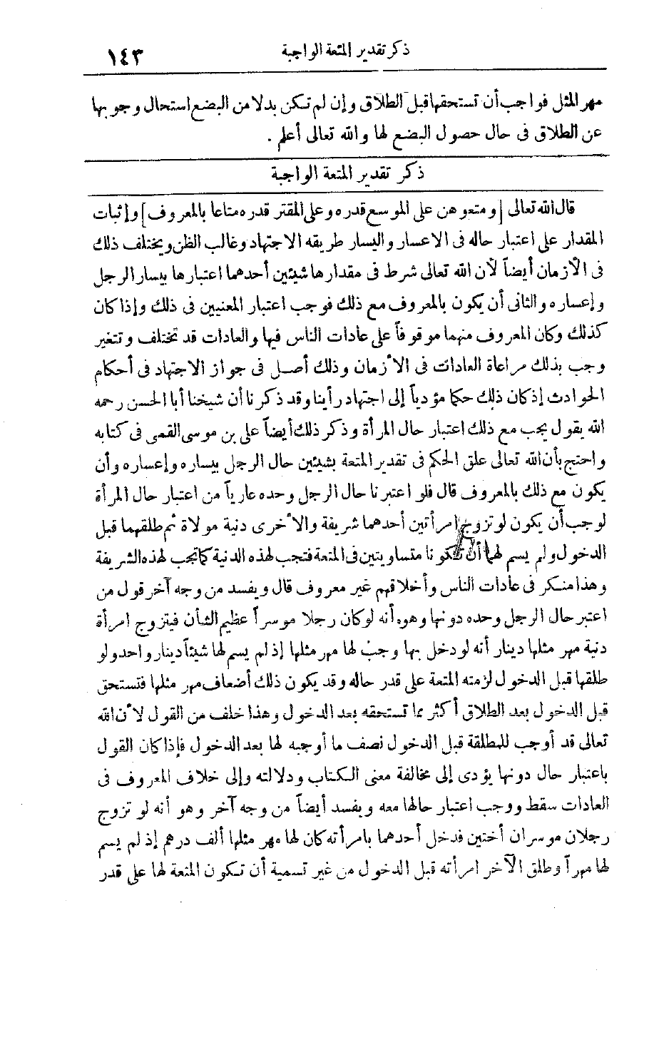 قَالَ اللَّهُ تَعَالَى وَمَتِّعُوهُنَّ عَلَى الْمُوسِعِ قَدَرُهُ وَعَلَى الْمُقْتِرِ قَدَرُهُ مَتاعاً بِالْمَعْرُوفِ وَإِثْبَاتُ الْمِقْدَارِ عَلَى اعْتِبَارِ حَالِهِ فِي الْإِعْسَارِ وَالْيَسَارِ طَرِيقُهُ الِاجْتِهَادِ وَغَالِبُ الظَّنِّ وَيَخْتَلِفُ ذَلِكَ فِي الْأَزْمَانِ أَيْضًا لِأَنَّ اللَّهَ تَعَالَى شَرَطَ فِي مِقْدَارِهَا شَيْئَيْنِ أَحَدُهُمَا اعْتِبَارُهَا بِيَسَارِ الرَّجُلِ وَإِعْسَارِهِ وَالثَّانِي أَنْ يَكُونَ بِالْمَعْرُوفِ مَعَ ذَلِكَ فوجب اعتبار المعنيين في ذلك وإذا كَانَ كَذَلِكَ وَكَانَ الْمَعْرُوفُ مِنْهُمَا مَوْقُوفًا عَلَى عَادَاتِ النَّاسِ فِيهَا وَالْعَادَاتُ قَدْ تَخْتَلِفُ وَتَتَغَيَّرُ وَجَبَ بِذَلِكَ مُرَاعَاةُ الْعَادَاتِ فِي الْأَزْمَانِ وَذَلِكَ أَصْلٌ فِي جَوَازِ الِاجْتِهَادِ فِي أَحْكَامِ الْحَوَادِثِ إذْ كَانَ ذَلِكَ حُكْمًا مُؤَدِّيًا إلَى اجْتِهَادٍ رَأَيْنَا وَقَدْ ذَكَرْنَا أَنَّ شَيْخَنَا أَبَا الْحَسَنِ رَحِمَهُ اللَّهُ يَقُولُ يَجِبُ مَعَ ذَلِكَ اعْتِبَارُ حال المرأة وَذَكَرَ ذَلِكَ أَيْضًا عَلِيُّ بْنُ مُوسَى الْقُمِّيُّ فِي كِتَابِهِ وَاحْتَجَّ بِأَنَّ اللَّهَ تَعَالَى عَلَّقَ الْحُكْمَ فِي تَقْدِيرِ الْمُتْعَةِ بِشَيْئَيْنِ حَالِ الرَّجُلِ بِيَسَارِهِ وَإِعْسَارِهِ وَأَنْ يَكُونَ مَعَ ذَلِكَ بِالْمَعْرُوفِ قَالَ فَلَوْ اعْتَبَرْنَا حَالَ الرَّجُلِ وَحْدَهُ عَارِيًّا مِنْ اعْتِبَارِ حَالِ الْمَرْأَةِ لَوَجَبَ أَنْ يَكُونَ لو تزوج امرأتين أحدهما شَرِيفَةٌ وَالْأُخْرَى دَنِيَّةٌ مَوْلَاةٌ ثُمَّ طَلَّقَهُمَا قَبْلَ الدُّخُولِ وَلَمْ يُسَمِّ لَهُمَا أَنْ تَكُونَا مُتَسَاوِيَتَيْنِ فِي الْمُتْعَةِ فَتَجِبُ لِهَذِهِ الدَّنِيَّةِ كَمَا تَجِبُ لِهَذِهِ الشَّرِيفَةِ وَهَذَا مُنْكَرٌ فِي عَادَاتِ النَّاسِ وَأَخْلَاقِهِمْ غَيْرُ مَعْرُوفٍ قَالَ وَيَفْسُدُ مِنْ وَجْهٍ آخَرَ قَوْلُ مَنْ اعْتَبَرَ حَالَ الرَّجُلِ وَحْدَهُ دُونَهَا وَهُوَ أَنَّهُ لَوْ كَانَ رَجُلًا مُوسِرًا عظيم الشأن فيتزوج امْرَأَةً دَنِيَّةً مَهْرُ مِثْلِهَا دِينَارٌ أَنَّهُ لَوْ دَخَلَ بِهَا وَجَبَ لَهَا مَهْرُ مِثْلِهَا إذْ لَمْ يُسَمِّ لَهَا شَيْئًا دِينَارٌ وَاحِدٌ وَلَوْ طَلَّقَهَا قَبْلَ الدُّخُولِ لَزِمَتْهُ الْمُتْعَةُ عَلَى قَدْرِ حَالِهِ وَقَدْ يَكُونُ ذَلِكَ أَضْعَافُ مَهْرِ مِثْلِهَا فَتَسْتَحِقُّ قَبْلَ الدُّخُولِ بَعْدَ الطَّلَاقِ أَكْثَرَ مِمَّا تَسْتَحِقُّهُ بَعْدَ الدُّخُولِ وَهَذَا خُلْفٌ مِنْ الْقَوْلِ لِأَنَّ اللَّهَ تَعَالَى قَدْ أَوْجَبَ لِلْمُطْلَقَةِ قَبْلَ الدُّخُولِ نِصْفَ مَا أَوْجَبَهُ لَهَا بَعْدَ الدُّخُولِ فإذا كان القول باعتبار حال دُونَهَا يُؤَدِّي إلَى مُخَالَفَةِ مَعْنَى الْكِتَابِ وَدَلَالَتِهِ وَإِلَى خِلَافِ الْمَعْرُوفِ فِي الْعَادَاتِ سَقَطَ وَوَجَبَ اعْتِبَارُ حَالِهَا مَعَهُ وَيَفْسُدُ أَيْضًا مِنْ وَجْهٍ آخَرَ وَهُوَ أَنَّهُ لَوْ تَزَوَّجَ رَجُلَانِ مُوسِرَانِ أُخْتَيْنِ فَدَخَلَ أَحَدُهُمَا بِامْرَأَتِهِ كَانَ لَهَا مَهْرُ مِثْلِهَا أَلْفُ دِرْهَمٍ إذْ لَمْ يُسَمِّ لَهَا مَهْرًا وَطَلَّقَ الْآخَرُ امْرَأَتَهُ قَبْلَ الدُّخُولِ مِنْ غَيْرِ تَسْمِيَةٍ أَنْ تَكُونَ الْمُتْعَةُ لَهَا عَلَى قدر