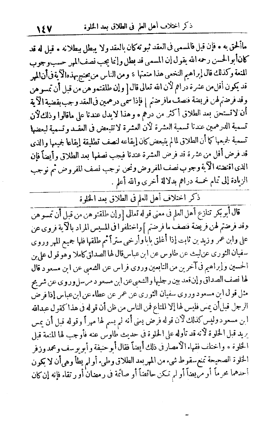 وَإِبْرَاهِيمَ فِي آخَرِينَ مِنْ التَّابِعِينَ وَرَوَى فِرَاسٌ عَنْ الشَّعْبِيِّ عَنْ ابْنِ مَسْعُودٍ قَالَ لَهَا نِصْفُ الصَّدَاقِ وَإِنْ قَعَدَ بَيْنَ رِجْلَيْهَا وَالشَّعْبِيُّ عَنْ ابْنِ مَسْعُودٍ مُرْسَلٌ وَرُوِيَ عَنْ شُرَيْحٍ مِثْل قَوْلِ ابْنِ مَسْعُودٍ وَرَوَى سُفْيَانُ الثَّوْرِيِّ عَنْ عُمَرَ عَنْ عَطَاءٍ عَنْ ابْنِ عَبَّاسٍ إذَا فَرَضَ الرَّجُلُ قَبْلَ أَنْ يَمَسَّ فَلَيْسَ لَهَا إلَّا الْمَتَاعُ فَمِنْ النَّاسِ مَنْ ظَنَّ أَنَّ قوله في هذا كقول عبد الله ابن مَسْعُودٍ وَلَيْسَ كَذَلِكَ لِأَنَّ قَوْلَهُ فَرَضَ يَعْنِي أَنَّهُ لَمْ يُسَمِّ لَهَا مَهْرًا وَقَوْلَهُ قَبْلَ أَنْ يَمَسَّ يُرِيدُ قَبْلَ الْخَلْوَةِ لِأَنَّهُ قَدْ تَأَوَّلَهُ عَلَى الْخَلْوَةِ فِي حَدِيثِ طَاوُسٍ عَنْهُ فَأَوْجَبَ لَهَا الْمُتْعَةَ قَبْلَ الْخَلْوَةِ وَاخْتَلَفَ فُقَهَاءُ الْأَمْصَارِ فِي ذَلِكَ أَيْضًا فَقَالَ أَبُو حَنِيفَةَ وَأَبُو يُوسُفَ وَمُحَمَّدٌ وَزُفَرٌ الْخَلْوَةُ الصَّحِيحَةُ تَمْنَعُ سُقُوطَ شَيْءٍ مِنْ الْمَهْرِ بَعْدَ الطَّلَاقِ وَطِئَ أَوْ لَمْ يَطَأْ وَهِيَ أَنْ لَا يَكُونَ أَحَدُهُمَا مُحْرِمًا أَوْ مَرِيضًا أَوْ لَمْ تَكُنْ حَائِضًا أَوْ صَائِمَةً فِي رَمَضَانَ أَوْ رَتْقَاءَ فَإِنَّهُ إنْ كَانَ
