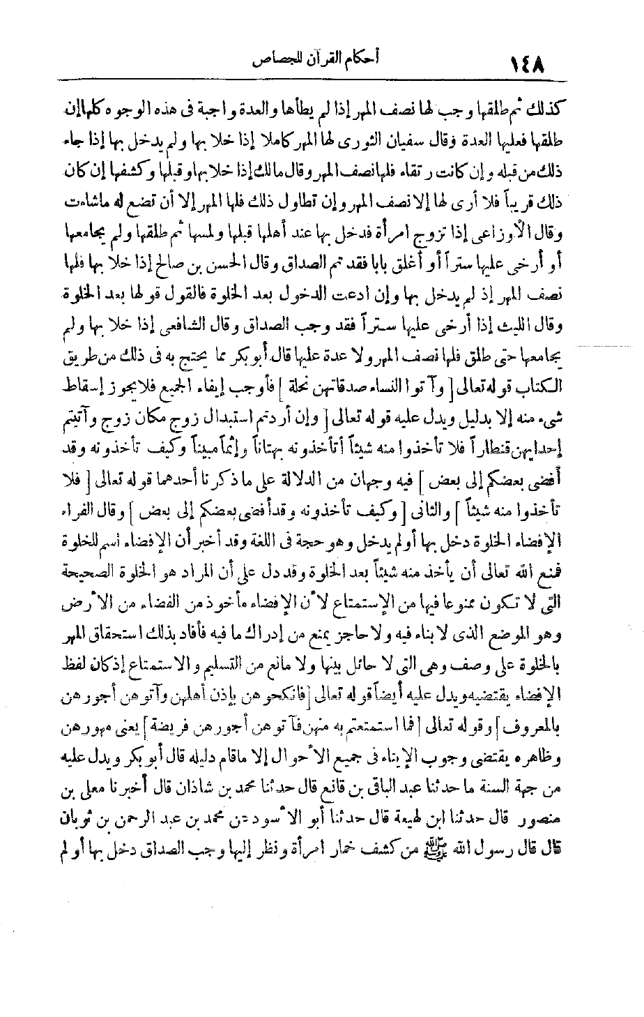 كَذَلِكَ ثُمَّ طَلَّقَهَا وَجَبَ لَهَا نِصْفُ الْمَهْرِ إذَا لَمْ يَطَأْهَا وَالْعِدَّةُ وَاجِبَةٌ فِي هَذِهِ الْوُجُوهِ كُلِّهَا إنْ طَلَّقَهَا فَعَلَيْهَا الْعِدَّةُ وَقَالَ سُفْيَانُ الثَّوْرِيّ لَهَا الْمَهْرُ كَامِلًا إذَا خَلَا بِهَا وَلَمْ يَدْخُلْ بِهَا إذَا جَاءَ ذَلِكَ مِنْ قِبَلِهِ وَإِنْ كَانَتْ رَتْقَاءَ فَلَهَا نِصْفُ الْمَهْرِ وَقَالَ مَالِكٌ إذَا خَلَا بِهَا وَقَبَّلَهَا وَكَشَفَهَا إنْ كَانَ ذَلِكَ قَرِيبًا فَلَا أَرَى لَهَا إلَّا نِصْفَ الْمَهْرِ وَإِنْ تَطَاوَلَ ذَلِكَ فَلَهَا الْمَهْرُ إلَّا أَنْ تَضَعَ لَهُ مَا شَاءَتْ وَقَالَ الْأَوْزَاعِيُّ إذَا تَزَوَّجَ امْرَأَةً فَدَخَلَ بِهَا عِنْدَ أَهْلِهَا قَبَّلَهَا وَلَمَسَهَا ثُمَّ طَلَّقَهَا وَلَمْ يُجَامِعْهَا أَوْ أَرْخَى عَلَيْهَا سِتْرًا أَوْ أَغْلَقَ بَابًا فَقَدْ تَمَّ الصَّدَاقُ وَقَالَ الْحَسَنُ بْنُ صَالِحٍ إذَا خَلَا بِهَا فَلَهَا نِصْفُ الْمَهْرِ إذْ لَمْ يَدْخُلْ بِهَا وَإِنْ ادَّعَتْ الدُّخُولَ بَعْدَ الْخَلْوَةِ فَالْقَوْلُ قَوْلُهَا بَعْدَ الْخَلْوَةِ وَقَالَ اللَّيْثُ إذَا أَرْخَى عَلَيْهَا سِتْرًا فَقَدْ وَجَبَ الصَّدَاقُ وَقَالَ الشَّافِعِيُّ إذَا خَلَا بِهَا وَلَمْ يُجَامِعْهَا حَتَّى طَلَّقَ فَلَهَا نِصْفُ الْمَهْرِ وَلَا عِدَّةَ عَلَيْهَا قَالَ أَبُو بَكْرٍ مِمَّا يُحْتَجُّ بِهِ فِي ذَلِكَ مِنْ طَرِيقِ الْكِتَابِ قوله تعالى وَآتُوا النِّساءَ صَدُقاتِهِنَّ نِحْلَةً فَأَوْجَبَ إيفَاءَ الْجَمِيعِ فَلَا يَجُوزُ إسْقَاطُ شَيْءٍ مِنْهُ إلَّا بِدَلِيلٍ وَيَدُلُّ عَلَيْهِ قَوْله تَعَالَى وَإِنْ أَرَدْتُمُ اسْتِبْدالَ زَوْجٍ مَكانَ زَوْجٍ وَآتَيْتُمْ إِحْداهُنَّ قِنْطاراً فَلا تَأْخُذُوا مِنْهُ شَيْئاً أَتَأْخُذُونَهُ بُهْتاناً وَإِثْماً مُبِيناً وَكَيْفَ تَأْخُذُونَهُ وَقَدْ أَفْضى بَعْضُكُمْ إِلى بَعْضٍ فِيهِ وَجْهَانِ مِنْ الدَّلَالَةِ عَلَى مَا ذَكَرْنَا أَحَدُهُمَا قَوْله تَعَالَى فَلا تَأْخُذُوا مِنْهُ شَيْئاً وَالثَّانِي وَكَيْفَ تَأْخُذُونَهُ وَقَدْ أَفْضى بَعْضُكُمْ إِلى بَعْضٍ وَقَالَ الْفَرَّاءُ الْإِفْضَاءُ الْخَلْوَةُ دَخَلَ بِهَا أَوْ لَمْ يَدْخُلْ وَهُوَ حُجَّةٌ فِي اللُّغَةِ وَقَدْ أَخْبَرَ أَنَّ الْإِفْضَاءَ اسْمٌ لِلْخَلْوَةِ فَمَنَعَ اللَّهُ تَعَالَى أَنْ يَأْخُذَ مِنْهُ شَيْئًا بَعْدَ الْخَلْوَةِ وَقَدْ دَلَّ عَلَى أَنَّ الْمُرَادَ هُوَ الْخَلْوَةُ الصَّحِيحَةُ الَّتِي لَا تَكُونُ مَمْنُوعًا فِيهَا مِنْ الِاسْتِمْتَاعِ لِأَنَّ الْإِفْضَاءَ مَأْخُوذٌ مِنْ الْفَضَاءِ مِنْ الْأَرْضِ وَهُوَ الْمَوْضِعُ الَّذِي لَا بِنَاءَ فِيهِ وَلَا حَاجِزَ يَمْنَعُ مِنْ إدْرَاكِ مَا فِيهِ فَأَفَادَ بِذَلِكَ اسْتِحْقَاقَ الْمَهْرِ بِالْخَلْوَةِ عَلَى وَصْفٍ وهي التي لا حائل بينها وَلَا مَانِعَ مِنْ التَّسْلِيمِ وَالِاسْتِمْتَاعِ إذْ كَانَ لَفْظُ الْإِفْضَاءِ يَقْتَضِيهِ وَيَدُلُّ عَلَيْهِ أَيْضًا قَوْله تَعَالَى فَانْكِحُوهُنَّ بِإِذْنِ أَهْلِهِنَّ وَآتُوهُنَّ أُجُورَهُنَّ بِالْمَعْرُوفِ وقَوْله تَعَالَى فَمَا اسْتَمْتَعْتُمْ بِهِ مِنْهُنَّ فَآتُوهُنَّ أُجُورَهُنَّ فَرِيضَةً يَعْنِي مُهُورَهُنَّ وَظَاهِرُهُ يَقْتَضِي وُجُوبَ الْإِيتَاءِ فِي جَمِيعِ الْأَحْوَالِ إلَّا مَا قَامَ دَلِيلُهُ قَالَ أَبُو بَكْرٍ وَيَدُلُّ عَلَيْهِ مِنْ جِهَةِ السُّنَّةِ ما