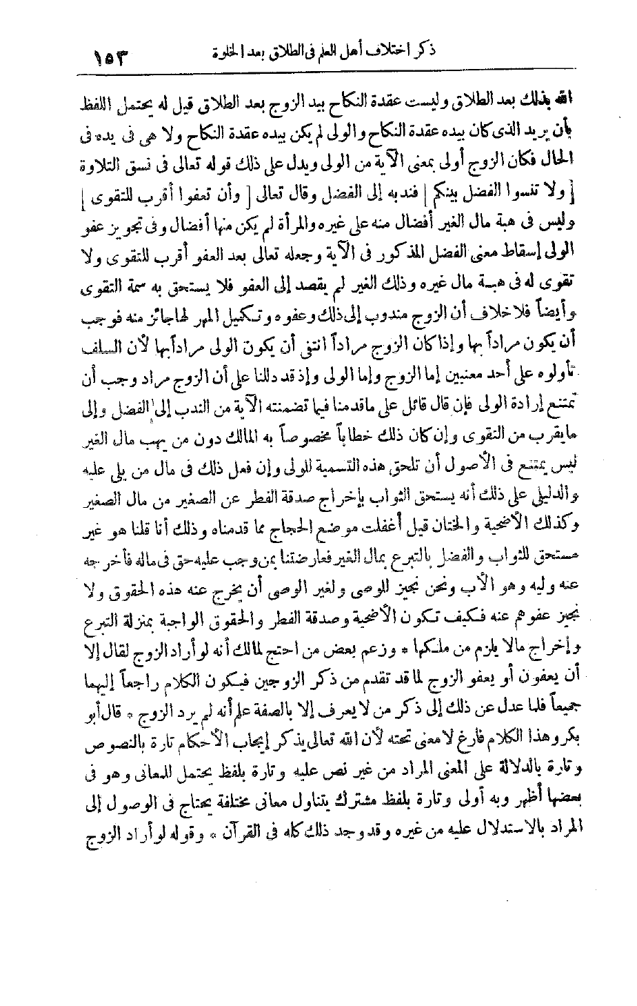 اللَّهُ بِذَلِكَ بَعْدَ الطَّلَاقِ وَلَيْسَتْ عُقْدَةُ النِّكَاحِ بِيَدِ الزَّوْجِ بَعْدَ الطَّلَاقِ قِيلَ لَهُ يَحْتَمِلُ اللَّفْظُ بِأَنْ يُرِيدَ الَّذِي كَانَ بِيَدِهِ عُقْدَةُ النِّكَاحِ وَالْوَلِيُّ لَمْ يَكُنْ بِيَدِهِ عُقْدَةُ النِّكَاحِ وَلَا هِيَ فِي يَدِهِ فِي الْحَالِ فَكَانَ الزَّوْجُ أَوْلَى بِمَعْنَى الْآيَةِ مِنْ الْوَلِيِّ وَيَدُلُّ عَلَى ذَلِكَ قَوْله تَعَالَى فِي نَسَقِ التِّلَاوَةِ وَلا تَنْسَوُا الْفَضْلَ بَيْنَكُمْ فَنَدَبَهُ إلَى الْفَضْلِ وَقَالَ تَعَالَى وَأَنْ تَعْفُوا أَقْرَبُ لِلتَّقْوى وَلَيْسَ فِي هِبَةِ مَالِ الْغَيْرِ إفْضَالٌ مِنْهُ عَلَى غَيْرِهِ وَالْمَرْأَةُ لَمْ يَكُنْ مِنْهَا إفْضَالٌ وَفِي تَجْوِيزِ عَفْوِ الْوَلِيِّ إسْقَاطُ مَعْنَى الْفَضْلِ الْمَذْكُورِ فِي الْآيَة وَجَعَلَهُ تَعَالَى بَعْد الْعَفْوِ أَقْرَبَ لِلتَّقْوَى وَلَا تَقْوَى لَهُ فِي هِبَةِ مَالِ غَيْرِهِ وَذَلِكَ الْغَيْرُ لَمْ يَقْصِدْ إلَى الْعَفْوِ فَلَا يَسْتَحِقُّ بِهِ سِمَةَ التَّقْوَى وَأَيْضًا فَلَا خِلَافَ أَنَّ الزَّوْجَ مَنْدُوبٌ إلَى ذَلِكَ وَعَفْوُهُ وَتَكْمِيلُ الْمَهْرِ لَهَا جَائِزٌ مِنْهُ فَوَجَبَ أَنْ يَكُونَ مُرَادًا بِهَا وَإِذَا كَانَ الزَّوْجُ مُرَادًا انْتَفَى أَنْ يَكُونَ الْوَلِيُّ مُرَادًا بِهَا لِأَنَّ السَّلَفَ تَأَوَّلُوهُ عَلَى أَحَدِ مَعْنَيَيْنِ إمَّا الزَّوْجِ وَإِمَّا الْوَلِيِّ وَإِذْ قَدْ دَلَّلْنَا عَلَى أَنَّ الزَّوْجَ مُرَادٌ وَجَبَ أَنْ تَمْتَنِعَ إرَادَةُ الْوَلِيِّ فَإِنْ قَالَ قَائِلٌ عَلَى مَا قَدَّمْنَا فِيمَا تَضَمَّنَتْهُ الْآيَةُ مِنْ النَّدْبِ إلَى الْفَضْلِ وَإِلَى مَا يَقْرُبُ مِنْ التَّقْوَى وَإِنْ كَانَ ذَلِكَ خِطَابًا مَخْصُوصًا بِهِ الْمَالِكُ دُونُ مَنْ يَهَبُ مَالَ الْغَيْرِ لَيْسَ يَمْتَنِعُ فِي الْأُصُولِ أَنْ تَلْحَقَ هَذِهِ التَّسْمِيَةُ لِلْوَلِيِّ وَإِنْ فَعَلَ ذلك في مال من يلي عليه والدليلى عَلَى ذَلِكَ أَنَّهُ يَسْتَحِقُّ الثَّوَابَ بِإِخْرَاجِ صَدَقَةِ الْفِطْرِ عَنْ الصَّغِيرِ مِنْ مَالِ الصَّغِيرِ وَكَذَلِكَ الْأُضْحِيَّةُ وَالْخِتَانُ قِيلَ أَغْفَلْت مَوْضِعَ الْحِجَاجِ مِمَّا قَدَّمْنَاهُ وَذَلِكَ أَنَّا قُلْنَا هُوَ غَيْرُ مُسْتَحِقٍّ لِلثَّوَابِ وَالْفَضْلِ بِالتَّبَرُّعِ بِمَالِ الْغَيْرِ فَعَارَضْتنَا بِمَنْ وَجَبَ عَلَيْهِ حَقٌّ فِي مَالِهِ فَأَخْرَجَهُ عَنْهُ وليه وَهُوَ الْأَبُ وَنَحْنُ نُجِيزُ لِلْوَصِيِّ وَلِغَيْرِ الْوَصِيِّ أَنْ يُخْرِجَ عَنْهُ هَذِهِ الْحُقُوقَ وَلَا نُجِيزُ عَفْوَهُمْ عَنْهُ فَكَيْفَ تَكُونُ الْأُضْحِيَّةُ وَصَدَقَةُ الْفِطْرِ وَالْحُقُوقُ الْوَاجِبَةُ بِمَنْزِلَةِ التَّبَرُّعِ وَإِخْرَاجِ مَا لَا يَلْزَمُ مِنْ مِلْكِهَا وَزَعَمَ بَعْضُ مَنْ احْتَجَّ لمالك أنه أَرَادَ الزَّوْجَ لَقَالَ إلَّا أَنْ يَعْفُونَ أَوْ يَعْفُوَ الزَّوْجُ لِمَا قَدْ تَقَدَّمَ مِنْ ذِكْرِ الزَّوْجَيْنِ فَيَكُونُ الْكَلَامُ رَاجِعًا إلَيْهِمَا جَمِيعًا فَلَمَّا عَدَلَ عَنْ ذَلِكَ إلَى ذِكْرِ مَنْ لَا يُعْرَفُ إلَّا بِالصِّفَةِ عُلِمَ أَنَّهُ لَمْ يُرِدْ الزَّوْجَ قَالَ أَبُو بَكْرٍ وَهَذَا الْكَلَامُ فَارِغٌ لَا مَعْنَى تَحْتَهُ لِأَنَّ اللَّهَ تَعَالَى يَذْكُرُ إيجَابَ الْأَحْكَامِ تَارَةً بِالنُّصُوصِ وَتَارَةً بِالدَّلَالَةِ عَلَى الْمَعْنَى الْمُرَادِ مِنْ غَيْرِ نَصٍّ عَلَيْهِ وَتَارَةً بِلَفْظٍ يَحْتَمِلُ لِلْمَعَانِي وَهُوَ فِي بَعْضِهَا أَظْهَرُ وَبِهِ أَوْلَى وَتَارَةً بِلَفْظٍ مُشْتَرَكٍ يَتَنَاوَلُ مَعَانِيَ مُخْتَلِفَةً يُحْتَاجُ فِي الْوُصُولِ إلَى الْمُرَادِ بِالِاسْتِدْلَالِ عَلَيْهِ مِنْ غَيْرِهِ وَقَدْ وُجِدَ ذَلِكَ كُلُّهُ فِي الْقُرْآنِ وَقَو