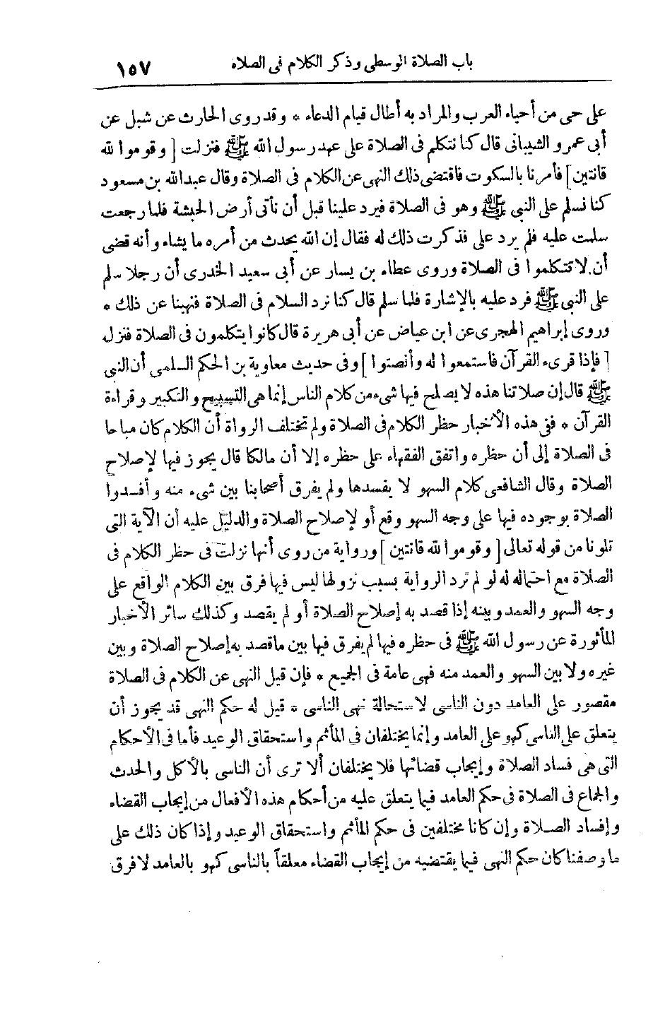فَفِي هَذِهِ الْأَخْبَارِ حَظْرُ الْكَلَامِ فِي الصَّلَاةِ وَلَمْ تَخْتَلِفْ الرُّوَاةُ أَنَّ الْكَلَامَ كَانَ مُبَاحًا فِي الصَّلَاةِ إلَى أَنْ حَظَرَهُ وَاتَّفَقَ الْفُقَهَاءُ عَلَى حَظْرِهِ إلَّا أَنَّ مَالِكًا قَالَ يَجُوزُ فِيهَا لِإِصْلَاحِ الصَّلَاةِ وَقَالَ الشَّافِعِيُّ كَلَامُ السَّهْوِ لَا يُفْسِدُهَا وَلَمْ يُفَرِّقْ أَصْحَابُنَا بَيْنَ شَيْءٍ مِنْهُ وَأَفْسَدُوا الصَّلَاةَ بِوُجُودِهِ فِيهَا عَلَى وَجْهِ السَّهْوِ وَقَعَ أَوْ لِإِصْلَاحِ الصَّلَاةِ وَالدَّلِيلُ عَلَيْهِ أَنَّ الْآيَةَ الَّتِي تَلَوْنَا مِنْ قَوْله تعالى وَقُومُوا لِلَّهِ قانِتِينَ وَرِوَايَةُ مَنْ رَوَى أَنَّهَا نَزَلَتْ فِي حَظْرِ الْكَلَامِ فِي الصَّلَاةِ مَعَ احْتِمَالِهِ لَهُ لَوْ لَمْ تَرِدْ الرِّوَايَةُ بِسَبَبِ نُزُولهَا لَيْسَ فِيهَا فَرْقٌ بَيْنَ الْكَلَام الْوَاقِعِ عَلَى وَجْهِ السَّهْوِ وَالْعَمْدِ وَبَيْنَهُ إذَا قُصِدَ بِهِ إصْلَاحُ الصَّلَاةِ أَوْ لَمْ يُقْصَدْ وَكَذَلِكَ سَائِرُ الْأَخْبَارِ الْمَأْثُورَةِ عَنْ رَسُولِ اللَّهِ صَلَّى اللَّهُ عَلَيْهِ وَسَلَّمَ فِي حَظْرِهِ فِيهَا لَمْ يُفَرِّقْ فِيهَا بَيْنَ مَا قُصِدَ بِهِ إصْلَاحُ الصَّلَاةِ وَبَيْنَ غَيْرِهِ وَلَا بَيْنَ السَّهْوِ وَالْعَمْدِ مِنْهُ فَهِيَ عَامَّةٌ فِي الْجَمِيعِ فَإِنْ قِيلَ النَّهْيُ عَنْ الْكَلَامِ فِي الصَّلَاةِ مَقْصُورٌ عَلَى الْعَامِدِ دُونَ النَّاسِي لِاسْتِحَالَةِ نَهْيِ النَّاسِي قِيلَ لَهُ حُكْمُ النَّهْيِ قَدْ يَجُوزُ أَنْ يَتَعَلَّقَ عَلَى النَّاسِي كَهُوَ عَلَى الْعَامِدِ وَإِنَّمَا يَخْتَلِفَانِ فِي الْمَأْثَمِ وَاسْتِحْقَاقِ الْوَعِيدِ فَأَمَّا فِي الْأَحْكَامِ الَّتِي هِيَ فَسَادُ الصَّلَاةِ وَإِيجَابُ قَضَائِهَا فَلَا يَخْتَلِفَانِ أَلَا تَرَى أَنَّ النَّاسِيَ بِالْأَكْلِ وَالْحَدَثِ وَالْجِمَاعِ فِي الصَّلَاةِ فِي حُكْمِ الْعَامِدِ فِيمَا يَتَعَلَّقُ عَلَيْهِ مِنْ أَحْكَامِ هَذِهِ الْأَفْعَالِ مِنْ إيجَابِ الْقَضَاءِ وَإِفْسَادِ الصَّلَاةِ وَإِنْ كَانَا مُخْتَلِفَيْنِ فِي حُكْمِ الْمَأْثَمِ وَاسْتِحْقَاقِ الْوَعِيدِ وَإِذَا كَانَ ذَلِكَ عَلَى مَا وَصَفْنَا كَانَ حُكْمُ النَّهْيِ فِيمَا يَقْتَضِيهِ مِنْ إيجَابِ الْقَضَاءِ مُعَلَّقًا بِالنَّاسِي كَهُوَ بِالْعَامِدِ لَا فرق