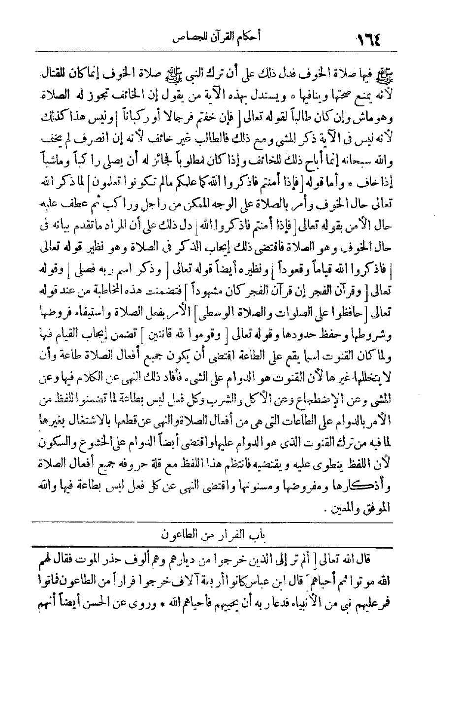 صَلَّى اللَّهُ عَلَيْهِ وَسَلَّمَ فِيهَا صَلَاةَ الْخَوْفِ فَدَلَّ ذَلِكَ عَلَى أَنَّ تَرْكَ النَّبِيِّ صَلَّى اللَّهُ عَلَيْهِ وَسَلَّمَ صَلَاةَ الْخَوْفِ إنَّمَا كَانَ لِلْقِتَالِ لِأَنَّهُ يَمْنَعُ صِحَّتَهَا وَيُنَافِيهَا وَيَسْتَدِلُّ بِهَذِهِ الْآيَةِ مَنْ يَقُولُ إنَّ الْخَائِفَ تَجُوزُ لَهُ الصَّلَاةُ وَهُوَ مَاشٍ وَإِنْ كَانَ طَالِبًا لِقَوْلِهِ تعالى فَإِنْ خِفْتُمْ فَرِجالًا أَوْ رُكْباناً وَلَيْسَ هَذَا كَذَلِكَ لِأَنَّهُ لَيْسَ فِي الْآيَةِ ذِكْرُ الْمَشْيِ وَمَعَ ذَلِكَ فَالطَّالِبُ غَيْرُ خَائِفٍ لِأَنَّهُ إنْ انْصَرَفَ لَمْ يَخَفْ وَاَللَّهُ سُبْحَانَهُ إنَّمَا أَبَاحَ ذَلِكَ لِلْخَائِفِ وَإِذَا كَانَ مَطْلُوبًا فَجَائِزٌ لَهُ أَنْ يُصَلِّيَ رَاكِبًا وَمَاشِيًا إذَا خاف وأما قوله فَإِذا أَمِنْتُمْ فَاذْكُرُوا اللَّهَ كَما عَلَّمَكُمْ مَا لَمْ تَكُونُوا تَعْلَمُونَ لَمَّا ذَكَرَ اللَّهُ تَعَالَى حَالَ الْخَوْفِ وَأَمَرَ بِالصَّلَاةِ عَلَى الْوَجْهِ الْمُمْكِنِ مِنْ رَاجِلٍ وَرَاكِبٍ ثُمَّ عَطَفَ عَلَيْهِ حَالَ الْأَمْنِ بِقَوْلِهِ تَعَالَى فَإِذا أَمِنْتُمْ فَاذْكُرُوا اللَّهَ دَلَّ ذَلِكَ عَلَى أَنَّ الْمُرَادَ مَا تَقَدَّمَ بَيَانُهُ فِي حَالِ الْخَوْفِ وَهُوَ الصَّلَاةُ فَاقْتَضَى ذَلِكَ إيجَابَ الذِّكْرِ فِي الصَّلَاةِ وَهُوَ نَظِيرُ قوله تعالى فَاذْكُرُوا اللَّهَ قِياماً وَقُعُوداً وَنَظِيرُهُ أَيْضًا قَوْله تَعَالَى وَذَكَرَ اسْمَ رَبِّهِ فَصَلَّى وقَوْله تَعَالَى وَقُرْآنَ الْفَجْرِ إِنَّ قُرْآنَ الْفَجْرِ كانَ مَشْهُوداً فَتَضَمَّنَتْ هَذِهِ الْمُخَاطَبَةُ مِنْ عِنْدِ قَوْله تَعَالَى حافِظُوا عَلَى الصَّلَواتِ وَالصَّلاةِ الْوُسْطى الْأَمْرَ بِفِعْلِ الصَّلَاةِ وَاسْتِيفَاءَ فُرُوضِهَا وَشُرُوطِهَا وَحِفْظَ حدودها وقوله تعالى وَقُومُوا لِلَّهِ قانِتِينَ تَضَمَّنَ إيجَابَ الْقِيَامِ فِيهَا وَلَمَّا كَانَ الْقُنُوتُ اسْمًا يَقَعُ عَلَى الطَّاعَةِ اقْتَضَى أَنْ يَكُونَ جَمِيعُ أَفْعَالِ الصَّلَاةِ طَاعَةً وَأَنْ لَا يَتَخَلَّلهَا غَيْرُهَا لِأَنَّ الْقُنُوتَ هُوَ الدَّوَامُ عَلَى الشَّيْءِ فَأَفَادَ ذَلِكَ النَّهْيَ عَنْ الْكَلَامِ فِيهَا وَعَنْ الْمَشْيِ وَعَنْ الِاضْطِجَاعِ وَعَنْ الْأَكْلِ وَالشُّرْبِ وَكُلِّ فعل ليس بطاعة لما تضمنوا للفظ مِنْ الْأَمْرِ بِالدَّوَامِ عَلَى الطَّاعَاتِ الَّتِي هِيَ مِنْ أَفْعَالِ الصَّلَاةِ وَالنَّهْيِ عَنْ قَطْعِهَا بِالِاشْتِغَالِ بِغَيْرِهَا لِمَا فِيهِ مِنْ تَرْكِ الْقُنُوتِ الَّذِي هُوَ الدَّوَامُ عَلَيْهَا وَاقْتَضَى أَيْضًا الدَّوَامَ عَلَى الْخُشُوعِ وَالسُّكُونِ لِأَنَّ اللَّفْظَ يَنْطَوِي عَلَيْهِ وَيَقْتَضِيهِ فَانْتَظَمَ هَذَا اللَّفْظُ مَعَ قِلَّةِ حُرُوفِهِ جَمِيعَ أَفْعَالِ الصَّلَاةِ وَأَذْكَارِهَا وَمَفْرُوضِهَا وَمَسْنُونِهَا وَاقْتَضَى النَّهْيَ عَنْ كُلِّ فِعْلٍ لَيْسَ بِطَاعَةٍ فِيهَا وَاَللَّهُ الموفق والمعين.
