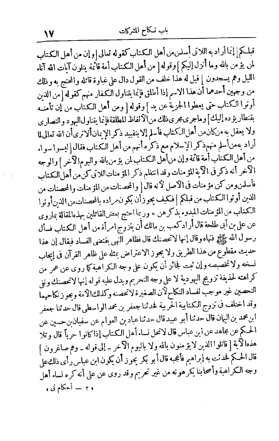 إنَّمَا أَرَادَ بِهِ اللَّاتِي أَسْلَمْنَ مِنْ أَهْلِ الْكِتَابِ كَقَوْلِهِ تَعَالَى وَإِنَّ مِنْ أَهْلِ الْكِتابِ لَمَنْ يُؤْمِنُ بِاللَّهِ وَما أُنْزِلَ إِلَيْكُمْ وقوله مِنْ أَهْلِ الْكِتابِ أُمَّةٌ قائِمَةٌ يَتْلُونَ آياتِ اللَّهِ آناءَ اللَّيْلِ وَهُمْ يَسْجُدُونَ قِيلَ لَهُ هَذَا خُلْفٌ مِنْ الْقَوْلِ دَالٌّ عَلَى غَبَاوَةِ قَائِلِهِ وَالْمُحْتَجِّ بِهِ وَذَلِكَ مِنْ وَجْهَيْنِ أَحَدُهُمَا أَنَّ هَذَا الِاسْمَ إذَا أُطْلِقَ فَإِنَّمَا يَتَنَاوَلُ الْكُفَّارَ مِنْهُمْ كَقَوْلِهِ مِنَ الَّذِينَ أُوتُوا الْكِتابَ حَتَّى يُعْطُوا الْجِزْيَةَ عَنْ يَدٍ وَقَوْلِهِ وَمِنْ أَهْلِ الْكِتابِ مَنْ إِنْ تَأْمَنْهُ بِقِنْطارٍ يُؤَدِّهِ إِلَيْكَ وَمَا جَرَى مَجْرَى ذَلِكَ مِنْ الْأَلْفَاظِ الْمُطْلَقَةِ فَإِنَّمَا يَتَنَاوَلُ الْيَهُودَ وَالنَّصَارَى وَلَا يُعْقَلُ بِهِ مَنْ كَانَ مِنْ أَهْلِ الْكِتَابِ فَأَسْلَمَ إلَّا بِتَقْيِيدِ ذِكْرِ الْإِيمَانِ أَلَا تَرَى أَنَّ اللَّهَ تَعَالَى لَمَّا أَرَادَ بِهِ مَنْ أَسْلَمَ مِنْهُمْ ذَكَرَ الْإِسْلَامَ مَعَ ذِكْرِهِ أَنَّهُمْ مِنْ أَهْلِ الْكِتَابِ فَقَالَ لَيْسُوا سَواءً مِنْ أَهْلِ الْكِتابِ أُمَّةٌ قائِمَةٌ وَإِنَّ مِنْ أَهْلِ الْكِتابِ لَمَنْ يُؤْمِنُ بِاللَّهِ وَالْيَوْمِ الْآخِرِ وَالْوَجْهُ الْآخَرُ أَنَّهُ ذَكَرَ فِي الْآيَةِ الْمُؤْمِنَاتِ وَقَدْ انْتَظَمَ ذَكَرُ الْمُؤْمِنَاتِ اللَّاتِي كُنَّ مِنْ أَهْلِ الْكِتَابِ فَأَسْلَمْنَ وَمَنْ كُنَّ مُؤْمِنَاتٍ فِي الْأَصْل لِأَنَّهُ قَالَ وَالْمُحْصَناتُ مِنَ الْمُؤْمِناتِ وَالْمُحْصَناتُ مِنَ الَّذِينَ أُوتُوا الْكِتابَ مِنْ قَبْلِكُمْ فَكَيْفَ يَجُوزُ أَنْ يَكُونَ مُرَادُهُ بِالْمُحْصَنَاتِ مِنْ الَّذِينَ أُوتُوا الْكِتَابَ مِنْ الْمُؤْمِنَاتِ الْمَبْدُوءِ بِذِكْرِهِنَّ وَرُبَّمَا احْتَجَّ بَعْضُ الْقَائِلِينَ بِهَذِهِ الْمَقَالَةِ بِمَا