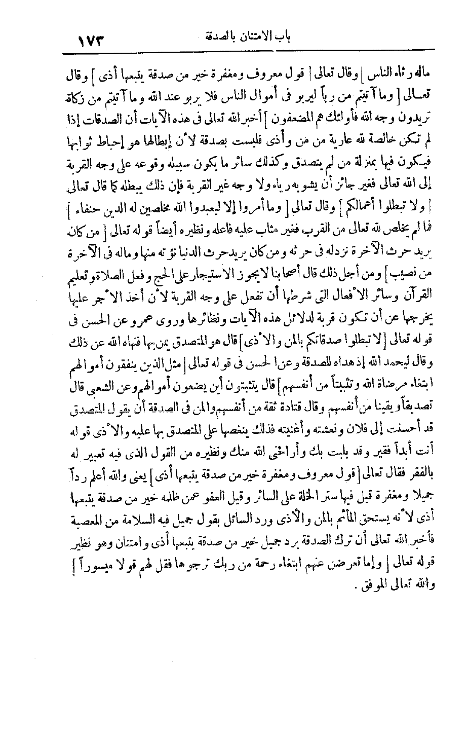 وعن الحسن في قوله تعالى مَثَلُ الَّذِينَ يُنْفِقُونَ أَمْوالَهُمُ ابْتِغاءَ مَرْضاتِ اللَّهِ وَتَثْبِيتاً مِنْ أَنْفُسِهِمْ قَالَ يَتَثَبَّتُونَ أَيْنَ يَضَعُونَ أَمْوَالَهُمْ وَعَنْ الشَّعْبِيِّ قَالَ تَصْدِيقًا وَيَقِينًا مِنْ أَنْفُسِهِمْ وَقَالَ قَتَادَةُ ثِقَةً مِنْ أَنْفُسِهِمْ وَالْمَنُّ فِي الصَّدَقَةِ أَنْ يَقُولَ الْمُتَصَدِّقُ قَدْ أَحْسَنْت إلَى فُلَانٍ وَنَعَشْتُهُ وَأَغْنَيْتُهُ فَذَلِكَ يُنَغِّصُهَا عَلَى الْمُتَصَدَّقِ بِهَا عَلَيْهِ وَالْأَذَى قَوْلُهُ أَنْتَ أَبَدًا فَقِيرٌ وَقَدْ بُلِيت بك وأراخنى اللَّهُ مِنْك وَنَظِيرُهُ مِنْ الْقَوْلِ الَّذِي فِيهِ تعبير لَهُ بِالْفَقْرِ فَقَالَ تَعَالَى قَوْلٌ مَعْرُوفٌ وَمَغْفِرَةٌ خَيْرٌ مِنْ صَدَقَةٍ يَتْبَعُها أَذىً يَعْنِي وَاَللَّهُ أَعْلَمُ رَدًّا جَمِيلًا وَمَغْفِرَةً قِيلَ فيها ستر الخلة على السائر وَقِيلَ الْعَفْوُ عَمَّنْ ظَلَمَهُ خَيْرٌ مِنْ صَدَقَةٍ يَتْبَعُهَا أَذًى لِأَنَّهُ يَسْتَحِقُّ الْمَأْثَمَ بِالْمَنِّ وَالْأَذَى وَرَدِّ السَّائِلِ بِقَوْلٍ جَمِيلٍ فِيهِ السَّلَامَةُ مِنْ الْمَعْصِيَةِ فَأَخْبَرَ اللَّهُ تَعَالَى أَنَّ تَرْكَ الصَّدَقَةِ بِرَدٍّ جَمِيلٍ خَيْرٌ مِنْ صَدَقَةٍ يَتْبَعُهَا أَذًى وَامْتِنَانٌ وَهُوَ نَظِيرُ قَوْله تَعَالَى وَإِمَّا تُعْرِضَنَّ عَنْهُمُ ابْتِغاءَ رَحْمَةٍ مِنْ رَبِّكَ تَرْجُوها فَقُلْ لَهُمْ قَوْلًا مَيْسُوراً والله تعالى الموفق.