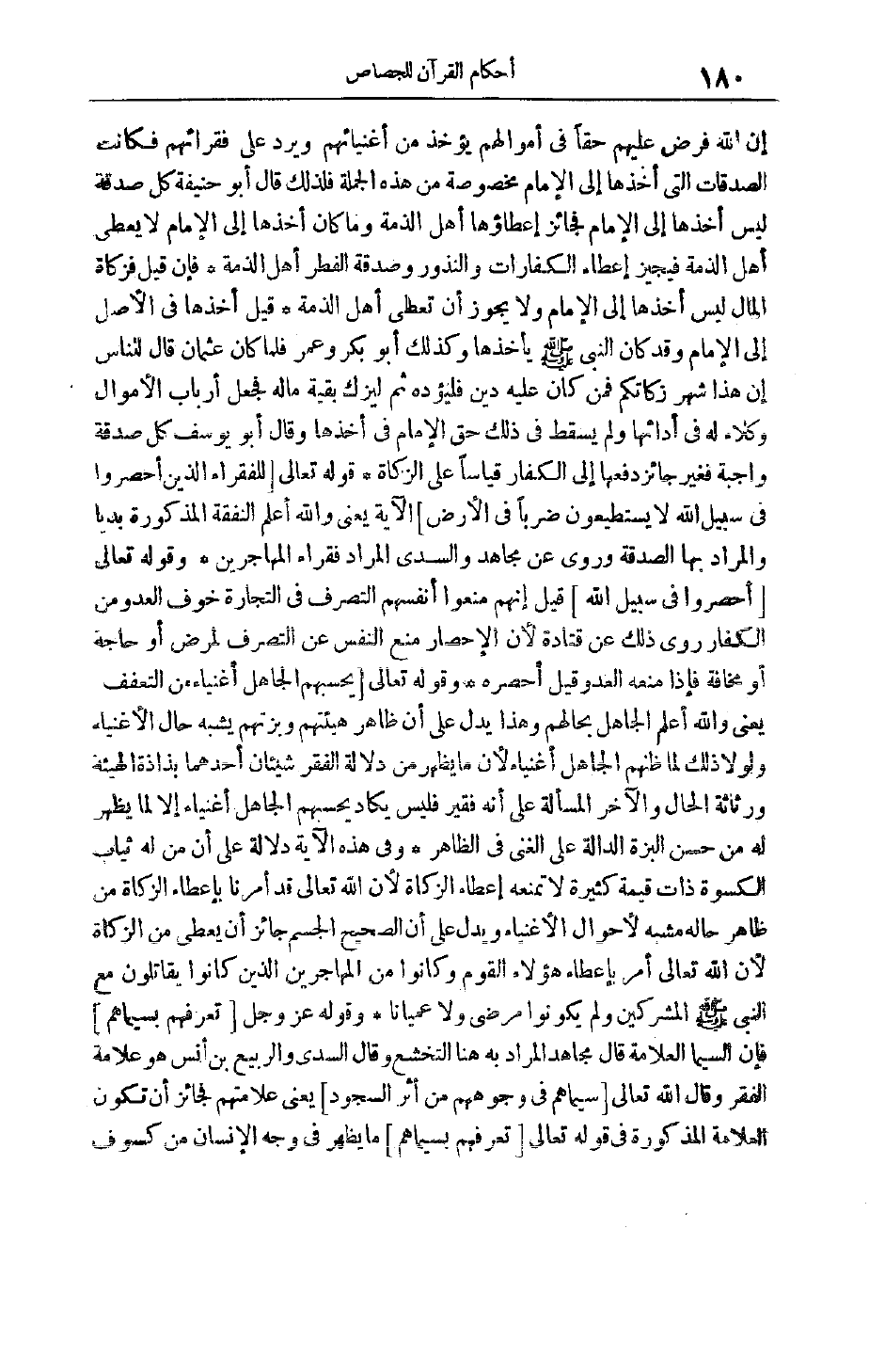 قَوْله تَعَالَى لِلْفُقَراءِ الَّذِينَ أُحْصِرُوا فِي سَبِيلِ اللَّهِ لا يَسْتَطِيعُونَ ضَرْباً فِي الْأَرْضِ الْآيَةَ يَعْنِي وَاَللَّهُ أَعْلَمُ النَّفَقَةَ الْمَذْكُورَةَ بَدِيًّا وَالْمُرَادُ بِهَا الصَّدَقَةُ وَرُوِيَ عَنْ مُجَاهِدٍ وَالسُّدِّيِّ الْمُرَادُ فُقَرَاءُ الْمُهَاجِرِينَ وقَوْله تَعَالَى أُحْصِرُوا فِي سَبِيلِ اللَّهِ قِيلَ إنَّهُمْ مَنَعُوا أَنْفُسَهُمْ التَّصَرُّفَ فِي التِّجَارَةِ خوف العدو من الكفار روى ذَلِكَ عَنْ قَتَادَةَ لِأَنَّ الْإِحْصَارَ مَنْعُ النَّفْسِ عَنْ التَّصَرُّفِ لِمَرَضٍ أَوْ حَاجَةٍ أَوْ مَخَافَةٍ فَإِذَا مَنَعَهُ الْعَدُوُّ قِيلَ أَحَصَرَهُ وقَوْله تَعَالَى يَحْسَبُهُمُ الْجاهِلُ أَغْنِياءَ مِنَ التَّعَفُّفِ يَعْنِي وَاَللَّهُ أَعْلَمُ الْجَاهِلُ بِحَالِهِمْ وَهَذَا يَدُلُّ عَلَى أَنَّ ظَاهِرَ هَيْئَتِهِمْ وَبِزَّتِهِمْ يُشْبِهُ حَالَ الْأَغْنِيَاءِ وَلَوْلَا ذَلِكَ لَمَا ظَنَّهُمْ الْجَاهِلُ أَغْنِيَاءَ لِأَنَّ مَا يَظْهَرُ مِنْ دَلَالَةِ الْفَقْرِ شَيْئَانِ أحدهما بذاذة الهيئة ورئاثة الْحَالِ وَالْآخَرُ الْمَسْأَلَةُ عَلَى أَنَّهُ فَقِيرٌ فَلَيْسَ يَكَادُ يَحْسَبُهُمْ الْجَاهِلُ أَغْنِيَاءَ إلَّا لِمَا يَظْهَرُ لَهُ مِنْ حُسْنِ الْبِزَّةِ الدَّالَّةِ عَلَى الْغِنَى فِي الظَّاهِرِ وَفِي هَذِهِ الْآيَةِ دَلَالَةٌ عَلَى أَنَّ مَنْ لَهُ ثِيَابُ الْكِسْوَةِ ذَاتُ قِيمَةٍ كَثِيرَةٍ لَا تَمْنَعهُ إعْطَاءَ الزَّكَاةِ لِأَنَّ اللَّهَ تَعَالَى قَدْ أَمَرَنَا بِإِعْطَاءِ الزَّكَاةِ مِنْ ظَاهِرِ حاله مُشْبِهٍ لِأَحْوَالِ الْأَغْنِيَاءِ وَيَدُلُّ عَلَى أَنَّ الصَّحِيحَ الْجِسْمِ جَائِزٌ أَنْ يُعْطَى مِنْ الزَّكَاةِ لِأَنَّ اللَّهَ تَعَالَى أَمَرَ بِإِعْطَاءِ هَؤُلَاءِ الْقَوْمِ وَكَانُوا مِنْ الْمُهَاجِرِينَ الَّذِينَ كَانُوا يُقَاتِلُونَ مَعَ النَّبِيِّ صَلَّى اللَّهُ عَلَيْهِ وَسَلَّمَ الْمُشْرِكِينَ وَلَمْ يَكُونُوا مَرْضَى وَلَا عُمْيَانًا وَقَوْلُهُ عَزَّ وَجَلَّ تَعْرِفُهُمْ بِسِيماهُمْ فَإِنَّ السِّيمَا الْعَلَامَةُ قَالَ مُجَاهِدٌ الْمُرَادُ بِهِ هُنَا التَّخَشُّعُ وَقَالَ السُّدِّيُّ وَالرَّبِيعُ بْنُ أَنَسٍ هُوَ عَلَامَةُ الْفَقْرِ وَقَالَ اللَّهُ تَعَالَى سِيماهُمْ فِي وُجُوهِهِمْ مِنْ أَثَرِ السُّجُودِ يَعْنِي عَلَامَتُهُمْ فَجَائِزٌ أَنْ تَكُونَ الْعَلَامَةُ الْمَذْكُورَةُ في قوله تعالى تَعْرِفُهُمْ بِسِيماهُمْ مَا يَظْهَرُ فِي وَجْهِ الْإِنْسَانِ مِنْ كُسُوفِ