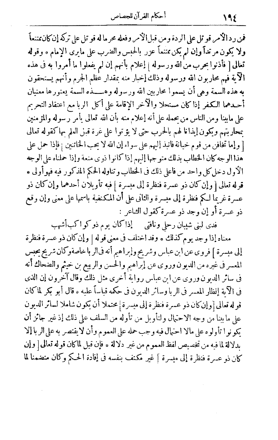 فدى لبنى شيبان رحلي ونافتى إذَا كَانَ يَوْمٌ ذُو كَوَاكِبَ أَشْهَبُ مَعْنَاهُ إذَا وُجِدَ يَوْمٌ كَذَلِكَ وَقَدْ اُخْتُلِفَ فِي مَعْنَى قَوْلِهِ وَإِنْ كانَ ذُو عُسْرَةٍ فَنَظِرَةٌ إِلى مَيْسَرَةٍ فَرُوِيَ عَنْ ابْنِ عَبَّاسٍ وَشُرَيْحٍ وَإِبْرَاهِيمَ أَنَّهُ فِي الرِّبَا خَاصَّةً وَكَانَ شُرَيْحٌ يَحْبِسُ الْمُعْسِرَ فِي غَيْرِهِ مِنْ الدُّيُونِ وَرُوِيَ عَنْ إبْرَاهِيمَ وَالْحَسَنِ وَالرَّبِيعِ بْنِ خَيْثَمٍ وَالضَّحَّاكِ أَنَّهُ فِي سَائِرِ الدُّيُونِ وَرُوِيَ عَنْ ابْنِ عَبَّاسٍ رِوَايَةٌ أُخْرَى مِثْلُ ذَلِكَ وَقَالَ آخَرُونَ إنَّ الَّذِي فِي الْآيَةِ إنْظَارُ الْمُعْسِرِ فِي الرِّبَا وَسَائِرِ الدُّيُونِ فِي حُكْمِهِ قِيَاسًا عَلَيْهِ قَالَ أَبُو بَكْرٍ لَمَّا كَانَ قَوْله تَعَالَى وَإِنْ كانَ ذُو عُسْرَةٍ فَنَظِرَةٌ إِلى مَيْسَرَةٍ مُحْتَمِلًا أَنْ يَكُونَ شَامِلًا لِسَائِرِ الدُّيُونِ عَلَى مَا بَيَّنَّا مِنْ وَجْهِ الِاحْتِمَالِ وَلِتَأْوِيلِ مَنْ تَأَوَّلَهُ مِنْ السَّلَفِ عَلَى ذَلِكَ إذْ غَيْرُ جَائِزٍ أَنْ يَكُونُوا تَأَوَّلُوهُ عَلَى مَا لَا احْتِمَالَ فِيهِ وَجَبَ حَمْلُهُ عَلَى الْعُمُومِ وَأَنْ لَا يَقْتَصِرَ بِهِ عَلَى الرِّبَا إلَّا بِدَلَالَةٍ لِمَا فِيهِ مِنْ تَخْصِيصِ لَفْظِ الْعُمُومِ مِنْ غَيْرِ دَلَالَةٍ فَإِنْ قِيلَ لَمَّا كَانَ قَوْله تَعَالَى وَإِنْ كانَ ذُو عُسْرَةٍ فَنَظِرَةٌ إِلى مَيْسَرَةٍ غَيْرَ مُكْتَفٍ بِنَفْسِهِ فِي إفَادَةِ الْحُكْمِ وَكَانَ متضمنا لما