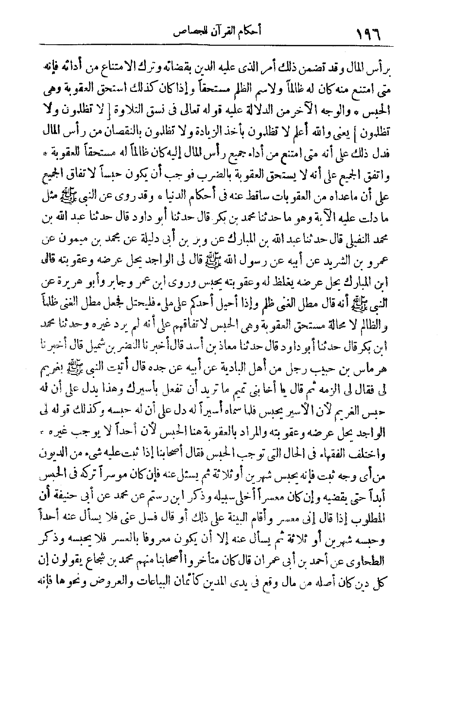 بِرَأْسِ الْمَالِ وَقَدْ تَضَمَّنَ ذَلِكَ أَمْرَ الَّذِي عَلَيْهِ الدَّيْنُ بِقَضَائِهِ وَتَرْكِ الِامْتِنَاعِ مِنْ أَدَائِهِ فَإِنَّهُ مَتَى امْتَنَعَ مِنْهُ كَانَ لَهُ ظَالِمًا وَلِاسْمِ الظُّلْمِ مُسْتَحِقًّا وَإِذَا كَانَ كَذَلِكَ اسْتَحَقَّ الْعُقُوبَةَ وَهِيَ الْحَبْسُ وَالْوَجْهُ الْآخَرُ مِنْ الدَّلَالَةِ عَلَيْهِ قَوْله تَعَالَى فِي نَسَقِ التِّلَاوَةِ لا تَظْلِمُونَ وَلا تُظْلَمُونَ يَعْنِي وَاَللَّهُ أَعْلَمُ لَا تَظْلِمُونَ بِأَخْذِ الزِّيَادَةِ وَلَا تُظْلَمُونَ بِالنُّقْصَانِ مِنْ رَأْسِ الْمَالِ فَدَلَّ ذَلِكَ عَلَى أَنَّهُ مَتَى امْتَنَعَ مِنْ أَدَاءِ جَمِيعِ رَأْسِ الْمَالِ إلَيْهِ كَانَ ظَالِمًا لَهُ مُسْتَحِقًّا لِلْعُقُوبَةِ وَاتَّفَقَ الْجَمِيعُ عَلَى أَنَّهُ لَا يَسْتَحِقُّ الْعُقُوبَةَ بِالضَّرْبِ فَوَجَبَ أَنْ يَكُونَ حَبْسًا لِاتِّفَاقِ الْجَمِيعِ عَلَى أَنَّ مَا عَدَاهُ مِنْ الْعُقُوبَاتِ سَاقِطٌ عَنْهُ فِي أَحْكَامِ الدُّنْيَا وَقَدْ رُوِيَ عَنْ النَّبِيِّ صَلَّى اللَّهُ عَلَيْهِ وسلم مِثْلُ مَا دَلَّتْ عَلَيْهِ الْآيَةُ وَهُوَ