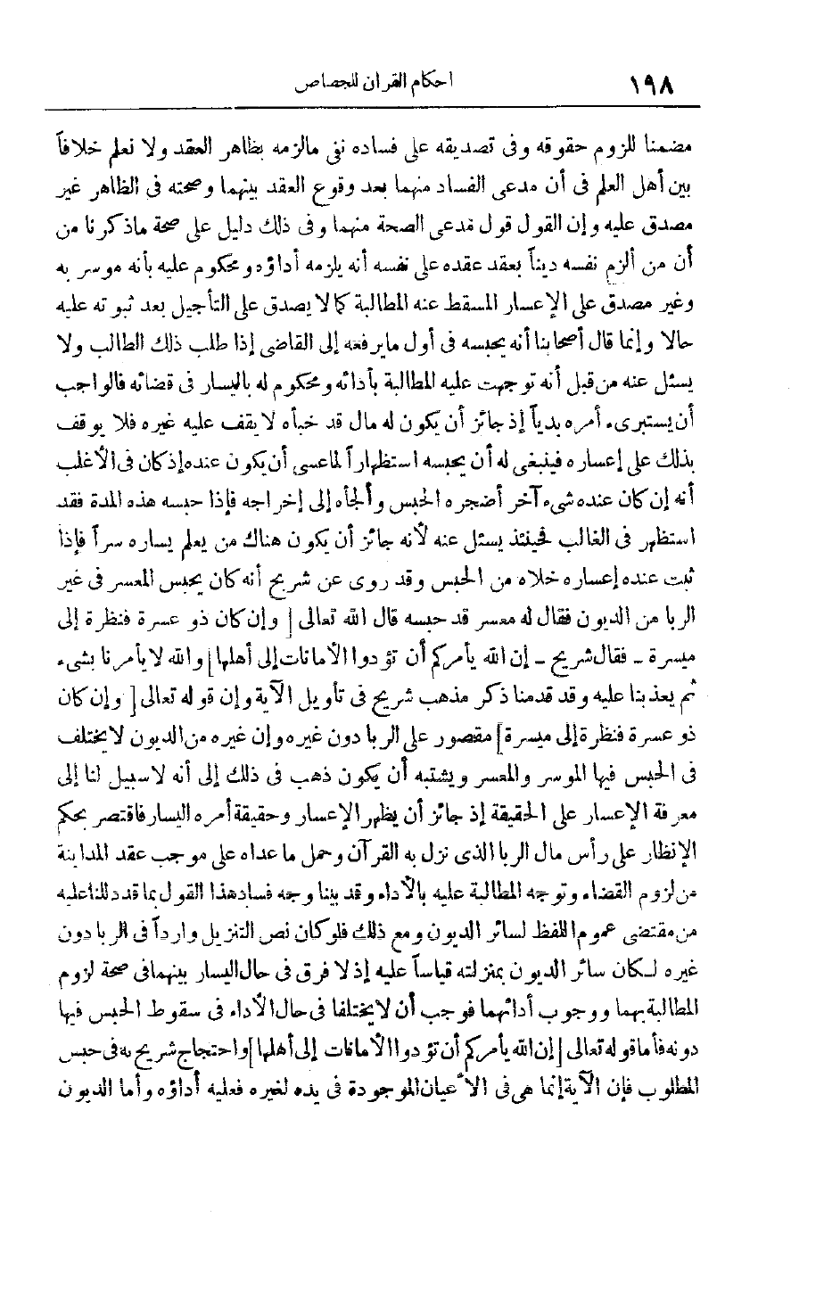 مُضَمِّنًا لِلُزُومِ حُقُوقِهِ وَفِي تَصْدِيقِهِ عَلَى فَسَادِهِ نَفْيُ مَا لَزِمَهُ بِظَاهِرِ الْعَقْدِ وَلَا نَعْلَمُ خِلَافًا بَيْنَ أَهْلِ الْعِلْمِ فِي أَنَّ مُدَّعِيَ الْفَسَادِ مِنْهُمَا بَعْدَ وُقُوعِ الْعَقْدِ بَيْنَهُمَا وَصِحَّتِهِ فِي الظَّاهِرِ غَيْرُ مُصَدَّقٍ عَلَيْهِ وَأَنَّ الْقَوْلَ قَوْلُ مُدَّعِي الصِّحَّةِ مِنْهُمَا وَفِي ذَلِكَ دَلِيلٌ عَلَى صِحَّةِ مَا ذَكَرْنَا مِنْ أَنَّ مَنْ أَلْزَمَ نَفْسَهُ دَيْنًا بِعَقْدٍ عَقَدَهُ عَلَى نَفْسِهِ أَنَّهُ يَلْزَمُهُ أَدَاؤُهُ وَمَحْكُومٌ عَلَيْهِ بِأَنَّهُ مُوسِرٌ بِهِ وَغَيْرُ مُصَدَّقٍ عَلَى الْإِعْسَارِ الْمُسْقِطِ عَنْهُ الْمُطَالَبَةَ كَمَا لَا يُصَدَّقُ عَلَى التَّأْجِيلِ بَعْدَ ثُبُوتِهِ عَلَيْهِ حَالًّا وَإِنَّمَا قَالَ أَصْحَابُنَا إنَّهُ يَحْبِسُهُ فِي أَوَّلِ مَا يَرْفَعُهُ إلَى الْقَاضِي إذا طلب ذلك الطالب ولا يسئل عَنْهُ مِنْ قِبَلِ أَنَّهُ تَوَجَّهَتْ عَلَيْهِ الْمُطَالَبَةُ بِأَدَائِهِ وَمَحْكُومٌ لَهُ بِالْيَسَارِ فِي قَضَائِهِ فَالْوَاجِبُ أَنْ يَسْتَبْرِئَ أَمْرَهُ بَدِيًّا إذْ جَائِزٌ أَنْ يَكُونَ لَهُ مَالٌ قَدْ خَبَّأَهُ لَا يَقِفُ عَلَيْهِ غَيْرُهُ فَلَا يُوقَفُ بِذَلِكَ عَلَى إعْسَارِهِ فَيَنْبَغِي لَهُ أَنْ يَحْبِسَهُ اسْتِظْهَارًا لِمَا عَسَى أَنْ يَكُونَ عِنْدَهُ إذْ كَانَ فِي الْأَغْلَبِ أَنَّهُ إنْ كَانَ عِنْدَهُ شَيْءٌ آخَرُ أَضْجَرَهُ الْحَبْسُ وَأَلْجَأَهُ إلَى إخْرَاجِهِ فَإِذَا حَبَسَهُ هَذِهِ المدة فقد استظهر في الغالب فحينئذ يسئل عَنْهُ لِأَنَّهُ جَائِزٌ أَنْ يَكُونَ هُنَاكَ مَنْ يَعْلَمُ يَسَارَهُ سِرًّا فَإِذَا ثَبَتَ عِنْدَهُ إعْسَارُهُ خَلَّاهُ مِنْ الْحَبْسِ وَقَدْ رُوِيَ عَنْ شُرَيْحٍ أَنَّهُ كَانَ يَحْبِسُ الْمُعْسِرَ فِي غَيْرِ الرِّبَا مِنْ الدُّيُونِ فَقَالَ لَهُ مُعْسِرٌ قَدْ حَبَسَهُ قَالَ اللَّهُ تَعَالَى وَإِنْ كانَ ذُو عُسْرَةٍ فَنَظِرَةٌ إِلى مَيْسَرَةٍ- فَقَالَ شُرَيْحٌ- إِنَّ اللَّهَ يَأْمُرُكُمْ أَنْ تُؤَدُّوا الْأَماناتِ إِلى أَهْلِها وَاَللَّهُ لَا يَأْمُرُنَا بِشَيْءٍ ثُمَّ يُعَذِّبُنَا عَلَيْهِ وَقَدْ قَدَّمْنَا ذِكْرَ مَذْهَبِ شُرَيْحٍ فِي تَأْوِيلِ الْآيَةِ وَأَنَّ قَوْله تَعَالَى وَإِنْ كانَ ذُو عُسْرَةٍ فَنَظِرَةٌ إِلى مَيْسَرَةٍ مَقْصُورٌ عَلَى الرِّبَا دُونَ غَيْرِهِ وَأَنَّ غَيْرَهُ مِنْ الدُّيُونِ لَا يَخْتَلِفُ فِي الْحَبْسِ فِيهَا الْمُوسِرُ وَالْمُعْسِرُ وَيُشْتَبَهُ أَنْ يَكُونَ ذَهَبَ فِي ذَلِكَ إلَى أَنَّهُ لَا سَبِيلَ لَنَا إلَى مَعْرِفَةِ الْإِعْسَارِ عَلَى الْحَقِيقَةِ إذْ جَائِزٌ أَنْ يظهر الإعسار وحقيقة أمره اليسار فاقتصر بحكم الْإِنْظَارُ عَلَى رَأْسِ مَالِ الرِّبَا الَّذِي نَزَلَ بِهِ الْقُرْآنُ وَحُمِلَ مَا عَدَاهُ عَلَى مُوجِبِ عقد المدينة مِنْ لُزُومِ الْقَضَاءِ وَتَوَجَّهَ الْمُطَالَبَةُ عَلَيْهِ بِالْأَدَاءِ وَقَدْ بَيَّنَّا وَجْهَ فَسَادِ هَذَا الْقَوْلِ بِمَا قَدْ دَلَلْنَا عَلَيْهِ مِنْ مُقْتَضَى عُمُومِ اللَّفْظِ لِسَائِرِ الدُّيُونِ وَمَعَ ذَلِكَ فَلَوْ كَانَ نَصُّ التَّنْزِيلِ وَارِدًا فِي الرِّبَا دُونَ غَيْرِهِ لَكَانَ سَائِرُ الدُّيُونِ بِمَنْزِلَتِهِ قِيَاسًا عَلَيْهِ إذْ لَا فَرْقَ فِي حَالِ الْيَسَارِ بَيْنَهُمَا فِي صِحَّةِ لُزُومِ الْمُطَالَبَةِ بِهِمَا وَوُجُوبِ أَدَائِهِمَا فَوَجَبَ أَنْ لَا يَخْتَلِفَا فِي حَالِ الْأَدَاءِ فِي سُقُوطِ الْحَبْسِ فِيهَا دُونَهُ فَأَمَّا قَوْله تَعَالَى إِنَّ اللَّهَ يَأْمُرُكُمْ أَنْ تُؤَدُّوا الْأَماناتِ إِلى أَهْلِها وَاحْتِجَاجُ شُرَيْحٍ بِهِ فِي حَبْسِ الْمَطْلُوبِ فَإِنَّ الْآيَةَ إنَّمَا هِيَ فِي الْأَعْيَانِ الْمَوْجُودَةِ فِي يَدِهِ لِغَيْرِه