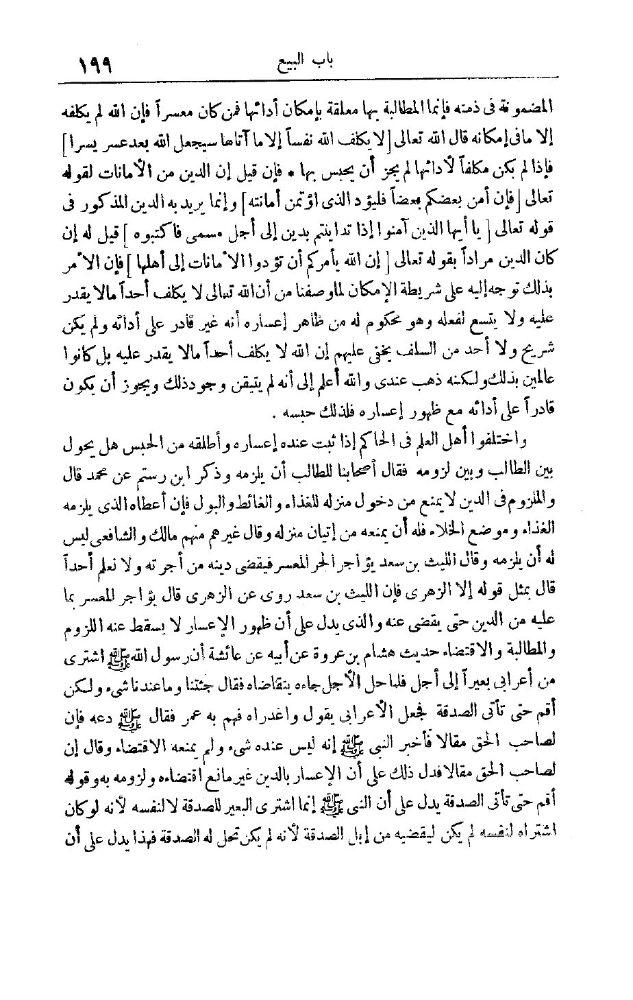 الْمَضْمُونَةُ فِي ذِمَّتِهِ فَإِنَّمَا الْمُطَالَبَةُ بِهَا مُعَلَّقَةٌ بِإِمْكَانِ أَدَائِهَا فَمَنْ كَانَ مُعْسِرًا فَإِنَّ اللَّهَ لَمْ يُكَلِّفْهُ إلَّا مَا فِي إمْكَانِهِ قَالَ اللَّهُ تَعَالَى لا يُكَلِّفُ اللَّهُ نَفْساً إِلَّا مَا آتَاهَا سَيَجْعَلُ اللَّهُ بَعْدَ عُسْرٍ يُسْراً فَإِذَا لَمْ يَكُنْ مُكَلَّفًا لِأَدَائِهَا لَمْ يَجُزْ أَنْ يُحْبَسَ بِهَا فَإِنْ قِيلَ إنَّ الدَّيْنَ مِنْ الْأَمَانَاتِ لِقَوْلِهِ تَعَالَى فَإِنْ أَمِنَ بَعْضُكُمْ بَعْضاً فَلْيُؤَدِّ الَّذِي اؤْتُمِنَ أَمانَتَهُ وَإِنَّمَا يُرِيدُ بِهِ الدَّيْنَ الْمَذْكُورَ فِي قَوْله تَعَالَى يَا أَيُّهَا الَّذِينَ آمَنُوا إِذا تَدايَنْتُمْ بِدَيْنٍ إِلى أَجَلٍ مُسَمًّى فَاكْتُبُوهُ قِيلَ