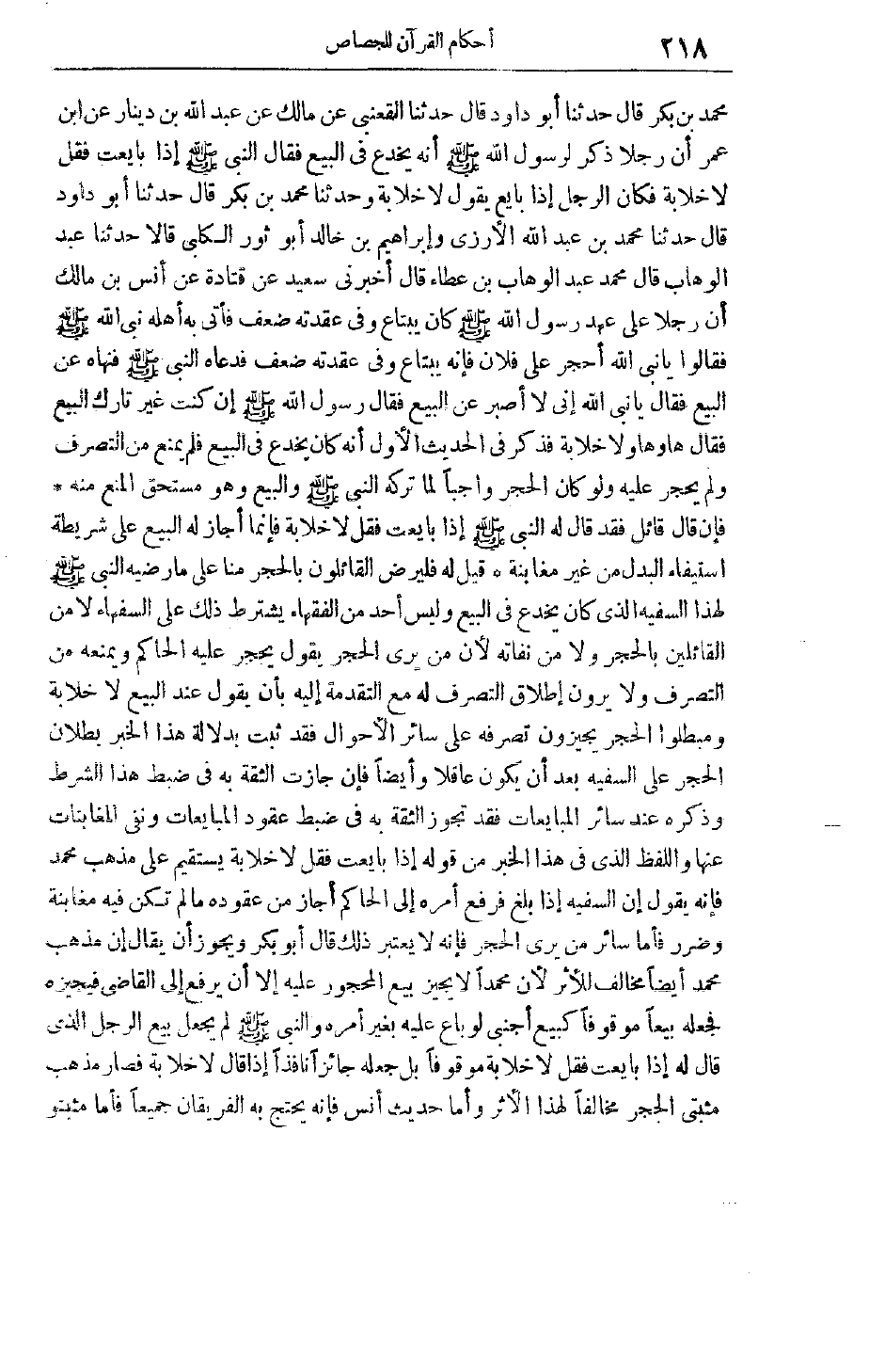 فَإِنَّمَا أَجَازَ لَهُ الْبَيْعَ على شريطة استيفاء البدل من غير مغابنة قِيلَ لَهُ فَلْيَرْضَ الْقَائِلُونَ بِالْحَجْرِ مِنَّا عَلَى مَا رَضِيَهُ النَّبِيُّ صَلَّى اللَّهُ عَلَيْهِ وَسَلَّمَ لِهَذَا السَّفِيهِ الَّذِي كَانَ يُخْدَعُ فِي الْبَيْعِ وَلَيْسَ أَحَدٌ مِنْ الْفُقَهَاءِ يَشْتَرِطُ ذَلِكَ عَلَى السُّفَهَاءِ لَا مِنْ الْقَائِلِينَ بِالْحَجْرِ وَلَا مِنْ نُفَاتِهِ لِأَنَّ مَنْ يَرَى الْحَجْرَ يَقُولُ يَحْجُرُ عَلَيْهِ الْحَاكِمُ وَيَمْنَعُهُ مِنْ التَّصَرُّفِ وَلَا يَرَوْنَ إطْلَاقَ التَّصَرُّفِ لَهُ مَعَ التَّقْدِمَةِ إلَيْهِ بِأَنْ يَقُولَ عِنْدَ الْبَيْعِ لَا خِلَابَةَ وَمُبْطِلُو الْحَجْرِ يُجِيزُونَ تَصَرُّفَهُ عَلَى سَائِرِ الْأَحْوَالِ فَقَدْ ثَبَتَ بِدَلَالَةِ هَذَا الْخَبَرِ بُطْلَانُ الْحَجْرِ عَلَى السَّفِيهِ بَعْدَ أَنْ يَكُونَ عَاقِلًا وَأَيْضًا فَإِنْ جَازَتْ الثِّقَةُ بِهِ فِي ضَبْطِ هَذَا الشَّرْطِ وَذَكَرَهُ عِنْدَ سَائِرِ الْمُبَايَعَاتِ فَقَدْ تَجُوزُ الثِّقَةُ بِهِ فِي ضَبْطِ عُقُودِ الْمُبَايَعَاتِ وَنَفْيِ الْمُغَابَنَاتِ عَنْهَا وَاللَّفْظُ الَّذِي فِي هَذَا الْخَبَرِ مِنْ قَوْلِهِ إذَا بَايَعْت فَقُلْ لَا خِلَابَةَ يَسْتَقِيمُ عَلَى مَذْهَبِ مُحَمَّدٍ فَإِنَّهُ يَقُولُ إنَّ السَّفِيهَ إذَا بَلَغَ فَرُفِعَ أَمْرُهُ إلَى الْحَاكِمِ أَجَازَ مِنْ عُقُودِهِ مَا لَمْ تَكُنْ فِيهِ مُغَابَنَةٌ وَضَرَرٌ فَأَمَّا سَائِرُ مَنْ يَرَى الْحَجْرَ فَإِنَّهُ لَا يَعْتَبِرُ ذَلِكَ قَالَ أَبُو بَكْرٍ وَيَجُوزُ أَنْ يُقَالَ إنَّ مَذْهَبَ مُحَمَّدٍ أَيْضًا مُخَالِفٌ لِلْأَثَرِ لِأَنَّ مُحَمَّدًا لَا يُجِيزُ بَيْعَ الْمَحْجُورِ عَلَيْهِ إلا أن يرفع إلى القاضي فيجيزه فجعله بَيْعًا مَوْقُوفًا كَبَيْعِ أَجْنَبِيٍّ لَوْ بَاعَ عَلَيْهِ بِغَيْرِ أَمْرِهِ وَالنَّبِيُّ صَلَّى اللَّهُ عَلَيْهِ وَسَلَّمَ لَمْ يَجْعَلْ بَيْعَ الرَّجُلِ الَّذِي قَالَ لَهُ إذَا بَايَعْت فَقُلْ لَا خِلَابَةَ مَوْقُوفًا بَلْ جَعَلَهُ جَائِزًا نَافِذًا إذَا قَالَ لَا خِلَابَةَ فَصَارَ مَذْهَبُ مُثْبِتِي الْحَجْرِ مُخَالِفًا لِهَذَا الْأَثَرِ وَأَمَّا حَدِيثُ أَنَسٍ فَإِنَّهُ يَحْتَجُّ بِهِ الْفَرِيقَانِ جَمِيعًا فَأَمَّا مُثْبِتُو