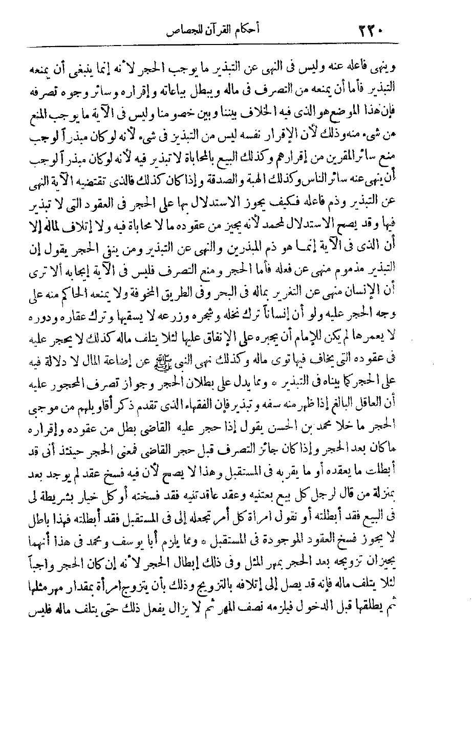 وَيُنْهَى فَاعِلُهُ عَنْهُ وَلَيْسَ فِي النَّهْيِ عَنْ التَّبْذِيرِ مَا يُوجِبُ الْحَجْرَ لِأَنَّهُ إنَّمَا يَنْبَغِي أَنْ يَمْنَعَهُ التَّبْذِيرُ فَأَمَّا أَنْ يَمْنَعَهُ مِنْ التَّصَرُّفِ فِي مَالِهِ وَيُبْطِلَ بِيَاعَاتِهِ وَإِقْرَارِهِ وَسَائِرِ وُجُوهِ تَصَرُّفِهِ فَإِنَّ هَذَا الْمَوْضِعَ هُوَ الَّذِي فِيهِ الْخِلَافُ بَيْنَنَا وَبَيْنَ خُصُومِنَا وَلَيْسَ فِي الْآيَةِ مَا يُوجِبُ الْمَنْعَ مِنْ شَيْءٍ مِنْهُ وَذَلِكَ لِأَنَّ الْإِقْرَارَ نَفْسَهُ لَيْسَ مِنْ التَّبْذِيرِ فِي شَيْءٍ لِأَنَّهُ لَوْ كَانَ مُبَذِّرًا لَوَجَبَ مَنْعُ سَائِرِ الْمُقِرِّينَ مِنْ إقْرَارِهِمْ وَكَذَلِكَ الْبَيْعُ بِالْمُحَابَاةِ لَا تَبْذِيرَ فِيهِ لِأَنَّهُ لَوْ كَانَ مُبَذِّرًا لَوَجَبَ أَنْ يَنْهَى عَنْهُ سَائِرَ النَّاسِ وَكَذَلِكَ الْهِبَةُ وَالصَّدَقَةُ وَإِذَا كَانَ كَذَلِكَ فَاَلَّذِي تَقْتَضِيهِ الْآيَةُ النَّهْيُ عَنْ التَّبْذِيرِ وَذَمُّ فَاعِلِهِ فَكَيْفَ يَجُوزُ الِاسْتِدْلَال بِهَا عَلَى الْحَجْرِ فِي الْعُقُودِ الَّتِي لَا تَبْذِيرَ فِيهَا وَقَدْ يَصِحُّ الِاسْتِدْلَال لِمُحَمَّدٍ لِأَنَّهُ يُجِيزُ مِنْ عُقُودِهِ مَا لَا مُحَابَاةَ فِيهِ وَلَا إتْلَافَ لِمَالِهِ إلَّا أَنَّ الَّذِي فِي الْآيَةِ إنَّمَا هُوَ ذَمُّ الْمُبَذِّرِينَ وَالنَّهْيُ عَنْ التَّبْذِيرِ وَمَنْ يَنْفِي الْحَجْرَ يَقُولُ إنَّ التَّبْذِيرَ مَذْمُومٌ مَنْهِيٌّ عَنْ فِعْلِهِ فَأَمَّا الْحَجْرُ وَمَنْعُ التَّصَرُّفِ فَلَيْسَ فِي الْآيَةِ إيجَابُهُ أَلَا تَرَى أَنَّ الْإِنْسَانَ مَنْهِيٌّ عَنْ التَّغْرِيرِ بِمَالِهِ فِي الْبَحْرِ وَفِي الطَّرِيقِ الْمَخُوفَةِ وَلَا يَمْنَعُهُ الْحَاكِمُ مِنْهُ عَلَى وَجْهِ الْحَجْرِ عَلَيْهِ وَلَوْ أَنَّ إنْسَانًا تَرَكَ نَخْلَهُ وَشَجَرَهُ وَزَرْعَهُ لَا يَسْقِيهَا وَتَرَكَ عَقَارَهُ وَدُورَهُ لَا يَعْمُرُهَا لَمْ يَكُنْ لِلْإِمَامِ أَنْ يَجْبُرَهُ عَلَى الْإِنْفَاقِ عَلَيْهَا لِئَلَّا يَتْلَفَ مَالُهُ كَذَلِكَ لَا يَحْجُرُ عَلَيْهِ فِي عُقُودِهِ الَّتِي يَخَافُ فِيهَا تَوَى مَالِهِ وَكَذَلِكَ نَهْيُ النَّبِيِّ صَلَّى اللَّهُ عَلَيْهِ وَسَلَّمَ عَنْ إضَاعَةِ الْمَالِ لَا دَلَالَةَ فِيهِ عَلَى الْحَجْرِ كَمَا بَيَّنَّاهُ فِي التَّبْذِيرِ وَمِمَّا يَدُلُّ عَلَى بُطْلَانِ الْحَجْرِ وَجَوَازِ تَصَرُّفِ الْمَحْجُورِ عَلَيْهِ أَنَّ الْعَاقِلَ الْبَالِغَ إذَا ظَهَرَ منه سفه وتبذير فإن الفقهاء الذي تَقَدَّمَ ذِكْرُ أَقَاوِيلِهِمْ مِنْ مُوجِبِي الْحَجْرِ مَا خَلَا مُحَمَّدَ بْنَ الْحَسَنِ يَقُولُ إذَا حَجَرَ عَلَيْهِ الْقَاضِي بَطَلَ مِنْ عُقُودِهِ وَإِقْرَارِهِ مَا كَانَ بَعْدَ الْحَجْرِ وَإِذَا كَانَ جَائِزَ التَّصَرُّفِ قَبْلَ حَجْرِ الْقَاضِي فَمَعْنَى الْحَجْرِ حِينَئِذٍ أَنِّي قد أبطلت ما يعقده أو ما يقربه فِي الْمُسْتَقْبَلِ وَهَذَا لَا يَصِحُّ لِأَنَّ فِيهِ فَسْخَ عَقْدٍ لَمْ يُوجَدْ بَعْدُ بِمَنْزِلَةِ مَنْ قَالَ لِرَجُلٍ كُلُّ بَيْعٍ بِعْتنِيهِ وَعَقْدٍ عَاقَدْتَنِيهِ فَقَدْ فَسَخْته أَوْ كُلُّ خِيَارٍ بِشَرِيطَةٍ لِي في البيع فقد أبطلته أو نقول امْرَأَةٌ كُلُّ أَمْرٍ تَجْعَلُهُ إلَيَّ فِي الْمُسْتَقْبَلِ فَقَدْ أَبْطَلْته فَهَذَا بَاطِلٌ لَا يَجُوزُ فَسْخُ الْعُقُودِ الْمَوْجُودَةِ فِي الْمُسْتَقْبَلِ وَمِمَّا يَلْزَمُ أَبَا يوسف ومحمد فِي هَذَا أَنَّهُمَا يُجِيزَانِ تَزْوِيجَهُ بَعْدَ الْحَجْرِ بِمَهْرِ الْمِثْلِ وَفِي ذَلِكَ إبْطَالُ الْحَجْرِ لِأَنَّهُ إنْ كَانَ الْحَجْرُ وَاجِبًا لِئَلَّا يَتْلَفَ مَالُهُ فَإِنَّهُ قَدْ يَصِلُ إلَى إتْلَافِهِ بِالتَّزْوِيجِ وَذَلِكَ بِأَنْ يَتَزَوَّجَ امْرَأَةً بِمِقْدَارِ مَهْرِ مِثْلِهَا ثُمَّ يُط