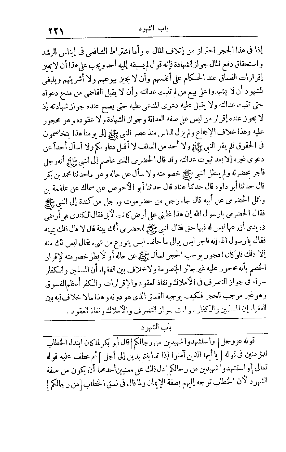 فَلَوْ كَانَ الْفُجُورُ يُوجِبُ الْحَجْرَ لَسَأَلَ صَلَّى اللَّهُ عَلَيْهِ وَسَلَّمَ عَنْ حَالِهِ أَوْ لَأَبْطَلَ خُصُومَتَهُ لِإِقْرَارِ الْخَصْمِ بِأَنَّهُ مَحْجُورٌ عَلَيْهِ غَيْرُ جَائِزِ الْخُصُومَةِ وَلَا خِلَافَ بَيْنَ الْفُقَهَاءِ أَنَّ الْمُسْلِمِينَ وَالْكُفَّارَ سَوَاءٌ فِي جَوَازِ التَّصَرُّفِ فِي الْأَمْلَاكِ وَنَفَاذِ الْعُقُودِ وَالْإِقْرَارَاتِ وَالْكُفْرُ أَعْظَمُ الْفُسُوقِ وَهُوَ غَيْرُ مُوجِبٍ لِلْحَجْرِ فَكَيْفَ يُوجِبُهُ الْفِسْقُ الَّذِي هُوَ دُونَهُ وَهَذَا مَا لَا خِلَافَ فِيهِ بَيْنَ الْفُقَهَاءِ أَنَّ الْمُسْلِمِينَ وَالْكُفَّارَ سَوَاءٌ في جواز التصرف والأملاك ونفاذ العقود.