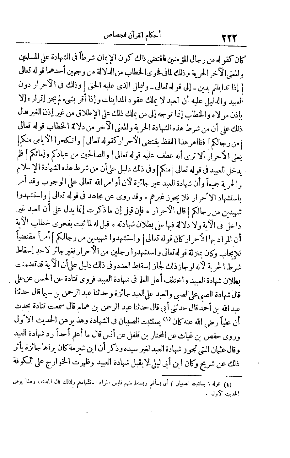 كان كقوله من رجال المؤمنين فاقتضى ذاك كَوْنَ الْإِيمَانِ شَرْطًا فِي الشَّهَادَةِ عَلَى الْمُسْلِمِينَ وَالْمَعْنَى الْآخَرِ الْحُرِّيَّةِ وَذَلِكَ لِمَا فِي فَحْوَى الْخِطَابِ مِنْ الدَّلَالَةِ مِنْ وَجْهَيْنِ أَحَدِهِمَا قَوْله تعالى إِذا تَدايَنْتُمْ بِدَيْنٍ- إلَى قَوْله تَعَالَى- وَلْيُمْلِلِ الَّذِي عَلَيْهِ الْحَقُّ وَذَلِكَ فِي الْأَحْرَارِ دُونَ الْعَبِيدِ وَالدَّلِيلُ عَلَيْهِ أَنَّ الْعَبْدَ لَا يَمْلِكُ عُقُودَ الْمُدَايَنَاتِ وَإِذَا أَقَرَّ بِشَيْءٍ لَمْ يَجُزْ إقْرَارُهُ إلَّا بِإِذْنِ مَوْلَاهُ وَالْخِطَابُ إنَّمَا تَوَجَّهَ إلَى مَنْ يَمْلِكُ ذَلِكَ عَلَى الْإِطْلَاقِ مِنْ غَيْرِ إذْنِ الْغَيْرِ فَدَلَّ ذَلِكَ عَلَى أَنَّ مِنْ شَرْطِ هَذِهِ الشَّهَادَةِ الْحُرِّيَّةَ وَالْمَعْنَى الْآخَرِ مِنْ دَلَالَةِ الْخِطَابِ قوله تعالى مِنْ رِجالِكُمْ فظاهر هذا اللفظ يقتضى الأحرار كقوله تعالى وَأَنْكِحُوا الْأَيامى مِنْكُمْ يَعْنِي الْأَحْرَارَ أَلَا تَرَى أَنَّهُ عَطَفَ عَلَيْهِ قوله تعالى وَالصَّالِحِينَ مِنْ عِبادِكُمْ وَإِمائِكُمْ فَلَمْ يَدْخُلْ الْعَبِيدُ فِي قَوْله تَعَالَى مِنْكُمْ وَفِي ذَلِكَ دَلِيلٌ عَلَى أَنَّ مِنْ شَرْطِ هَذِهِ الشَّهَادَةِ الْإِسْلَامَ وَالْحُرِّيَّةَ جَمِيعًا وَأَنَّ شَهَادَةَ الْعَبْدِ غَيْرُ جَائِزَةٍ لِأَنَّ أَوَامِرَ اللَّهِ تَعَالَى عَلَى الْوُجُوبِ وَقَدْ أَمَرَ بِاسْتِشْهَادِ الْأَحْرَارِ فَلَا يَجُوزُ غَيْرُهُمْ وَقَدْ رُوِيَ عَنْ مُجَاهِدٍ فِي قوله تعالى وَاسْتَشْهِدُوا شَهِيدَيْنِ مِنْ رِجالِكُمْ قَالَ الْأَحْرَارُ فَإِنْ قِيلَ إنَّ مَا ذَكَرْت إنَّمَا يَدُلُّ عَلَى أَنَّ الْعَبْدَ غَيْرُ دَاخِلٍ فِي الْآيَةِ وَلَا دَلَالَةَ فِيهَا عَلَى بُطْلَانِ شَهَادَتِهِ قِيلَ لَهُ لَمَّا ثَبَتَ بِفَحْوَى خِطَابِ الآية أن المراد بها الأحرار كان قوله تعالى وَاسْتَشْهِدُوا شَهِيدَيْنِ مِنْ رِجالِكُمْ أَمْرًا مُقْتَضِيًا لِلْإِيجَابِ وَكَانَ بِمَنْزِلَةِ قَوْله تَعَالَى وَاسْتَشْهِدُوا رَجُلَيْنِ مِنْ الْأَحْرَارِ فَغَيْرُ جَائِزٍ لِأَحَدٍ إسْقَاطُ شَرْطِ الْحُرِّيَّةِ لِأَنَّهُ لَوْ جَازَ ذَلِكَ لَجَازَ إسْقَاطُ الْعَدَدِ وَفِي ذَلِكَ دَلِيلٌ عَلَى أَنَّ الْآيَةَ قَدْ تَضَمَّنَتْ بُطْلَانَ شَهَادَةِ الْعَبِيدِ وَاخْتَلَفَ أَهْلُ الْعِلْمِ فِي شَهَادَةِ الْعَبِيدِ فَرَوَى قَتَادَةُ عَنْ الْحَسَنِ عَنْ عَلِيٍّ قَالَ شَهَادَةُ الصَّبِيِّ عَلَى الصَّبِيِّ وَالْعَبْدِ عَلَى الْعَبْدِ جَائِزَةٌ