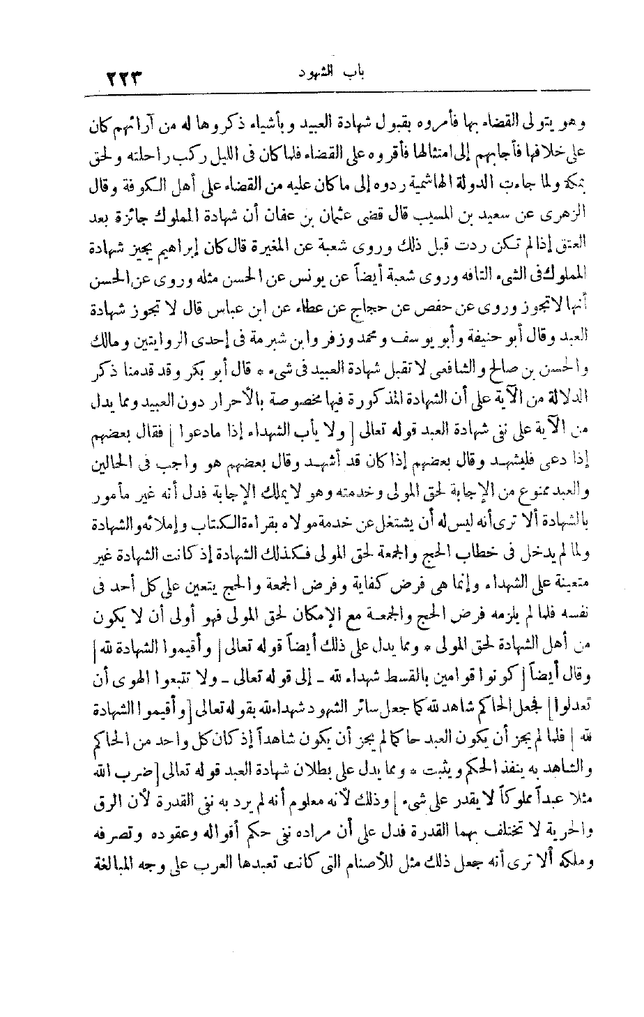 وَهُوَ يَتَوَلَّى الْقَضَاءَ بِهَا فَأَمَرُوهُ بِقَبُولِ شَهَادَةِ الْعَبِيدِ وَبِأَشْيَاءَ ذَكَرُوهَا لَهُ مِنْ آرَائِهِمْ كَانَ عَلَى خِلَافِهَا فَأَجَابَهُمْ إلَى امْتِثَالِهَا فَأَقَرُّوهُ عَلَى الْقَضَاءِ فَلَمَّا كَانَ فِي اللَّيْلِ رَكِبَ رَاحِلَتَهُ وَلَحِقَ بِمَكَّةَ وَلَمَّا جَاءَتْ الدَّوْلَةُ الْهَاشِمِيَّةُ رَدُّوهُ إلَى مَا كَانَ عَلَيْهِ مِنْ الْقَضَاءِ عَلَى أَهْلِ الْكُوفَةِ وَقَالَ الزُّهْرِيُّ عَنْ سَعِيدِ بْنِ الْمُسَيِّبِ قَالَ قَضَى عُثْمَانُ بْنُ عَفَّانَ أَنَّ شَهَادَةَ الْمَمْلُوكِ جَائِزَةٌ بَعْدَ الْعِتْقِ إذَا لَمْ تَكُنْ رُدَّتْ قَبْلَ ذَلِكَ وَرَوَى شُعْبَةُ عَنْ الْمُغِيرَةَ قَالَ كَانَ إبْرَاهِيمُ يُجِيزُ شَهَادَةَ الْمَمْلُوكِ فِي الشَّيْءِ التَّافِهِ وَرَوَى شُعْبَةُ أَيْضًا عَنْ يُونُسَ عَنْ الْحَسَنِ مِثْلَهُ وَرُوِيَ عَنْ الْحَسَنِ أَنَّهَا لَا تَجُوزُ وَرُوِيَ عَنْ حَفْصٍ عَنْ حَجَّاجٍ عَنْ عَطَاءٍ عَنْ ابْنِ عَبَّاسٍ قَالَ لَا تَجُوزُ شَهَادَةُ الْعَبْدِ وَقَالَ أَبُو حَنِيفَةَ وَأَبُو يُوسُفَ وَمُحَمَّدٌ وَزُفَرُ وَابْنُ شُبْرُمَةَ فِي إحْدَى الرِّوَايَتَيْنِ وَمَالِكٌ وَالْحَسَنُ بْنُ صَالِحٍ وَالشَّافِعِيُّ لَا تُقْبَلُ شَهَادَةُ الْعَبِيدِ فِي شَيْءٍ قَالَ أَبُو بَكْرٍ وَقَدْ قَدَّمْنَا ذِكْرَ الدَّلَالَةِ مِنْ الْآيَةِ عَلَى أَنَّ الشَّهَادَةَ الْمَذْكُورَةَ فِيهَا مَخْصُوصَةٌ بِالْأَحْرَارِ دُونَ الْعَبِيدِ وَمِمَّا يَدُلُّ مِنْ الْآيَةِ عَلَى نَفْيِ شَهَادَةِ الْعَبْدِ قَوْله تَعَالَى وَلا يَأْبَ الشُّهَداءُ إِذا ما دُعُوا فَقَالَ بَعْضُهُمْ إذَا دُعِيَ فَلْيَشْهَدْ وَقَالَ بَعْضُهُمْ إذَا كَانَ قَدْ أَشْهَدَ وَقَالَ بَعْضُهُمْ هُوَ وَاجِبٌ فِي الْحَالَيْنِ وَالْعَبْدُ مَمْنُوعٌ مِنْ الْإِجَابَةِ لِحَقِّ الْمَوْلَى وَخِدْمَتِهِ وَهُوَ لَا يَمْلِكُ الْإِجَابَةَ فَدَلَّ أَنَّهُ غَيْرُ مَأْمُورٍ بِالشَّهَادَةِ أَلَا تَرَى أَنَّهُ لَيْسَ لَهُ أَنْ يَشْتَغِلَ عَنْ خِدْمَةِ مَوْلَاهُ بِقِرَاءَةِ الْكِتَابِ وَإِمْلَائِهِ وَالشَّهَادَةِ وَلَمَّا لَمْ يَدْخُلْ فِي خِطَابِ الْحَجِّ وَالْجُمُعَةِ لِحَقِّ الْمَوْلَى فَكَذَلِكَ الشَّهَادَةُ إذْ كَانَتْ الشَّهَادَةُ غَيْرَ مُتَعَيِّنَةٍ عَلَى الشُّهَدَاءِ وَإِنَّمَا هِيَ فَرْضُ كِفَايَةٍ وَفَرْضُ الْجُمُعَةِ وَالْحَجِّ يَتَعَيَّنُ عَلَى كُلِّ أَحَدٍ فِي نَفْسِهِ فَلَمَّا لَمْ يَلْزَمْهُ فَرْضَ الْحَجِّ وَالْجُمُعَةُ مَعَ الْإِمْكَانِ لِحَقِّ الْمَوْلَى فَهُوَ أَوْلَى أَنْ لَا يَكُونَ مِنْ أَهْلِ الشَّهَادَةِ لِحَقِّ الْمَوْلَى وَمِمَّا يَدُلُّ عَلَى ذَلِكَ أَيْضًا قَوْله تَعَالَى وَأَقِيمُوا الشَّهادَةَ لِلَّهِ وَقَالَ أَيْضًا كُونُوا قَوَّامِينَ بِالْقِسْطِ شُهَداءَ لِلَّهِ- إلَى قَوْله تَعَالَى- فَلا تَتَّبِعُوا الْهَوى أَنْ تَعْدِلُوا فجعل الحاكم شاهد لِلَّهِ كَمَا جَعَلَ سَائِرَ الشُّهُودِ شُهَدَاءَ لِلَّهِ بقوله تعالى وَأَقِيمُوا الشَّهادَةَ لِلَّهِ فَلَمَّا لَمْ يَجُزْ أَنْ يَكُونَ الْعَبْدُ حَاكِمًا لَمْ يَجُزْ أَنْ يَكُونَ شَاهِدًا إذْ كَانَ كُلُّ وَاحِدٍ مِنْ الْحَاكِمِ وَالشَّاهِدِ بِهِ يُنَفَّذُ الْحُكْمُ وَيَثْبُتُ وَمِمَّا يَدُلُّ عَلَى بُطْلَانِ شَهَادَةِ الْعَبْدِ قَوْله تَعَالَى ضَرَبَ اللَّهُ مَثَلًا عَبْداً مَمْلُوكاً لا يَقْدِرُ عَلى شَيْءٍ وَذَلِكَ لِأَنَّهُ مَعْلُومٌ أَنَّهُ لَمْ يُرِدْ بِهِ نَفْيَ الْقُدْرَةِ لِأَنَّ الرِّقَّ وَالْحُرِّيَّةَ لَا تَخْتَلِفُ بِهِمَا الْقُدْرَةُ فَدَلَّ عَلَى أَنَّ مُرَادَهُ نَفْيُ حُكْمِ أَقْوَالِهِ وَعُقُودِهِ وَتَصَرُّفِهِ وَمِلْكِهِ أَلَا تَرَى أنه جعل ذلك مثل لِلْأَصْنَامِ الَّتِي كَانَتْ تَعْب