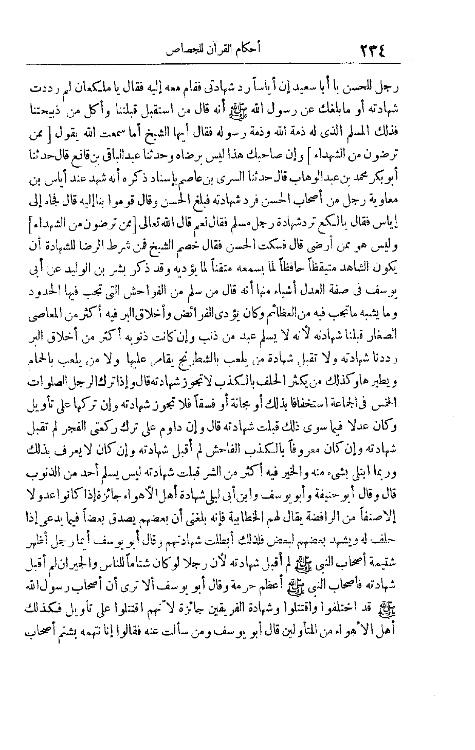 فَقَالَ أَيُّهَا الشَّيْخُ أَمَا سَمِعْت اللَّهَ يَقُولُ مِمَّنْ تَرْضَوْنَ مِنَ الشُّهَداءِ وإن صاحبك هذا ليس برضاه وَحَدَّثَنَا عَبْدُ الْبَاقِي بْنُ قَانِعٍ قَالَ حَدَّثَنَا أَبُو بَكْرٍ مُحَمَّدُ بْنُ عَبْدِ الْوَهَّابِ قَالَ حَدَّثَنَا السِّرِّيُّ بْنُ عَاصِمٍ بِإِسْنَادٍ ذَكَرَهُ أَنَّهُ شَهِدَ عِنْدَ إيَاسِ بْنِ مُعَاوِيَةَ رَجُلٌ مِنْ أَصْحَابِ الْحَسَنِ فَرَدَّ شَهَادَتَهُ فَبَلَغَ الْحَسَنُ وَقَالَ قُومُوا بِنَا إلَيْهِ قَالَ فَجَاءَ إلَى إيَاسٍ فَقَالَ يَا لُكَعُ تَرُدُّ شَهَادَةَ رَجُلٍ مُسْلِمٍ فَقَالَ نَعَمْ قَالَ اللَّهُ تَعَالَى مِمَّنْ تَرْضَوْنَ مِنَ الشُّهَداءِ وَلَيْسَ هُوَ مِمَّنْ أَرْضَى قَالَ فَسَكَتَ الْحَسَنُ فَقَالَ خَصْمُ الشَّيْخِ فَمِنْ شَرْطِ الرِّضَا لِلشَّهَادَةِ أَنْ يَكُونَ الشَّاهِدُ مُتَيَقِّظًا حَافِظًا لِمَا يَسْمَعُهُ مُتْقِنًا لِمَا يُؤَدِّيهِ وَقَدْ ذَكَرَ بِشْرُ بْنُ الْوَلِيدِ عَنْ أَبِي يُوسُفَ فِي صِفَةِ الْعَدْلِ أَشْيَاءَ مِنْهَا أَنَّهُ قَالَ مَنْ سَلِمَ مِنْ الْفَوَاحِشِ الَّتِي تَجِبُ فِيهَا الْحُدُودُ وَمَا يُشْبِهُ مَا تَجِبُ فِيهِ مِنْ الْعَظَائِمِ وَكَانَ يُؤَدِّي الْفَرَائِضَ وَأَخْلَاقُ الْبِرِّ فِيهِ أَكْثَرُ مِنْ الْمَعَاصِي الصِّغَارِ قَبِلْنَا شَهَادَتَهُ لِأَنَّهُ لَا يَسْلَمُ عَبْدٌ مِنْ ذَنْبٍ وَإِنْ كَانَتْ ذُنُوبُهُ أَكْثَرَ مِنْ أَخْلَاقِ الْبِرِّ رَدَدْنَا شَهَادَتَهُ وَلَا تُقْبَلُ شَهَادَةُ مَنْ يَلْعَبُ بِالشِّطْرَنْجِ يُقَامِرُ عَلَيْهَا وَلَا مَنْ يَلْعَبُ بِالْحَمَامِ وَيُطَيِّرُهَا وَكَذَلِكَ مَنْ يُكْثِرُ الْحَلِفَ بِالْكَذِبِ لَا تَجُوزُ شَهَادَتُهُ قَالَ وَإِذَا تَرَكَ الرَّجُلُ الصَّلَوَاتِ الْخَمْسَ فِي الْجَمَاعَةِ اسْتِخْفَافًا بِذَلِكَ أَوْ مَجَانَةً أَوْ فِسْقًا فَلَا تَجُوزُ شَهَادَتُهُ وَإِنَّ تَرَكَهَا عَلَى تَأْوِيلٍ وَكَانَ عَدْلًا فِيمَا سِوَى ذَلِكَ قُبِلَتْ شَهَادَتُهُ قَالَ وَإِنْ دَاوَمَ عَلَى تَرْكِ رَكْعَتَيْ الْفَجْرِ لَمْ تُقْبَلْ شَهَادَتُهُ وَإِنْ كَانَ مَعْرُوفًا بِالْكَذِبِ الْفَاحِشِ لَمْ أَقْبَلُ شَهَادَتَهُ وَإِنْ كَانَ لَا يُعْرَفُ بِذَلِكَ وَرُبَّمَا اُبْتُلِيَ بِشَيْءٍ مِنْهُ وَالْخَيْرُ فِيهِ أَكْثَرُ مِنْ الشَّرِّ قُبِلَتْ شَهَادَتُهُ لَيْسَ يَسْلَمُ أَحَدٌ مِنْ الذُّنُوبِ قَالَ وَقَالَ أَبُو حَنِيفَةَ وَأَبُو يُوسُفَ وَابْنُ أَبِي لَيْلَى شَهَادَةُ أَهْلِ الْأَهْوَاءِ جَائِزَةٌ إذَا كَانُوا عُدُولًا إلَّا صِنْفًا مِنْ الرَّافِضَةِ يُقَالُ لَهُمْ الْخَطَّابِيَّةُ فَإِنَّهُ بَلَغَنِي أَنَّ بَعْضَهُمْ يُصَدِّقُ بَعْضًا فِيمَا يَدَّعِي إذَا حَلَفَ لَهُ وَيَشْهَدُ بَعْضُهُمْ لِبَعْضٍ فَلِذَلِكَ أَبْطَلْت شَهَادَتَهُمْ وَقَالَ أَبُو يُوسُفَ أَيُّمَا رَجُلٍ أَظْهَرَ شَتِيمَةَ أَصْحَابِ النَّبِيِّ صَلَّى اللَّهُ عَلَيْهِ وَسَلَّمَ لَمْ أَقْبَلْ شَهَادَتَهُ لِأَنَّ رَجُلًا لَوْ كَانَ شَتَّامًا لِلنَّاسِ وَالْجِيرَانِ لَمْ أَقْبَلْ شَهَادَتَهُ فَأَصْحَابُ النَّبِيِّ صَلَّى اللَّهُ عَلَيْهِ وَسَلَّمَ أَعْظَمُ حُرْمَةً وَقَالَ أَبُو يُوسُفَ أَلَا تَرَى أَنَّ أَصْحَابَ رَسُولِ اللَّهِ صَلَّى اللَّهُ عَلَيْهِ وَسَلَّمَ قَدْ اخْتَلَفُوا وَاقْتَتَلُوا وَشَهَادَةُ الْفَرِيقَيْنِ جَائِزَةٌ لِأَنَّهُمْ اقْتَتَلُوا عَلَى تَأْوِيلٍ فَكَذَلِكَ أَهْلُ الْأَهْوَاءِ مِنْ الْمُتَأَوِّلِينَ قَالَ أَبُو يُوسُفَ وَمَنْ سَأَلْت عَنْهُ فَقَالُوا إنَّا نَتَّهِمُهُ بشتم أصحاب