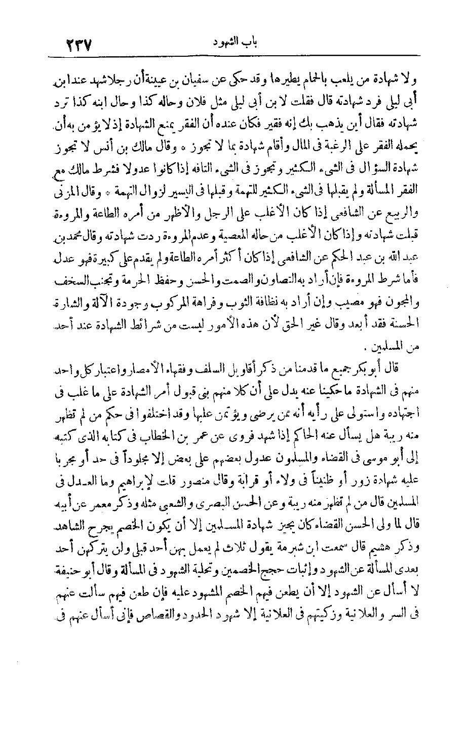قَالَ أبو بكر جميع مَا قَدَّمْنَا مِنْ ذِكْرِ أَقَاوِيلِ السَّلَفِ وَفُقَهَاءِ الْأَمْصَارِ وَاعْتِبَارِ كُلِّ وَاحِدٍ مِنْهُمْ فِي الشَّهَادَةِ مَا حَكَيْنَا عَنْهُ يَدُلُّ عَلَى أَنَّ كُلًّا مِنْهُمْ بَنَى قَبُولَ أَمْرِ الشَّهَادَةِ عَلَى مَا غَلَبَ فِي اجْتِهَادِهِ وَاسْتَوْلَى عَلَى رَأْيِهِ أَنَّهُ مِمَّنْ يَرْضَى وَيُؤْتَمَنُ عَلَيْهَا وَقَدْ اخْتَلَفُوا فِي حُكْمِ مَنْ لَمْ تَظْهَرْ مِنْهُ رِيبَةٌ هَلْ يَسْأَلُ عَنْهُ الْحَاكِمُ إذَا شَهِدَ فَرُوِيَ عَنْ عُمَرَ بْنِ الْخَطَّابِ فِي كِتَابِهِ الَّذِي كَتَبَهُ إلى أبو موسى في القضاء والمسلمون عُدُولٌ بَعْضُهُمْ عَلَى بَعْضٍ إلَّا مَجْلُودًا فِي حَدٍّ أَوْ مُجَرَّبًا عَلَيْهِ شَهَادَةُ زُورٍ أَوْ ظِنِّينًا فِي وَلَاءٍ أَوْ قَرَابَةٍ وَقَالَ مَنْصُورٌ قُلْت لِإِبْرَاهِيمَ وَمَا الْعَدْلُ فِي الْمُسْلِمِينَ قَالَ مَنْ لَمْ تَظْهَرْ مِنْهُ رِيبَةٌ وَعَنْ الْحَسَنِ الْبَصْرِيِّ وَالشَّعْبِيِّ مِثْلُهُ وَذَكَرَ مَعْمَرٌ عَنْ أَبِيهِ قَالَ لَمَّا وَلِيَ الْحَسَنُ الْقَضَاءَ كَانَ يُجِيزُ شَهَادَةَ الْمُسْلِمِينَ إلَّا أَنْ يَكُونَ الْخَصْمُ يَجْرَحُ الشَّاهِدَ وَذَكَرَ هُشَيْمٌ قَالَ سَمِعْت ابْنَ شُبْرُمَةَ يَقُولُ ثَلَاثٌ لَمْ يَعْمَلْ بِهِنَّ أَحَدٌ قَبْلِي وَلَنْ يَتْرُكْهُنَّ أَحَدٌ بَعْدِي الْمَسْأَلَةُ عَنْ الشُّهُودِ وَإِثْبَاتُ حُجَجِ الْخَصْمَيْنِ وَتَحْلِيَةُ الشُّهُودِ فِي الْمَسْأَلَةِ وَقَالَ أَبُو حَنِيفَةَ لَا أَسْأَلُ عَنْ الشُّهُودِ إلَّا أَنْ يَطْعَنَ فِيهِمْ الْخَصْمُ الْمَشْهُودُ عَلَيْهِ فَإِنْ طَعَنَ فِيهِمْ سَأَلْت عَنْهُمْ فِي السِّرِّ وَالْعَلَانِيَةِ وَزَكَّيْتهمْ فِي الْعَلَانِيَةِ إلَّا شُهُودَ الْحُدُودِ وَالْقِصَاصِ فَإِنِّي أَسْأَلُ عَنْهُمْ فِي