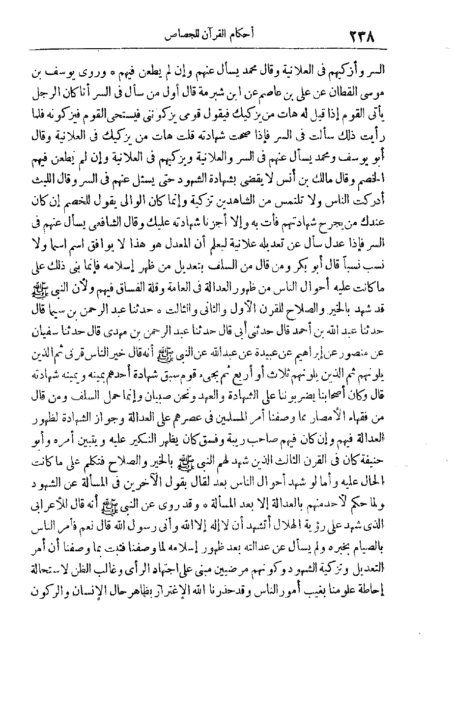 السِّرِّ وَأُزَكِّيهِمْ فِي الْعَلَانِيَةِ وَقَالَ مُحَمَّدٌ يُسْأَلُ عَنْهُمْ وَإِنْ لَمْ يُطْعَنْ فِيهِمْ وَرَوَى يُوسُفُ بْنُ مُوسَى الْقَطَّانُ عَنْ عَلِيِّ بْنِ عَاصِمٍ عَنْ ابْنِ شُبْرُمَةَ قَالَ أَوَّلُ مَنْ سَأَلَ فِي السِّرِّ أَنَا كَانَ الرَّجُلُ يَأْتِي الْقَوْمَ إذَا قِيلَ لَهُ هَاتِ مَنْ يُزَكِّيَك فَيَقُولُ قَوْمِي يُزَكُّونَنِي فَيَسْتَحْيِ الْقَوْمُ فَيُزَكُّونَهُ فَلَمَّا رَأَيْت ذَلِكَ سَأَلْت فِي السِّرِّ فَإِذَا صَحَّتْ شَهَادَتُهُ قُلْت هَاتِ مَنْ يُزَكِّيَك فِي الْعَلَانِيَةِ وَقَالَ أَبُو يُوسُفَ وَمُحَمَّدٌ يَسْأَلُ عَنْهُمْ فِي السِّرِّ وَالْعَلَانِيَةِ وَيُزَكِّيهِمْ فِي الْعَلَانِيَةِ وَإِنْ لَمْ يَطْعَنْ فِيهِمْ الْخَصْمُ وَقَالَ مَالِكُ بْنُ أَنَسٍ لَا يقضى بشهادة الشهود حتى يسئل عَنْهُمْ فِي السِّرِّ وَقَالَ اللَّيْثُ أَدْرَكْت النَّاسَ وَلَا تُلْتَمَسُ مِنْ الشَّاهِدَيْنِ تَزْكِيَةٌ وَإِنَّمَا كَانَ الْوَالِي يَقُولُ لِلْخَصْمِ إنْ كَانَ عِنْدَك مَنْ يَجْرَحُ شَهَادَتُهُمْ فَأْتِ بِهِ وَإِلَّا أَجَزْنَا شَهَادَتَهُ عَلَيْك وَقَالَ الشَّافِعِيُّ يُسْأَلُ عَنْهُمْ فِي السِّرِّ فَإِذَا عُدِّلَ سَأَلَ عَنْ تَعْدِيلِهِ عَلَانِيَةً لِيَعْلَمَ أَنَّ الْمُعَدَّلَ هُوَ هَذَا لَا يُوَافِقُ اسْمٌ اسْمًا وَلَا نَسَبٌ نَسَبًا قَالَ أَبُو بَكْرٍ وَمَنْ قَالَ مِنْ السَّلَفِ بِتَعْدِيلِ مَنْ ظَهَرَ إسْلَامُهُ فَإِنَّمَا بَنَى ذَلِكَ عَلَى مَا كَانَتْ عَلَيْهِ أَحْوَالُ النَّاسِ مِنْ ظُهُورِ الْعَدَالَةِ فِي الْعَامَّةِ وَقِلَّةِ الْفُسَّاقِ فِيهِمْ وَلِأَنَّ النَّبِيَّ صَلَّى اللَّهُ عَلَيْهِ وَسَلَّمَ قَدْ شَهِدَ بِالْخَيْرِ وَالصَّلَاحِ لِلْقَرْنِ الْأَوَّلِ وَالثَّانِي وَالثَّالِثِ