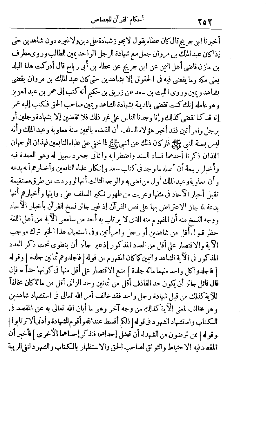 إلَّا بِشَهَادَةِ رَجُلَيْنِ أَوْ بِرَجُلٍ وَامْرَأَتَيْنِ فَقَدْ أَخْبَرَ هَؤُلَاءِ السَّلَفِ إنَّ الْقَضَاءَ بِالْيَمِينِ سُنَّةُ مُعَاوِيَةَ وَعَبْدِ الْمَلِكِ وَأَنَّهُ لَيْسَ بِسُنَّةِ النَّبِيِّ صَلَّى اللَّهُ عَلَيْهِ وَسَلَّمَ فَلَوْ كَانَ ذَلِكَ عَنْ النَّبِيِّ صَلَّى اللَّهُ عَلَيْهِ وَسَلَّمَ لَمَا خَفِيَ عَلَى عُلَمَاءِ التَّابِعِينَ فَهَذَانِ الْوَجْهَانِ اللَّذَانِ ذَكَرْنَا أَحَدُهُمَا فَسَادُ السَّنَدِ وَاضْطِرَابُهُ وَالثَّانِي جُحُودُ سُهَيْلٍ لَهُ وَهُوَ الْعُمْدَةُ فِيهِ وَإِخْبَارُ رَبِيعَةَ أَنَّ أَصْلَهُ مَا وُجِدَ فِي كِتَابِ سَعْدٍ وَإِنْكَارِ عُلَمَاءِ التَّابِعِينَ وَإِخْبَارِهِمْ أَنَّهُ بِدْعَةٌ وَأَنَّ مُعَاوِيَةَ وَعَبْدَ الْمَلِكِ أَوَّلُ مَنْ قَضَى بِهِ وَالْوَجْهُ الثَّالِثُ إنَّهَا لَوْ وَرَدَتْ مِنْ طُرُقٍ مُسْتَقِيمَةٍ تُقْبَلُ أَخْبَارُ الْآحَادِ فِي مِثْلِهَا وَعُرِّيَتْ مِنْ ظُهُورِ نَكِيرِ السَّلَفِ عَلَى روايتها وَإِخْبَارِهِمْ إنَّهَا بِدْعَةٌ لَمَا جَازَ الِاعْتِرَاضُ بِهَا عَلَى نَصِّ الْقُرْآنِ إذْ غَيْرُ جَائِزٍ نَسْخُ الْقُرْآنِ بِأَخْبَارِ الْآحَادِ وَوَجْهُ النَّسْخِ مِنْهُ أَنَّ الْمَفْهُومَ مِنْهُ الَّذِي لَا يَرْتَابُ بِهِ أَحَدٌ مِنْ سَامِعِي الْآيَةِ مِنْ أَهْلِ اللُّغَةِ حُظِرَ قَبُولُ أَقَلَّ مِنْ شَاهِدَيْنِ أَوْ رَجُلٍ وَامْرَأَتَيْنِ وَفِي اسْتِعْمَالِ هَذَا الْخَبَرِ تَرْكُ مُوجِبِ الْآيَةِ وَالِاقْتِصَارُ عَلَى أَقَلَّ مِنْ الْعَدَدِ الْمَذْكُورِ إذْ غَيْرُ جَائِزٍ أَنْ يَنْطَوِيَ تَحْتَ ذِكْرِ الْعَدَدِ الْمَذْكُورِ فِي الْآيَةِ الشَّاهِدُ وَالْيَمِينُ كَمَا كَانَ المفهوم من قوله فَاجْلِدُوهُمْ ثَمانِينَ جَلْدَةً وَقَوْلِهِ فَاجْلِدُوا كُلَّ واحِدٍ مِنْهُما مِائَةَ جَلْدَةٍ مَنَعَ الِاقْتِصَارَ عَلَى أَقَلَّ مِنْهَا فِي كَوْنِهَا حَدًّا فَإِنْ قَالَ قَائِلٌ جَائِزٌ أَنْ يَكُونَ حد القاذف أقل من ثمانين وحد الزَّانِي أَقَلَّ مِنْ مِائَةٍ كَانَ مُخَالِفًا لِلْآيَةِ كَذَلِكَ مَنْ قَبِلَ شَهَادَةَ رَجُلٍ وَاحِدٍ فَقَدْ خَالَفَ أَمْرَ اللَّهِ تَعَالَى فِي اسْتِشْهَادِ شَاهِدَيْنِ وَهُوَ مُخَالِفٌ لِمَعْنَى الْآيَةِ كَذَلِكَ مِنْ وَجْهٍ آخَرَ وَهُوَ مَا أَبَانَ اللَّهُ تَعَالَى بِهِ عَنْ الْمَقْصِدِ فِي الْكِتَابِ وَاسْتِشْهَادِ الشُّهُودِ فِي قَوْلِهِ ذلِكُمْ أَقْسَطُ عِنْدَ اللَّهِ وَأَقْوَمُ لِلشَّهادَةِ وَأَدْنى أَلَّا تَرْتابُوا وَقَوْلُهُ مِمَّنْ تَرْضَوْنَ مِنَ الشُّهَداءِ أَنْ تَضِلَّ إِحْداهُما فَتُذَكِّرَ إِحْداهُمَا الْأُخْرى فَأَخْبَرَ أَنَّ الْمَقْصِدَ فِيهِ الِاحْتِيَاطُ وَالتَّوَثُّقُ لِصَاحِبِ الْحَقِّ وَالِاسْتِظْهَارُ بِالْكِتَابِ وَالشُّهُودِ لِنَفْيِ الرِّيبَةِ