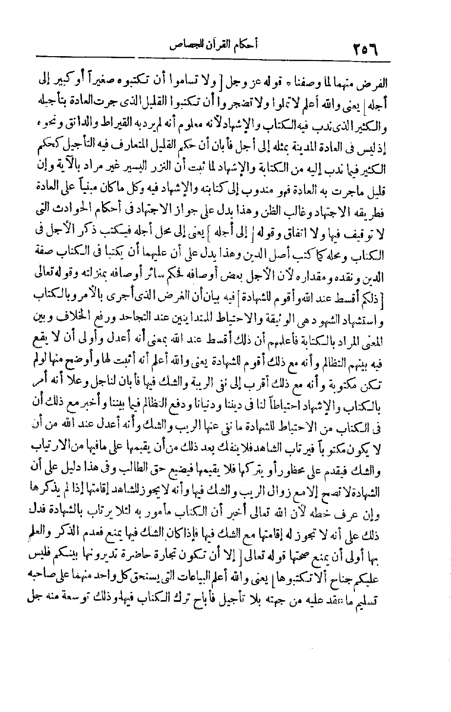 الفرض منهما لما وصفنا قوله عز وجل وَلا تَسْئَمُوا أَنْ تَكْتُبُوهُ صَغِيراً أَوْ كَبِيراً إِلى أَجَلِهِ يَعْنِي وَاَللَّهُ أَعْلَمُ لَا تَمَلُّوا وَلَا تَضْجَرُوا أَنْ تَكْتُبُوا الْقَلِيلَ الَّذِي جَرَتْ الْعَادَةُ بِتَأْجِيلِهِ وَالْكَثِيرَ الَّذِي نُدِبَ فِيهِ الْكِتَابُ وَالْإِشْهَادُ لِأَنَّهُ مَعْلُومٌ أَنَّهُ لَمْ يُرِدْ بِهِ الْقِيرَاطَ وَالدَّانِقَ ونحوه إذ ليس في العادة المدينة بِمِثْلِهِ إلَى أَجَلٍ فَأَبَانَ أَنَّ حُكْمَ الْقَلِيلِ الْمُتَعَارَفِ فِيهِ التَّأْجِيلُ كَحُكْمِ الْكَثِيرِ فِيمَا نُدِبَ إلَيْهِ مِنْ الْكِتَابَةِ وَالْإِشْهَادِ لِمَا ثَبَتَ أَنَّ النَّزْرَ الْيَسِيرَ غَيْرُ مُرَادٍ بِالْآيَةِ وَأَنَّ قَلِيلَ مَا جَرَتْ بِهِ الْعَادَةُ فَهُوَ مَنْدُوبٌ إلَى كِتَابَتِهِ وَالْإِشْهَادِ فِيهِ وَكُلُّ مَا كَانَ مَبْنِيًّا عَلَى الْعَادَةِ فَطَرِيقُهُ الِاجْتِهَادُ وَغَالِبُ الظَّنِّ وَهَذَا يَدُلُّ عَلَى جَوَازِ الِاجْتِهَادِ فِي أَحْكَامِ الْحَوَادِثِ الَّتِي لَا تَوْقِيفَ فِيهَا وَلَا اتِّفَاقَ وَقَوْلُهُ إِلى أَجَلِهِ يَعْنِي إلَى مَحِلِّ أَجَلِهِ فَيَكْتُبُ ذِكْرَ الْأَجَلِ فِي الْكِتَابِ وَمَحِلِّهِ كَمَا كَتَبَ أَصْلَ الدَّيْنِ وَهَذَا يَدُلُّ عَلَى أَنَّ عَلَيْهِمَا أَنْ يَكْتُبَا فِي الْكِتَابِ صِفَةَ الدَّيْنِ وَنَقْدَهُ وَمِقْدَارَهُ لِأَنَّ الأجل بعض أوصافه فَحُكْمُ سَائِرِ أَوْصَافِهِ بِمَنْزِلَتِهِ