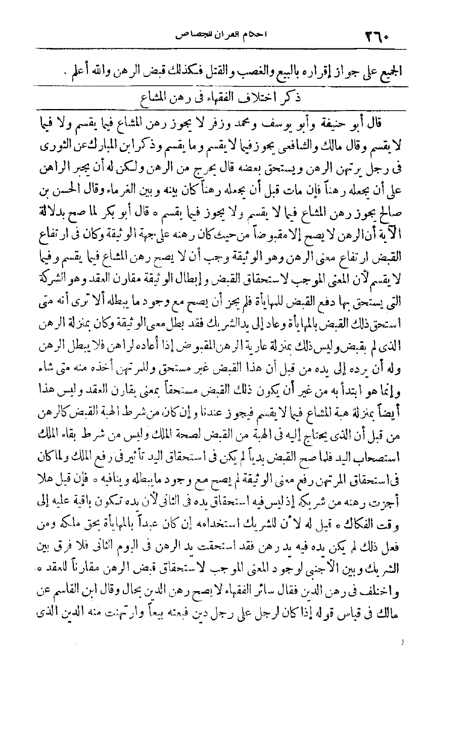 قَالَ أَبُو حَنِيفَةَ وَأَبُو يُوسُفَ وَمُحَمَّدٌ وَزُفَرُ لَا يَجُوزُ رَهْنُ الْمُشَاعِ فِيمَا يُقْسَمُ وَلَا فِيمَا لَا يُقْسَمُ وَقَالَ مَالِكٌ وَالشَّافِعِيُّ يَجُوزُ فِيمَا لَا يُقْسَمُ وَمَا يُقْسَمُ وَذَكَرَ ابْنُ الْمُبَارَكِ عَنْ الثَّوْرِيِّ فِي رَجُلٍ يَرْتَهِنُ الرَّهْنَ وَيَسْتَحِقُّ بعضه قال يحرج مِنْ الرَّهْنِ وَلَكِنْ لَهُ أَنْ يُجْبِرَ الرَّاهِنَ عَلَى أَنْ يَجْعَلَهُ رَهْنًا فَإِنْ مَاتَ قَبْلَ أَنْ يَجْعَلَهُ رَهْنًا كَانَ بَيْنَهُ وَبَيْنَ الْغُرَمَاءِ وَقَالَ الْحَسَنُ بْنُ صَالِحٍ يَجُوزُ رَهْنُ الْمُشَاعِ فِيمَا لَا يُقْسَمُ وَلَا يَجُوزُ فِيمَا يُقْسَمُ قَالَ أَبُو بَكْرٍ لَمَّا صَحَّ بِدَلَالَةِ الْآيَةِ أَنَّ الرَّهْنَ لَا يَصِحُّ إلَّا مَقْبُوضًا مِنْ حَيْثُ كَانَ رَهْنُهُ عَلَى جِهَةِ الْوَثِيقَةِ وَكَانَ فِي ارْتِفَاعِ الْقَبْضِ ارْتِفَاعُ مَعْنَى الرَّهْنِ وَهُوَ الْوَثِيقَةُ وَجَبَ أَنْ لَا يَصِحَّ رَهْنُ الْمُشَاعِ فِيمَا يُقْسَمُ وَفِيمَا لَا يُقْسَمُ لِأَنَّ الْمَعْنَى الموجب لاستحقاق القبض وإبطال الوثيقة مقارن العقد وَهُوَ الشَّرِكَةُ الَّتِي يَسْتَحِقُّ بِهَا دَفْعَ الْقَبْضِ لِلْمُهَايَأَةِ فَلَمْ يَجُزْ أَنْ يَصِحَّ مَعَ وُجُودِ مَا يُبْطِلُهُ أَلَا تَرَى أَنَّهُ مَتَى اسْتَحَقَّ ذَلِكَ الْقَبْضَ بِالْمُهَايَأَةِ وَعَادَ إلَى يَدِ الشَّرِيكِ فَقَدْ بَطَلَ مَعْنَى الْوَثِيقَةِ وَكَانَ بِمَنْزِلَةِ الرَّهْنِ الَّذِي لَمْ يُقْبَضْ وَلَيْسَ ذَلِكَ بِمَنْزِلَةِ عَارِيَّةِ الرهن المقبوض إذا أعاده لراهن فَلَا يَبْطُلُ الرَّهْنُ وَلَهُ أَنْ يَرُدَّهُ إلَى يَدِهِ مِنْ قِبَلِ أَنَّ هَذَا الْقَبْضَ غَيْرُ مُسْتَحَقٍّ وَلِلْمُرْتَهِنِ أَخْذُهُ مِنْهُ مَتَى شَاءَ وَإِنَّمَا هُوَ ابْتَدَأَ بِهِ مِنْ غَيْرِ أَنْ يَكُونَ ذَلِكَ الْقَبْضُ مُسْتَحَقًّا بِمَعْنًى يُقَارِنُ الْعَقْدَ وَلَيْسَ هَذَا أَيْضًا بِمَنْزِلَةِ هِبَةِ الْمُشَاعِ فِيمَا لَا يُقْسَمُ فَيَجُوزُ عِنْدَنَا وَإِنْ كَانَ مِنْ شَرْطِ الْهِبَةِ الْقَبْضُ كَالرَّهْنِ مِنْ قِبَلِ أَنَّ الَّذِي يُحْتَاجُ إلَيْهِ فِي الْهِبَةِ مِنْ الْقَبْضِ لِصِحَّةِ الْمِلْكِ وَلَيْسَ مِنْ شَرْطِ بَقَاءِ الْمِلْكِ اسْتِصْحَابُ الْيَدِ فَلَمَّا صَحَّ الْقَبْضُ بَدِيًّا لَمْ يَكُنْ فِي اسْتِحْقَاقِ الْيَدِ تَأْثِيرٌ فِي رَفْعِ الْمِلْكِ وَلَمَّا كَانَ فِي اسْتِحْقَاقِ الْمُرْتَهِنِ رَفْعُ مَعْنَى الْوَثِيقَةِ لَمْ يَصِحَّ مَعَ وُجُودِ مَا يُبْطِلُهُ وَيُنَافِيهِ فَإِنْ قِيلَ هَلَّا أَجَزْت رَهْنَهُ مِنْ شَرِيكِهِ إذْ لَيْسَ فِيهِ اسْتِحْقَاقُ يَدِهِ فِي الثَّانِي لِأَنَّ يَدَهُ تَكُونُ بَاقِيَةً عَلَيْهِ إلَى وَقْتِ الْفِكَاكِ قِيلَ لَهُ لِأَنَّ لِلشَّرِيكِ اسْتِخْدَامَهُ إنْ كَانَ عَبْدًا بِالْمُهَايَأَةِ بِحَقِّ مِلْكِهِ وَمَنْ فَعَلَ ذَلِكَ لَمْ يَكُنْ يَدُهُ فِيهِ يَدَ رَهْنٍ فَقَدْ اُسْتُحِقَّتْ يَدُ الرَّهْنِ فِي الْيَوْمِ الثَّانِي فَلَا فَرْقَ بَيْنَ الشَّرِيكِ وَبَيْنَ الْأَجْنَبِيِّ لِوُجُودِ الْمَعْنَى الْمُوجِبِ لِاسْتِحْقَاقِ قَبْضِ الرَّهْنِ مُقَارِنًا للعقد وَاخْتُلِفَ فِي رَهْنِ الدَّيْنِ فَقَالَ سَائِرُ الْفُقَهَاءِ لَا يَصِحُّ رَهْنُ الدَّيْنِ بِحَالٍ وَقَالَ ابْنُ الْقَاسِمِ عَنْ مَالِكٍ فِي قِيَاسِ قَوْلِهِ إذَا كَانَ لِرَجُلٍ عَلَى رَجُلٍ دَيْنٌ فَبِعْته بَيْعًا وَارْتَهَنْت مِنْهُ الدَّيْنَ الَّذِي
