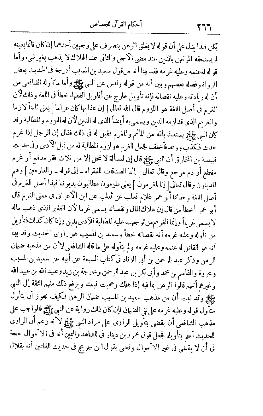 وَقَالَ تَعَالَى إِنَّمَا الصَّدَقاتُ لِلْفُقَراءِ- إلى قوله- وَالْغارِمِينَ وهم المدينون وقال تعالى إِنَّا لَمُغْرَمُونَ يَعْنِي مُلْزَمُونَ مُطَالَبُونَ بِدُيُونِنَا فَهَذَا أَصْلُ الْغُرْمِ في أصل اللغة وَحَدَّثَنَا أَبُو عُمَرَ غُلَامُ ثَعْلَبٍ عَنْ ثَعْلَبٍ عَنْ ابْنِ الْأَعْرَابِيِّ فِي مَعْنَى الْغُرْمِ قَالَ أَبُو عُمَرَ أَخْطَأَ مَنْ قَالَ إنَّ هَلَاكَ الْمَالِ وَنُقْصَانَهُ يُسَمَّى غُرْمًا لِأَنَّ الْفَقِيرَ الَّذِي ذَهَبَ مَالُهُ لَا يُسَمَّى غَرِيمًا وَإِنَّمَا الْغَرِيمُ مَنْ تَوَجَّهَتْ عَلَيْهِ الْمُطَالَبَةُ لِلْآدَمِيِّ بِدَيْنٍ وَإِذَا كَانَ كَذَلِكَ فَتَأْوِيلُ مَنْ تَأَوَّلَهُ وَعَلَيْهِ غُرْمُهُ أَنَّهُ نقصانه خَطَأٌ وَسَعِيدُ بْنُ الْمُسَيِّبِ هُوَ رَاوِي الْحَدِيثِ وَقَدْ بَيَّنَّا أَنَّهُ هُوَ الْقَائِلُ لَهُ غُنْمُهُ وَعَلَيْهِ غُرْمُهُ وَلَمْ يَتَأَوَّلْهُ عَلَى مَا قَالَهُ الشافعى لأن مِنْ مَذْهَبِهِ ضَمَانُ الرَّهْنِ وَذَكَرَ عَبْدُ الرَّحْمَنِ بْنُ أَبِي الزِّنَادِ فِي كِتَابِ السَّبْعَةِ عَنْ أَبِيهِ عَنْ سَعِيدِ بْنِ الْمُسَيِّبِ وَعُرْوَةَ وَالْقَاسِمِ بْنِ مُحَمَّدٍ وَأَبِي بَكْرِ بْنِ عَبْدِ الرَّحْمَنِ وَخَارِجَةَ بْنِ زيد وعبيد الله بن عبيد اللَّهِ وَغَيْرِهِمْ أَنَّهُمْ قَالُوا الرَّهْنُ بِمَا فِيهِ إذَا هَلَكَ وَعَمِيَتْ قِيمَتُهُ وَيَرْفَعُ ذَلِكَ مِنْهُمْ الثِّقَةُ إلَى النَّبِيِّ صَلَّى اللَّهُ عَلَيْهِ وَسَلَّمَ وَقَدْ ثَبَتَ أَنَّ مِنْ مَذْهَبِ سَعِيدِ بْنِ الْمُسَيِّبِ ضَمَانَ الرَّهْنِ فَكَيْفَ يَجُوزُ أَنْ يَتَأَوَّلَ مُتَأَوِّلٌ قَوْلَهُ وَعَلَيْهِ غُرْمُهُ عَلَى نَفْيِ الضَّمَانِ فَإِنْ كَانَ ذَلِكَ رِوَايَةً عَنْ النَّبِيِّ صَلَّى اللَّهُ عَلَيْهِ وَسَلَّمَ فَالْوَاجِبُ عَلَى مَذْهَبِ الشَّافِعِيِّ أَنْ يَقْضِيَ بِتَأْوِيلِ الرَّاوِي عَلَى مُرَادِ النَّبِيِّ صَلَّى اللَّهُ عَلَيْهِ وَسَلَّمَ لِأَنَّهُ زَعَمَ أَنَّ الرَّاوِيَ لِلْحَدِيثِ أَعْلَمُ بِتَأْوِيلِهِ فَجَعَلَ قَوْلَ عَمْرِو بْنِ دِينَارٍ فِي الشَّاهِدِ وَالْيَمِينِ أَنَّهُ فِي الْأَمْوَالِ حُجَّةً فِي أَنْ لَا يُقْضَى فِي غَيْرِ الْأَمْوَالِ وَقَضَى بِقَوْلِ ابْنِ جُرَيْجٍ فِي حَدِيثِ الْقُلَّتَيْنِ أَنَّهُ بِقِلَالِ