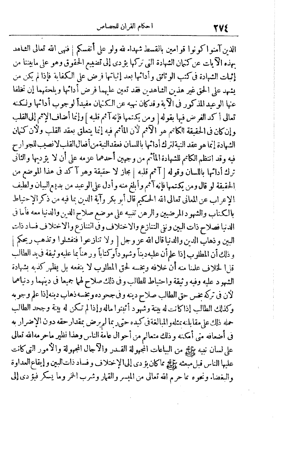 يَا أَيُّهَا الَّذِينَ آمَنُوا كُونُوا قَوَّامِينَ بِالْقِسْطِ شُهَداءَ لِلَّهِ وَلَوْ عَلى أَنْفُسِكُمْ فَنَهَى اللَّهُ تَعَالَى الشَّاهِدَ بِهَذِهِ الْآيَاتِ عَنْ كِتْمَانِ الشَّهَادَةِ الَّتِي تَرَكَهَا يُؤَدِّي إلَى تَضْيِيعِ الحقوق وهو على ما بيننا مِنْ إثْبَاتِ الشَّهَادَةِ فِي كُتُبِ الْوَثَائِقِ وَأَدَائِهَا بَعْدَ إثْبَاتِهَا فَرْضٌ عَلَى الْكِفَايَةِ فَإِذَا لَمْ يَكُنْ مَنْ يَشْهَدُ عَلَى الْحَقِّ غَيْرَ هَذَيْنِ الشَّاهِدَيْنِ فَقَدْ تَعَيَّنَ عَلَيْهِمَا فَرْضُ أَدَائِهَا وَيَلْحَقُهُمَا إنْ تَخَلَّفَا عَنْهَا الْوَعِيدُ الْمَذْكُورُ فِي الْآيَةِ وَقَدْ كَانَ نَهْيُهُ عَنْ الْكِتْمَانِ مُفِيدًا لِوُجُوبِ أَدَائِهَا وَلَكِنَّهُ تَعَالَى أَكَّدَ الْفَرْضَ فِيهَا بِقَوْلِهِ وَمَنْ يَكْتُمْها فَإِنَّهُ آثِمٌ قَلْبُهُ وَإِنَّمَا أَضَافَ الْإِثْمَ إلَى الْقَلْبِ وَإِنْ كَانَ فِي الْحَقِيقَةِ الْكَاتِمُ هُوَ الْآثِمُ لِأَنَّ الْمَأْثَمَ فِيهِ إنَّمَا يَتَعَلَّقُ بِعَقْدِ الْقَلْبِ وَلِأَنَّ كِتْمَانَ الشَّهَادَةِ إنَّمَا هُوَ عَقْدُ النِّيَّةِ لِتَرْكِ أَدَائِهَا بِاللِّسَانِ فَعَقْدُ النِّيَّةِ مِنْ أَفْعَالِ الْقَلْبِ لَا نَصِيبَ لِلْجَوَارِحِ فِيهِ وَقَدْ انْتَظَمَ الْكَاتِمُ لِلشَّهَادَةِ الْمَأْثَمَ مِنْ وَجْهَيْنِ أَحَدِهِمَا عَزْمِهِ عَلَى أَنْ لَا يُؤَدِّيَهَا وَالثَّانِي تَرْكِ أَدَائِهَا بِاللِّسَانِ وَقَوْلُهُ آثِمٌ قَلْبُهُ مَجَازٌ لَا حَقِيقَةٌ وَهُوَ آكَدُ فِي هَذَا الْمَوْضِعِ مِنْ الْحَقِيقَةِ لَوْ قَالَ وَمَنْ يَكْتُمْهَا فَإِنَّهُ آثِمٌ وَأَبْلَغُ مِنْهُ وَأَدَلُّ عَلَى الْوَعِيدِ مِنْ بَدِيعِ الْبَيَانِ وَلَطِيفِ الْإِعْرَابِ عَنْ الْمَعَانِي تَعَالَى اللَّهُ الْحَكِيمُ قَالَ أَبُو بَكْرٍ وَآيَةُ الدين بما فيه مِنْ ذِكْرِ الِاحْتِيَاطِ بِالْكِتَابِ وَالشُّهُودِ الْمَرْضِيِّينَ وَالرَّهْنُ تَنْبِيهٌ عَلَى مَوْضِعِ صَلَاحِ الدِّينِ وَالدُّنْيَا مَعَهُ فَأَمَّا فِي الدُّنْيَا فَصَلَاحُ ذَاتِ الْبَيْنِ وَنَفْيُ التَّنَازُعِ وَالِاخْتِلَافِ وَفِي التَّنَازُعِ وَالِاخْتِلَافِ فَسَادُ ذَاتِ الْبَيْنِ وَذَهَابُ الدِّينِ وَالدُّنْيَا قَالَ اللَّهُ عَزَّ وجل وَلا تَنازَعُوا فَتَفْشَلُوا وَتَذْهَبَ رِيحُكُمْ وَذَلِكَ أَنَّ الْمَطْلُوبَ إذَا عَلِمَ أَنَّ عَلَيْهِ دينا وشهودا وكتابا ورهنا بِمَا عَلَيْهِ وَثِيقَةٌ فِي يَدِ الطَّالِبِ قَلَّ الخلاف علمنا مِنْهُ أَنَّ خِلَافَهُ وَبَخْسَهُ لِحَقِّ الْمَطْلُوبِ لَا يَنْفَعُهُ بَلْ يَظْهَرُ كَذِبُهُ بِشَهَادَةِ الشُّهُودِ عَلَيْهِ وَفِيهِ وَثِيقَةٌ وَاحْتِيَاطٌ لِلطَّالِبِ وَفِي ذَلِكَ صَلَاحٌ لَهُمَا جَمِيعًا فِي دِينِهِمَا وَدُنْيَاهُمَا لِأَنَّ فِي تَرْكِهِ بَخْسَ حَقِّ الطَّالِبِ صَلَاحَ دِينِهِ وَفِي جُحُودِهِ وَبَخْسِهِ ذَهَابَ دِينِهِ إذَا عَلِمَ وُجُوبَهُ وَكَذَلِكَ الطَّالِبُ إذَا كَانَتْ لَهُ بَيِّنَةٌ وَشُهُودٌ أثبتوا ماله وَإِذَا لَمْ تَكُنْ لَهُ بَيِّنَةٌ وَجَحَدَ الطَّالِبُ حَمَلَهُ ذَلِكَ عَلَى مُقَابَلَتِهِ بِمِثْلِهِ وَالْمُبَالَغَةِ فِي كَيْدِهِ حَتَّى رُبَّمَا لَمْ يَرْضَ بِمِقْدَارِ حَقِّهِ دُونَ الْإِضْرَارِ بِهِ فِي أَضْعَافِهِ مَتَى أَمْكَنَهُ وَذَلِكَ مُتَعَالَمٌ مِنْ أَحْوَالِ عَامَّةِ النَّاسِ وَهَذَا نَظِيرُ مَا حَرَّمَهُ اللَّهُ تَعَالَى عَلَى لِسَانِ نَبِيِّهِ صَلَّى اللَّهُ عَلَيْهِ وَسَلَّمَ مِنْ الْبِيَاعَاتِ المجهولة القدر والآجال المجهولة والأمور التي كانت عَلَيْهَا النَّاسُ قَبْلَ مَبْعَثِهِ صَلَّى اللَّهُ عَلَيْهِ وسلّم مما كان يؤدى إلى الإختلاف وَفَسَادِ ذَاتِ الْبَيْنِ وَإِيقَاعِ الْعَدَاوَةِ وَالْبَغْضَاءِ وَنَحْوِهِ مِمَّا حَرَّمَ ال