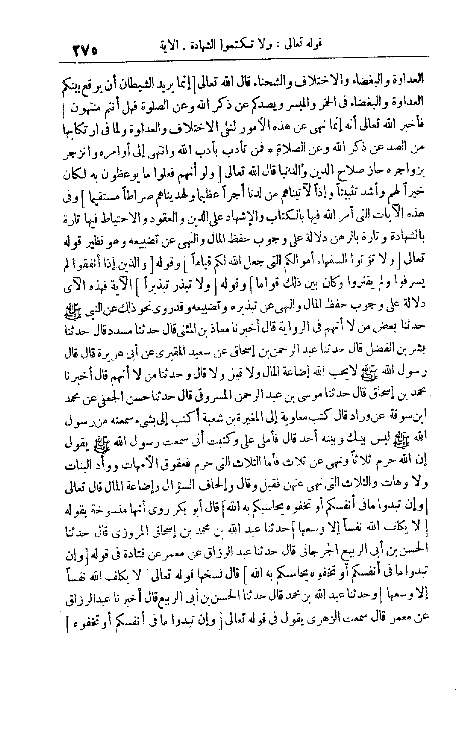 الْعَدَاوَةِ وَالْبَغْضَاءِ وَالِاخْتِلَافِ وَالشَّحْنَاءِ قَالَ اللَّهُ تَعَالَى إِنَّما يُرِيدُ الشَّيْطانُ أَنْ يُوقِعَ بَيْنَكُمُ الْعَداوَةَ وَالْبَغْضاءَ فِي الْخَمْرِ وَالْمَيْسِرِ وَيَصُدَّكُمْ عَنْ ذِكْرِ اللَّهِ وَعَنِ الصَّلاةِ فَهَلْ أَنْتُمْ مُنْتَهُونَ فَأَخْبَرَ اللَّهُ تَعَالَى أَنَّهُ إنَّمَا نَهَى عَنْ هَذِهِ الْأُمُورِ لِنَفْيِ الِاخْتِلَافِ وَالْعَدَاوَةِ وَلِمَا فِي ارْتِكَابِهَا مِنْ الصَّدِّ عَنْ ذِكْرِ اللَّهِ وَعَنْ الصَّلَاةِ فَمَنْ تَأَدَّبَ بِأَدَبِ اللَّهِ وَانْتَهَى إلَى أَوَامِرِهِ وَانْزَجَرَ بِزَوَاجِرِهِ حَازَ صَلَاحَ الدِّينِ وَالدُّنْيَا قَالَ اللَّهُ تَعَالَى وَلَوْ أَنَّهُمْ فَعَلُوا مَا يُوعَظُونَ بِهِ لَكانَ خَيْراً لَهُمْ وَأَشَدَّ تَثْبِيتاً وَإِذاً لَآتَيْناهُمْ مِنْ لَدُنَّا أَجْراً عَظِيماً وَلَهَدَيْناهُمْ صِراطاً مُسْتَقِيماً وَفِي هَذِهِ الْآيَاتِ الَّتِي أَمَرَ اللَّهُ فِيهَا بِالْكِتَابِ وَالْإِشْهَادِ عَلَى الدَّيْنِ وَالْعُقُودِ وَالِاحْتِيَاطُ فِيهَا تَارَةً بِالشَّهَادَةِ وَتَارَةً بِالرَّهْنِ دَلَالَةٌ عَلَى وُجُوبِ حِفْظِ الْمَالِ وَالنَّهْيِ عَنْ تَضْيِيعِهِ وَهُوَ نَظِيرُ قَوْله تَعَالَى وَلا تُؤْتُوا السُّفَهاءَ أَمْوالَكُمُ الَّتِي جَعَلَ اللَّهُ لَكُمْ قِياماً وَقَوْلِهِ وَالَّذِينَ إِذا أَنْفَقُوا لَمْ يُسْرِفُوا وَلَمْ يَقْتُرُوا وَكانَ بَيْنَ ذلِكَ قَواماً وقوله وَلا تُبَذِّرْ تَبْذِيراً الْآيَةَ فَهَذِهِ الْآيُ دَلَالَةٌ عَلَى وُجُوبِ حِفْظِ الْمَالِ وَالنَّهْيِ عَنْ تَبْذِيرِهِ وَتَضْيِيعِهِ وَقَدْ رُوِيَ نَحْوُ ذَلِكَ عَنْ