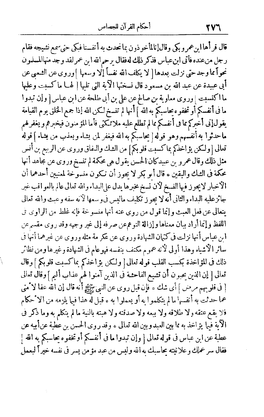 قال قرأها ابن عمر وبكى وقال إنَّا لَمَأْخُوذُونَ بِمَا نُحَدِّثُ بِهِ أَنْفُسَنَا فَبَكَى حَتَّى سُمِعَ نَشِيجُهُ فَقَامَ رَجُلٌ مِنْ عِنْدِهِ فَأَتَى ابْنَ عَبَّاسٍ فَذَكَرَ ذَلِكَ لَهُ فَقَالَ يَرْحَمُ اللَّهُ ابْنَ عُمَرَ لَقَدْ وَجَدَ مِنْهَا الْمُسْلِمُونَ نَحْوًا مِمَّا وَجَدَ حَتَّى نَزَلَتْ بَعْدَهَا لا يُكَلِّفُ اللَّهُ نَفْساً إِلَّا وُسْعَها وَرُوِيَ عَنْ الشَّعْبِيِّ عَنْ أَبِي عُبَيْدَةَ عَنْ عَبْدِ اللَّهِ بْنِ مَسْعُودٍ قَالَ نَسَخَتْهَا الْآيَةُ الَّتِي تَلِيهَا لَها مَا كَسَبَتْ وَعَلَيْها مَا اكْتَسَبَتْ وَرَوَى مُعَاوِيَةُ بْنُ صَالِحٍ عَنْ عَلِيِّ بْنِ أَبِي طَلْحَةَ عَنْ ابْنِ عَبَّاسٍ وَإِنْ تُبْدُوا مَا فِي أَنْفُسِكُمْ أَوْ تُخْفُوهُ يُحاسِبْكُمْ بِهِ اللَّهُ أَنَّهَا لَمْ تُنْسَخْ لَكِنَّ اللَّهَ إذَا جَمَعَ الخلق يوم القيامة يقول إنى أخبركم مما فِي أَنْفُسِكُمْ مِمَّا لَمْ تَطَّلِعْ عَلَيْهِ مَلَائِكَتِي فَأَمَّا الْمُؤْمِنُونَ فَيُخْبِرُهُمْ وَيَغْفِرُ لَهُمْ مَا حَدَّثُوا بِهِ أَنْفُسَهُمْ وَهُوَ قَوْلُهُ يُحاسِبْكُمْ بِهِ اللَّهُ فَيَغْفِرُ لِمَنْ يَشاءُ وَيُعَذِّبُ مَنْ يَشاءُ قَوْله تَعَالَى وَلكِنْ يُؤاخِذُكُمْ بِما كَسَبَتْ قُلُوبُكُمْ مِنْ الشَّكِّ وَالنِّفَاقِ وَرُوِيَ عَنْ الرَّبِيعِ بْنِ أَنَسٍ مِثْلُ ذَلِكَ وَقَالَ عَمْرُو بْنِ عُبَيْدٍ كَانَ الْحَسَنُ يَقُولُ هِيَ مُحْكَمَةٌ لَمْ تُنْسَخْ وَرُوِيَ عَنْ مُجَاهِدٍ أَنَّهَا مُحْكَمَةٌ فِي الشَّكِّ وَالْيَقِينِ قَالَ أَبُو بَكْرٍ لَا يَجُوزُ أَنْ تَكُونَ مَنْسُوخَةً لِمَعْنَيَيْنِ أَحَدِهِمَا أَنَّ الْأَخْبَارَ لَا يَجُوزُ فِيهَا النَّسْخُ لِأَنَّ نَسْخَ مُخْبِرِهَا يَدُلُّ عَلَى الْبَدَاءِ وَاَللَّهُ تَعَالَى عَالِمٌ بِالْعَوَاقِبِ غَيْرُ جَائِزٍ عَلَيْهِ الْبَدَاءُ وَالثَّانِي أَنَّهُ لَا يَجُوزُ تَكْلِيفُ مَا لَيْسَ فِي وُسْعِهَا لِأَنَّهُ سَفَهٌ وَعَبَثٌ وَاَللَّهُ تَعَالَى يَتَعَالَى عَنْ فِعْلِ الْعَبَثِ وَإِنَّمَا قَوْلُ مَنْ رُوِيَ عَنْهُ أَنَّهَا مَنْسُوخَةٌ فَإِنَّهُ غَلَطٌ مِنْ الرَّاوِي فِي اللَّفْظِ وَإِنَّمَا أَرَادَ بَيَانَ مَعْنَاهَا وَإِزَالَةَ التَّوَهُّمِ عَنْ صَرْفِهِ إلَى غَيْرِ وَجْهِهِ وَقَدْ رَوَى مِقْسَمٌ عَنْ ابْنِ عَبَّاسٍ أَنَّهَا نَزَلَتْ فِي كِتْمَانِ الشَّهَادَةِ وروى عن عكرمة مثله وروى عن غيرهما أنها في سائر الأشياء وهذا أَوْلَى لِأَنَّهُ عُمُومٌ مُكْتَفٍ بِنَفْسِهِ فَهُوَ عَامٌّ فِي الشَّهَادَةِ وَغَيْرِهَا وَمِنْ نَظَائِرِ ذَلِكَ فِي الْمُؤَاخَذَةِ بِكَسْبِ الْقَلْبِ قَوْله تَعَالَى وَلكِنْ يُؤاخِذُكُمْ بِما كَسَبَتْ قُلُوبُكُمْ وَقَالَ تَعَالَى إِنَّ الَّذِينَ يُحِبُّونَ أَنْ تَشِيعَ الْفاحِشَةُ فِي الَّذِينَ آمَنُوا لَهُمْ عَذابٌ أَلِيمٌ وقال تعالى فِي قُلُوبِهِمْ مَرَضٌ أَيْ شَكٌّ فَإِنْ قِيلَ
