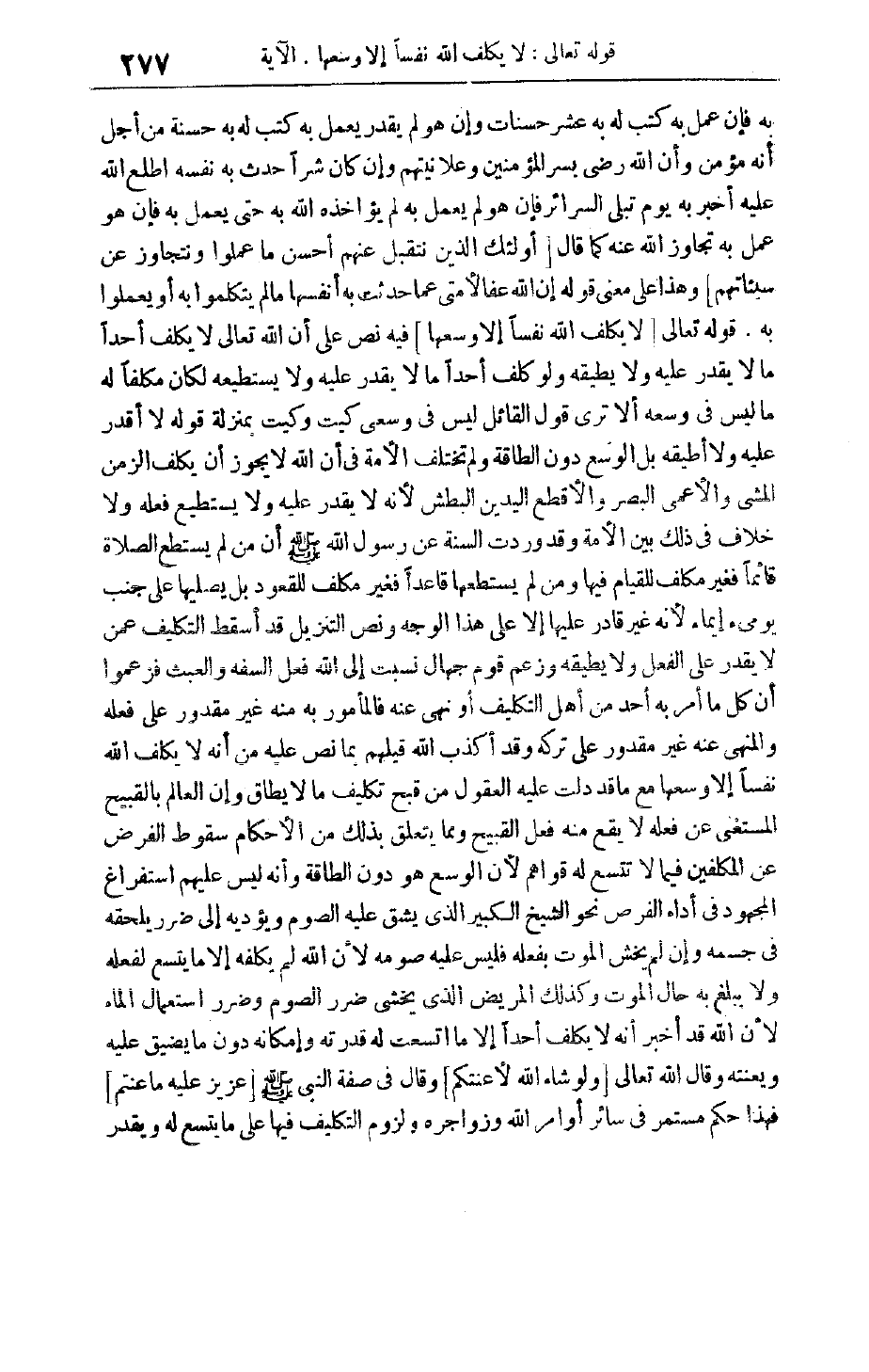 بِهِ فَإِنْ عَمِلَ بِهِ كُتِبَ لَهُ بِهِ عَشْرُ حَسَنَاتٍ وَإِنْ هُوَ لَمْ يَقْدِرْ يَعْمَلْ بِهِ كُتِبَ لَهُ بِهِ حَسَنَةٌ مِنْ أَجْلِ أَنَّهُ مُؤْمِنٌ وَإِنَّ اللَّهَ رَضِيَ بِسِرِّ الْمُؤْمِنِينَ وَعَلَانِيَتِهِمْ وَإِنْ كَانَ شَرًّا حَدَّثَ بِهِ نَفْسَهُ اطَّلَعَ اللَّهُ عَلَيْهِ أَخْبَرَ بِهِ يَوْمَ تُبْلَى السَّرَائِرُ فَإِنْ هُوَ لَمْ يَعْمَلْ بِهِ لَمْ يُؤَاخِذْهُ اللَّهُ بِهِ حَتَّى يَعْمَلَ بِهِ فَإِنْ هُوَ عَمِلَ بِهِ تَجَاوَزَ اللَّهُ عَنْهُ كَمَا قَالَ أُولئِكَ الَّذِينَ نَتَقَبَّلُ عَنْهُمْ أَحْسَنَ مَا عَمِلُوا وَنَتَجاوَزُ عَنْ سَيِّئاتِهِمْ وَهَذَا عَلَى مَعْنَى قَوْلِهِ إنَّ اللَّهَ عَفَا لِأُمَّتِي عَمَّا حَدَّثَتْ بِهِ أَنْفُسَهَا مَا لَمْ يَتَكَلَّمُوا بِهِ أَوْ يَعْمَلُوا بِهِ. قَوْله تَعَالَى لا يُكَلِّفُ اللَّهُ نَفْساً إِلَّا وُسْعَها فِيهِ نَصٌّ عَلَى أَنَّ اللَّهَ تَعَالَى لَا يُكَلِّفُ أَحَدًا مَا لَا يَقْدِرُ عَلَيْهِ وَلَا يُطِيقُهُ وَلَوْ كَلَّفَ أَحَدًا مَا لَا يَقْدِرُ عَلَيْهِ وَلَا يَسْتَطِيعُهُ لَكَانَ مُكَلِّفًا لَهُ مَا لَيْسَ فِي وُسْعِهِ أَلَا تَرَى قَوْلَ الْقَائِلِ لَيْسَ فِي وُسْعِي كَيْتُ وَكَيْتُ بِمَنْزِلَةِ قَوْلِهِ لَا أَقْدِرُ عَلَيْهِ وَلَا أُطِيقُهُ بَلْ الْوُسْعُ دُونَ الطَّاقَةِ وَلَمْ تَخْتَلِفْ الْأُمَّةُ فِي أَنَّ اللَّهَ لَا يَجُوزُ أَنْ يُكَلِّفَ الزَّمِنَ الْمَشْيَ وَالْأَعْمَى الْبَصَرَ وَالْأَقْطَعَ الْيَدَيْنِ الْبَطْشَ لِأَنَّهُ لَا يَقْدِرُ عَلَيْهِ وَلَا يَسْتَطِيعُ فِعْلَهُ وَلَا خِلَافَ فِي ذَلِكَ بَيْنَ الْأُمَّةِ