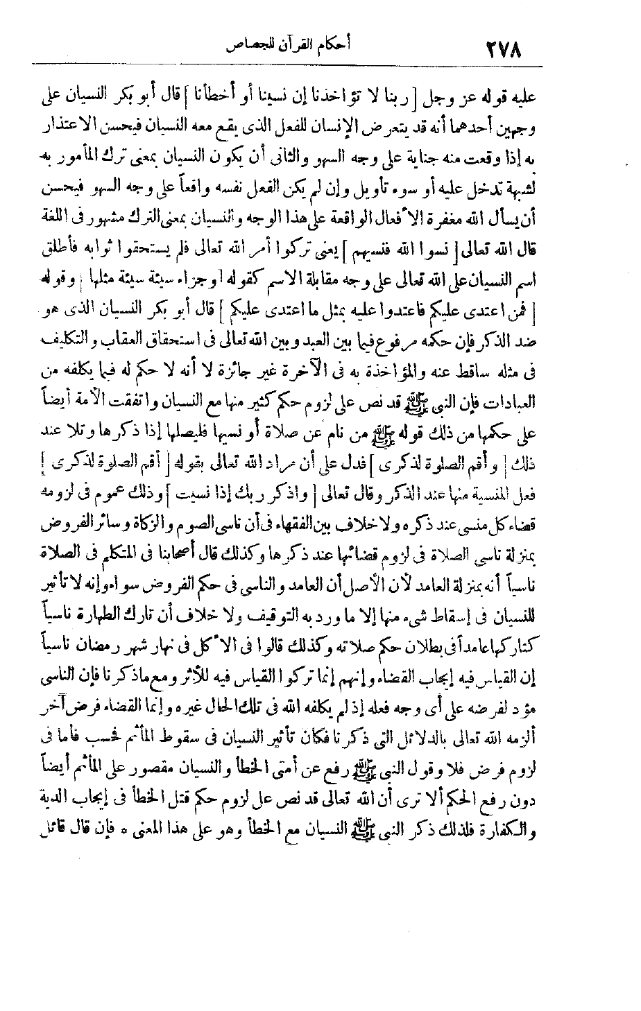 عَلَيْهِ قَوْلُهُ عَزَّ وَجَلَّ رَبَّنا لا تُؤاخِذْنا إِنْ نَسِينا أَوْ أَخْطَأْنا قَالَ أَبُو بَكْرٍ النِّسْيَانُ عَلَى وَجْهَيْنِ أَحَدِهِمَا أَنَّهُ قَدْ يَتَعَرَّضُ الْإِنْسَانُ لِلْفِعْلِ الَّذِي يَقَعُ مَعَهُ النِّسْيَانُ فَيُحْسِنُ الِاعْتِذَارَ بِهِ إذَا وَقَعَتْ مِنْهُ جِنَايَةٌ عَلَى وَجْهِ السَّهْوِ وَالثَّانِي أَنْ يَكُونَ النِّسْيَانُ بِمَعْنَى تَرْكِ الْمَأْمُورِ بِهِ لِشُبْهَةٍ تَدْخُلُ عَلَيْهِ أَوْ سُوءِ تَأْوِيلٍ وَإِنْ لَمْ يَكُنْ الْفِعْلُ نَفْسُهُ وَاقِعًا عَلَى وَجْهِ السَّهْوِ فَيَحْسُنُ أَنْ يَسْأَلَ اللَّهَ مَغْفِرَةَ الْأَفْعَالِ الْوَاقِعَةِ عَلَى هَذَا الْوَجْهِ وَالنِّسْيَانُ بِمَعْنَى التَّرْكِ مَشْهُورٌ فِي اللُّغَةِ قَالَ اللَّهُ تَعَالَى نَسُوا اللَّهَ فَنَسِيَهُمْ يَعْنِي تَرَكُوا أَمْرَ اللَّهِ تَعَالَى فَلَمْ يَسْتَحِقُّوا ثَوَابَهُ فَأَطْلَقَ اسْمَ النِّسْيَانِ عَلَى اللَّهِ تَعَالَى عَلَى وَجْهِ مُقَابَلَةِ الِاسْمِ كَقَوْلِهِ وَجَزاءُ سَيِّئَةٍ سَيِّئَةٌ مِثْلُها وَقَوْلِهِ فَمَنِ اعْتَدى عَلَيْكُمْ فَاعْتَدُوا عَلَيْهِ بِمِثْلِ مَا اعْتَدى عَلَيْكُمْ قَالَ أَبُو بَكْرٍ النِّسْيَانُ الَّذِي هُوَ ضِدُّ الذِّكْرِ فَإِنَّ حُكْمَهُ مَرْفُوعٌ فِيمَا بَيْنَ الْعَبْدِ وَبَيْنَ اللَّهِ تَعَالَى فِي اسْتِحْقَاقِ الْعِقَابِ وَالتَّكْلِيفُ فِي مِثْلِهِ سَاقِطٌ عَنْهُ وَالْمُؤَاخَذَةُ بِهِ فِي الآخرة غير جائزة لا أنه لَا حُكْمَ لَهُ فِيمَا يُكَلِّفُهُ مِنْ الْعِبَادَاتِ فَإِنَّ النَّبِيَّ صَلَّى اللَّهُ عَلَيْهِ وَسَلَّمَ قَدْ نَصَّ عَلَى لُزُومِ حُكْمِ كَثِيرٍ مِنْهَا مَعَ النِّسْيَانِ وَاتَّفَقَتْ الْأُمَّةُ أَيْضًا عَلَى حُكْمِهَا مِنْ ذَلِكَ