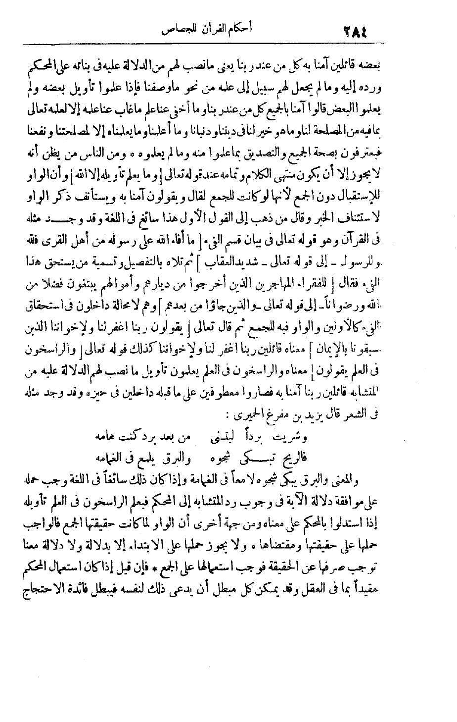 وشريت بردا ليتني من بعد برد كنت هَامَهْ فَالرِّيحُ تَبْكِي شَجْوَهُ وَالْبَرْقُ يَلْمَعُ فِي الغمامه والمعنى والبرق يبكى شجوه لا معا فِي الْغَمَامَةِ وَإِذَا كَانَ ذَلِكَ سَائِغًا فِي اللُّغَةِ وَجَبَ حَمْلُهُ عَلَى مُوَافَقَةِ دَلَالَةِ الْآيَةِ فِي وُجُوبِ رَدِّ الْمُتَشَابِهِ إلَى الْمُحْكَمِ فَيَعْلَمُ الرَّاسِخُونَ فِي الْعِلْمِ تَأْوِيلَهُ إذَا اسْتَدَلُّوا بِالْمُحْكَمِ عَلَى مَعْنَاهُ وَمِنْ جِهَةٍ أُخْرَى أَنَّ الْوَاوَ لَمَّا كَانَتْ حَقِيقَتُهَا الْجَمْعَ فَالْوَاجِبُ حَمْلُهَا عَلَى حَقِيقَتِهَا وَمُقْتَضَاهَا وَلَا يَجُوزُ حَمْلُهَا عَلَى الِابْتِدَاءِ إلَّا بِدَلَالَةٍ وَلَا دَلَالَةَ مَعَنَا تُوجِبُ صَرْفَهَا عَنْ الْحَقِيقَةِ فَوَجَبَ اسْتِعْمَالُهَا عَلَى الْجَمْعِ فَإِنْ قِيلَ إذَا كَانَ اسْتِعْمَالُ الْمُحْكَمِ مُقَيَّدًا بِمَا فِي الْعَقْلِ وَقَدْ يُمْكِنُ كُلُّ مُبْطِلٍ أَنْ يَدَّعِيَ ذَلِكَ لِنَفْسِهِ فَيُبْطِلُ فَائِدَةَ الِاحْتِجَاجِ
