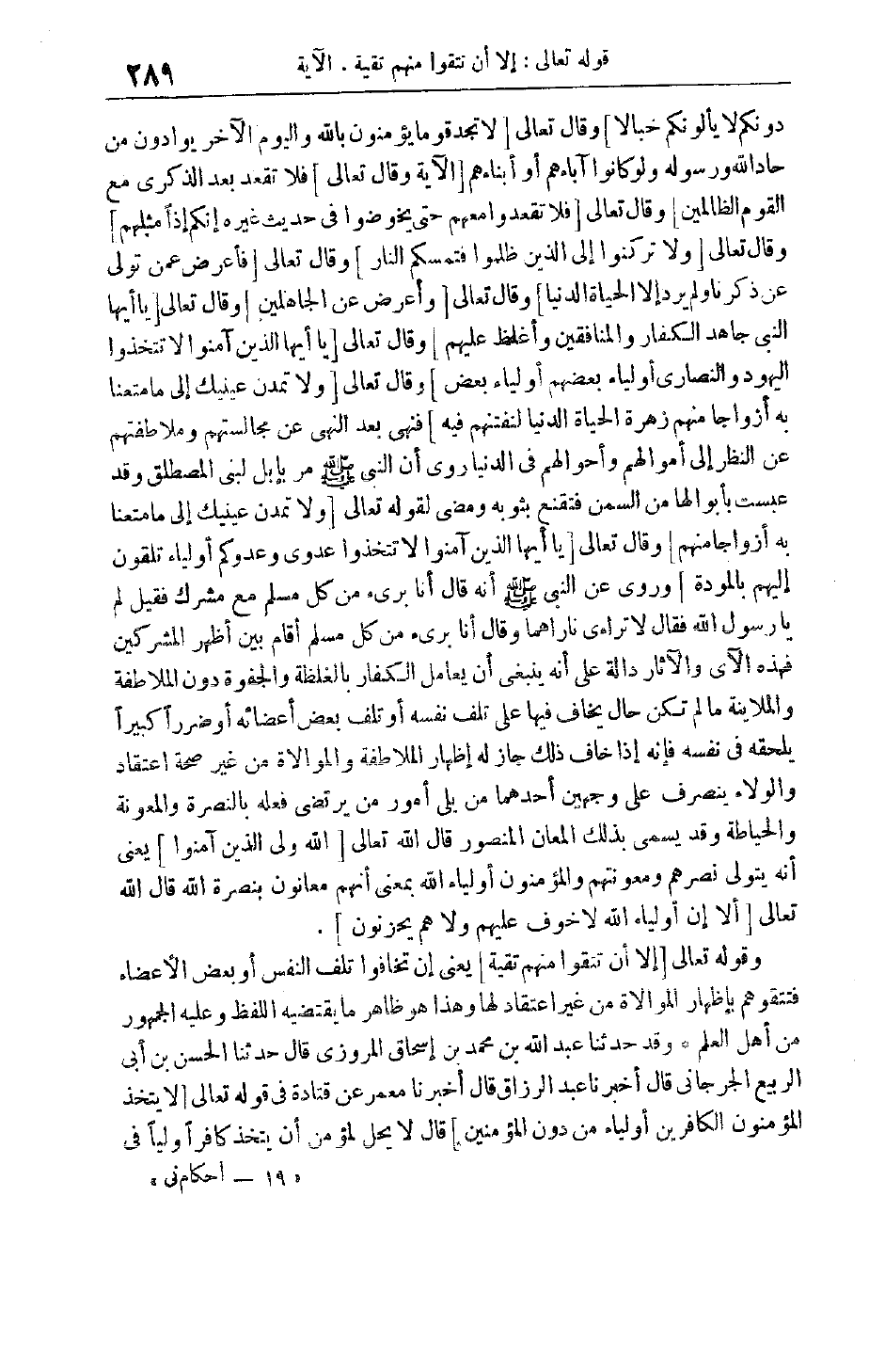 وقَوْله تَعَالَى إِلَّا أَنْ تَتَّقُوا مِنْهُمْ تُقاةً يعنى إن تخافوا تلف النفس أو بعض الْأَعْضَاءِ فَتَتَّقُوهُمْ بِإِظْهَارِ الْمُوَالَاةِ مِنْ غَيْرِ اعْتِقَادٍ لَهَا وَهَذَا هُوَ ظَاهِرُ مَا يَقْتَضِيهِ اللَّفْظُ وَعَلَيْهِ الْجُمْهُورُ مِنْ أَهْلِ الْعِلْمِ وَقَدْ حَدَّثَنَا عبد الله بن محمد بن إِسْحَاقَ الْمَرْوَزِيِّ قَالَ حَدَّثَنَا الْحَسَنُ بْنُ أَبِي الرَّبِيعِ الْجُرْجَانِيُّ قَالَ أَخْبَرَنَا عَبْدُ الرَّزَّاقِ قَالَ أَخْبَرَنَا مَعْمَرٌ عَنْ قَتَادَةَ فِي قَوْله تَعَالَى لا يَتَّخِذِ الْمُؤْمِنُونَ الْكافِرِينَ أَوْلِياءَ مِنْ دُونِ الْمُؤْمِنِينَ قَالَ لَا يَحِلُّ لِمُؤْمِنٍ أَنْ يَتَّخِذَ كَافِرًا وليا في «19- أحكام في»