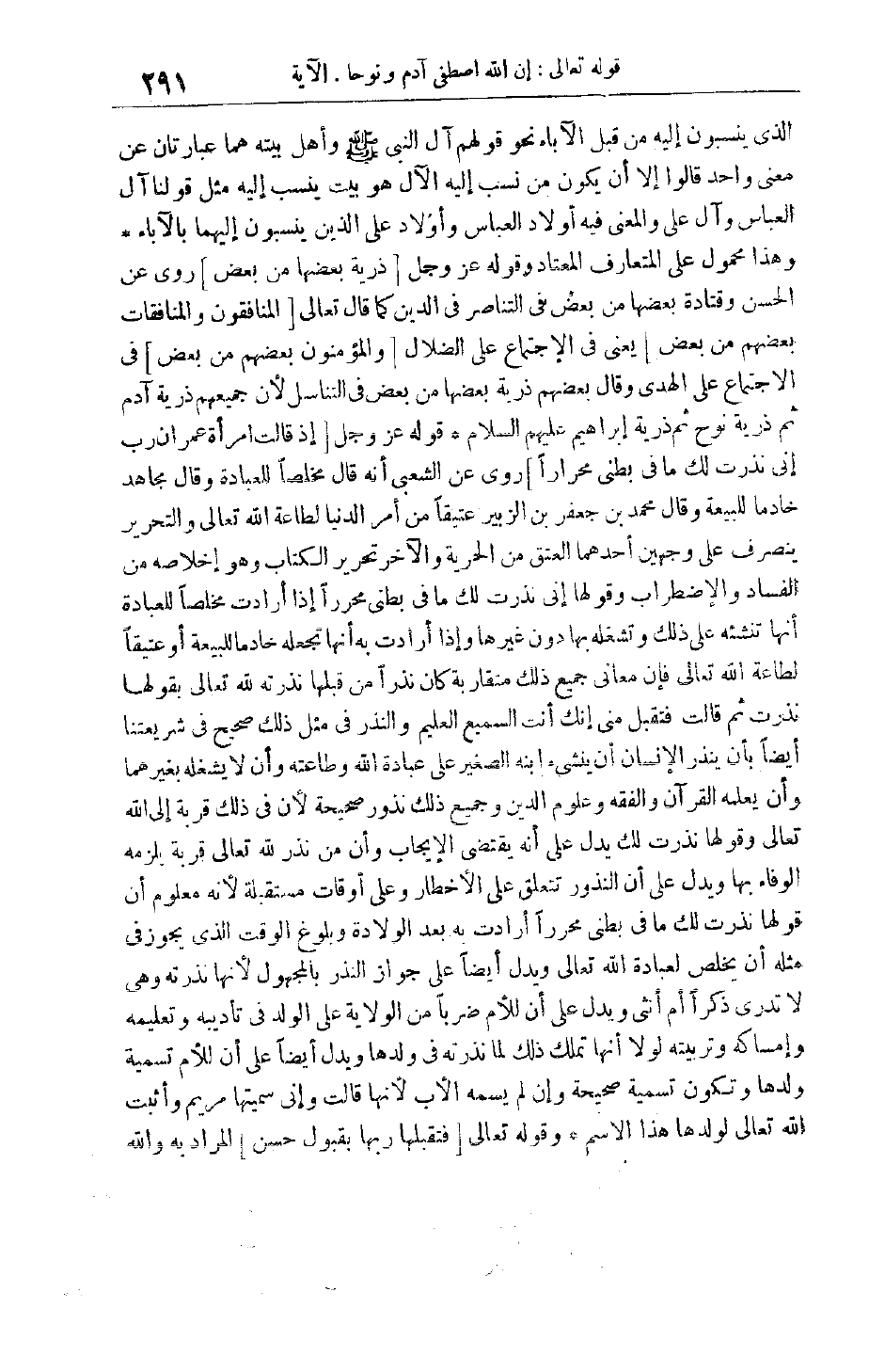 وَقَوْلُهُ عَزَّ وجل ذُرِّيَّةً بَعْضُها مِنْ بَعْضٍ رُوِيَ عَنْ الْحَسَنِ وَقَتَادَةَ بَعْضُهَا مِنْ بَعْضٍ فِي التَّنَاصُرِ فِي الدِّينِ كَمَا قَالَ تَعَالَى الْمُنافِقُونَ وَالْمُنافِقاتُ بَعْضُهُمْ مِنْ بَعْضٍ يعنى في الاجتماع على الضلال [والمؤمنون بعضهم من بعض] فِي الِاجْتِمَاعِ عَلَى الْهُدَى وَقَالَ بَعْضُهُمْ ذُرِّيَّةً بعضها من بعض فِي التَّنَاسُلِ لِأَنَّ جَمِيعَهُمْ ذُرِّيَّةُ آدَمَ ثُمَّ ذُرِّيَّةُ نُوحٍ ثُمَّ ذُرِّيَّةُ إبْرَاهِيمَ عَلَيْهِمْ السَّلَامُ