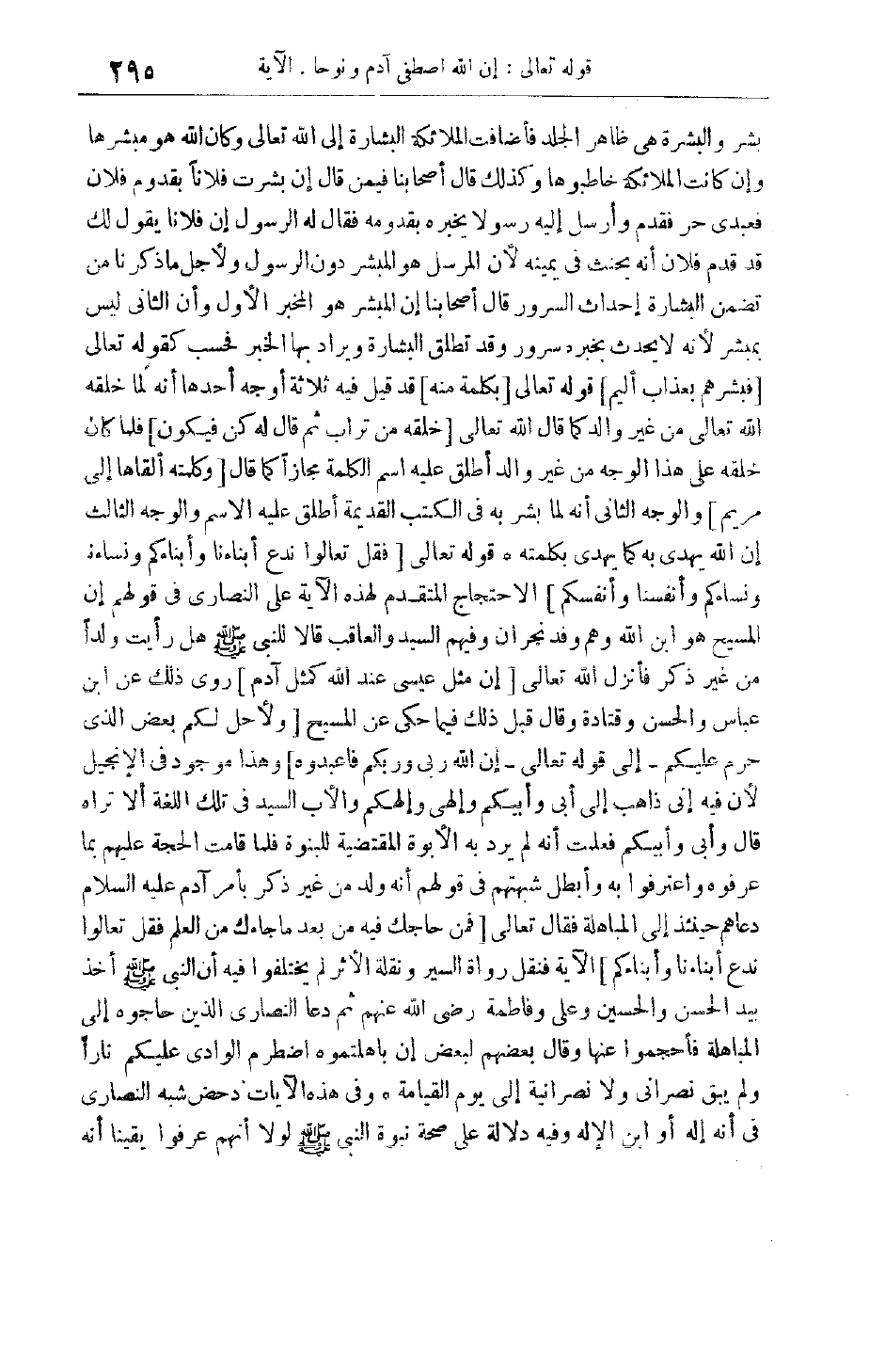 أَنَّ النَّبِيَّ صَلَّى اللَّهُ عَلَيْهِ وَسَلَّمَ أَخَذَ بِيَدِ الْحَسَنِ وَالْحُسَيْنِ وَعَلِيٍّ وَفَاطِمَةَ رَضِيَ اللَّهُ عَنْهُمْ ثُمَّ دَعَا النَّصَارَى الَّذِينَ حَاجُّوهُ إلَى الْمُبَاهَلَةِ فَأَحْجَمُوا عَنْهَا وَقَالَ بَعْضُهُمْ لِبَعْضٍ إنْ بَاهَلْتُمُوهُ اضْطَرَمَ الْوَادِي عَلَيْكُمْ نَارًا وَلَمْ يَبْقَ نَصْرَانِيٌّ وَلَا نَصْرَانِيَّةٌ إلَى يَوْمِ الْقِيَامَةِ