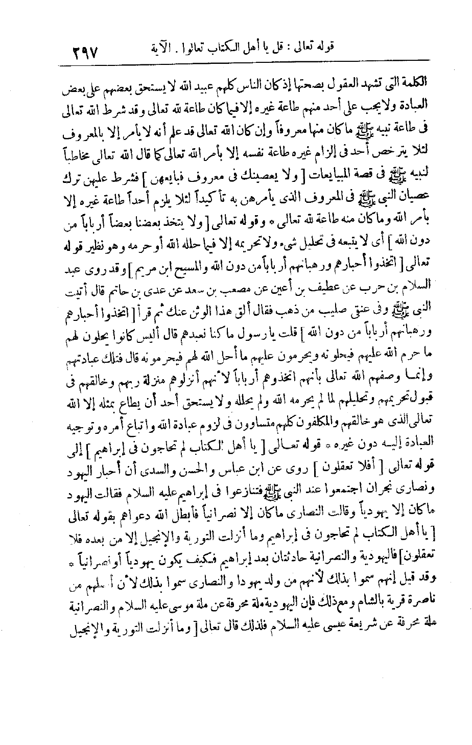 الْكَلِمَةُ الَّتِي تَشْهَدُ الْعُقُولُ بِصِحَّتِهَا إذْ كَانَ النَّاسُ كُلُّهُمْ عَبِيدَ اللَّهِ لَا يَسْتَحِقُّ بَعْضُهُمْ عَلَى بَعْضٍ الْعِبَادَةَ وَلَا يَجِبُ عَلَى أَحَدٍ مِنْهُمْ طَاعَةُ غَيْرِهِ إلَّا فِيمَا كَانَ طَاعَةً لِلَّهِ تَعَالَى وَقَدْ شَرَطَ اللَّهُ تَعَالَى فِي طَاعَةِ نَبِيِّهِ صَلَّى اللَّهُ عَلَيْهِ وَسَلَّمَ مَا كَانَ مِنْهَا مَعْرُوفًا وَإِنْ كَانَ اللَّهُ تَعَالَى قَدْ عَلِمَ أَنَّهُ لَا يَأْمُرُ إلَّا بِالْمَعْرُوفِ لِئَلَّا يَتَرَخَّصَ أَحَدٌ فِي إلْزَامِ غَيْرِهِ طَاعَةَ نفسه إلا بأمر الله تعالى كما قَالَ اللَّهُ تَعَالَى مُخَاطِبًا لِنَبِيِّهِ صَلَّى اللَّهُ عَلَيْهِ وَسَلَّمَ فِي قِصَّةِ الْمُبَايِعَاتِ وَلا يَعْصِينَكَ فِي مَعْرُوفٍ فَبايِعْهُنَّ فَشَرَطَ عَلَيْهِنَّ تَرْكَ عِصْيَانِ النَّبِيِّ صَلَّى اللَّهُ عَلَيْهِ وَسَلَّمَ فِي الْمَعْرُوفِ الَّذِي يَأْمُرُهُنَّ بِهِ تَأْكِيدًا لِئَلَّا يُلْزِمَ أَحَدًا طَاعَةَ غَيْرِهِ إلَّا بِأَمْرِ اللَّهِ وَمَا كَانَ مِنْهُ طَاعَةٌ لِلَّهِ تَعَالَى وقَوْله تَعَالَى وَلا يَتَّخِذَ بَعْضُنا بَعْضاً أَرْباباً مِنْ دُونِ اللَّهِ أَيْ لَا يَتْبَعْهُ فِي تَحْلِيلِ شَيْءٍ وَلَا تَحْرِيمِهِ إلَّا فِيمَا حَلَّلَهُ اللَّهُ أَوْ حَرَّمَهُ وَهُوَ نَظِيرُ قَوْله تَعَالَى اتَّخَذُوا أَحْبارَهُمْ وَرُهْبانَهُمْ أَرْباباً مِنْ دُونِ اللَّهِ وَالْمَسِيحَ ابْنَ مَرْيَمَ