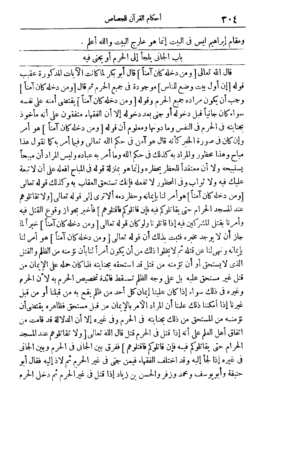 قَالَ اللَّهُ تعالى وَمَنْ دَخَلَهُ كانَ آمِناً قَالَ أَبُو بَكْرٍ لَمَّا كَانَتْ الْآيَاتُ الْمَذْكُورَةُ عَقِيبَ قَوْلِهِ إِنَّ أَوَّلَ بَيْتٍ وُضِعَ لِلنَّاسِ مَوْجُودَةً فِي جَمِيعِ الْحَرَمِ ثُمَّ قَالَ وَمَنْ دَخَلَهُ كانَ آمِناً وَجَبَ أَنْ يَكُونَ مُرَادُهُ جَمِيعَ الْحَرَمِ وَقَوْلُهُ وَمَنْ دَخَلَهُ كانَ آمِناً يَقْتَضِي أَمْنَهُ عَلَى نَفْسِهِ سَوَاءٌ كَانَ جَانِيًا قَبْلَ دُخُولِهِ أَوْ جَنَى بَعْدَ دُخُولِهِ إلَّا أَنَّ الْفُقَهَاءَ مُتَّفِقُونَ عَلَى أَنَّهُ مَأْخُوذٌ بِجِنَايَتِهِ فِي الْحَرَمِ فِي النَّفْسِ وَمَا دُونَهَا وَمَعْلُومٌ أن قوله وَمَنْ دَخَلَهُ كانَ آمِناً هُوَ أَمْرٌ وَإِنْ كَانَ فِي صُورَةِ الْخَبَرِ كَأَنَّهُ قَالَ هُوَ آمِنٌ فِي حُكْمِ اللَّهِ تَعَالَى وَفِيمَا أَمَرَ بِهِ كَمَا نَقُولُ هَذَا مباح وهذا محظور والمراد به كَذَلِكَ فِي حُكْمِ اللَّهِ وَمَا أَمَرَ بِهِ عِبَادَهُ وَلَيْسَ الْمُرَادُ أَنَّ مُبِيحًا يَسْتَبِيحُهُ وَلَا أَنَّ مُعْتَقِدًا لِلْحَظْرِ يَحْظُرُهُ وَإِنَّمَا هُوَ بِمَنْزِلَةِ قَوْلِهِ فِي الْمُبَاحِ افْعَلْهُ عَلَى أَنْ لَا تَبِعَةَ عَلَيْك فِيهِ وَلَا ثَوَابَ وَفِي الْمَحْظُورِ لَا تَفْعَلْهُ فَإِنَّك تَسْتَحِقُّ الْعِقَابَ بِهِ وَكَذَلِكَ قوله تعالى وَمَنْ دَخَلَهُ كانَ آمِناً هُوَ أَمْرٌ لَنَا بِإِيمَانِهِ وَحَظْرِ دَمِهِ أَلَا تَرَى إلَى قَوْله تَعَالَى وَلا تُقاتِلُوهُمْ عِنْدَ الْمَسْجِدِ الْحَرامِ حَتَّى يُقاتِلُوكُمْ فِيهِ فَإِنْ قاتَلُوكُمْ فَاقْتُلُوهُمْ فَأَخْبَرَ بِجَوَازِ وُقُوعِ الْقَتْلِ فِيهِ وَأَمَرَنَا بِقَتْلِ الْمُشْرِكِينَ فِيهِ إذَا قَاتَلُونَا وَلَوْ كَانَ قَوْله تعالى وَمَنْ دَخَلَهُ كانَ آمِناً خَبَرًا لَمَا جَازَ أَنْ لَا يُوجَدَ مُخْبَرُهُ فَثَبَتَ بِذَلِكَ أَنَّ قَوْله تَعَالَى وَمَنْ دَخَلَهُ كانَ آمِناً هُوَ أَمْرٌ لَنَا بِإِيمَانِهِ وَنَهْيٌ لَنَا عَنْ قتله ثم لا يخلوا ذَلِكَ مِنْ أَنْ يَكُونَ أَمْرًا لَنَا بِأَنْ نُؤَمِّنَهُ مِنْ الظُّلْمِ وَالْقَتْلِ الَّذِي لَا يَسْتَحِقُّ أو أن تؤمنه مِنْ قَتْلٍ قَدْ اسْتَحَقَّهُ بِجِنَايَتِهِ فَلَمَّا كَانَ حَمْلُهُ عَلَى الْإِيمَانِ مِنْ قَتْلٍ غَيْرِ مُسْتَحَقٍّ عَلَيْهِ بَلْ عَلَى وَجْهِ الظُّلْمِ تَسْقُطُ فَائِدَةُ تَخْصِيصِ الْحَرَمِ بِهِ لِأَنَّ الْحَرَمَ وَغَيْرَهُ فِي ذلك سواء إذا كَانَ عَلَيْنَا إيمَانُ كُلِّ أَحَدٍ مِنْ ظُلْمٍ يَقَعُ بِهِ مِنْ قِبَلِنَا أَوْ مِنْ قِبَلِ غَيْرِنَا إذَا أَمْكَنَنَا ذَلِكَ عَلِمْنَا أَنَّ الْمُرَادَ الْأَمْرُ بِالْإِيمَانِ مِنْ قِبَلِ مُسْتَحِقٍّ فَظَاهِرُهُ يَقْتَضِي أَنْ نُؤَمِّنَهُ مِنْ الْمُسْتَحِقِّ مِنْ ذَلِكَ بِجِنَايَتِهِ فِي الْحَرَمِ وَفِي غَيْرِهِ إلَّا أَنَّ الدَّلَالَةَ قَدْ قَامَتْ مِنْ اتِّفَاقِ أَهْلِ الْعِلْمِ عَلَى أَنَّهُ إذَا قَتَلَ فِي الْحَرَمِ قُتِلَ قَالَ اللَّهُ تَعَالَى وَلا تُقاتِلُوهُمْ عِنْدَ الْمَسْجِدِ الْحَرامِ حَتَّى يُقاتِلُوكُمْ فِيهِ فَإِنْ قاتَلُوكُمْ فَاقْتُلُوهُمْ فَفَرَّقَ بَيْنَ الْجَانِي فِي الْحَرَمِ وَبَيْنَ الْجَانِي فِي غَيْرِهِ إذَا لَجَأَ إلَيْهِ وَقَدْ اخْتَلَفَ الْفُقَهَاءُ فِيمَنْ جَنَى فِي غَيْرِ الْحَرَمِ ثُمَّ لَاذَ إلَيْهِ فَقَالَ أَبُو حَنِيفَةَ وَأَبُو يُوسُفَ وَمُحَمَّدٌ وَزُفَرُ وَالْحَسَنُ بْنُ زِيَادٍ إذَا قَتَلَ فِي غَيْرِ الْحَرَمِ ثُمَّ دَخَلَ الْحَرَمَ