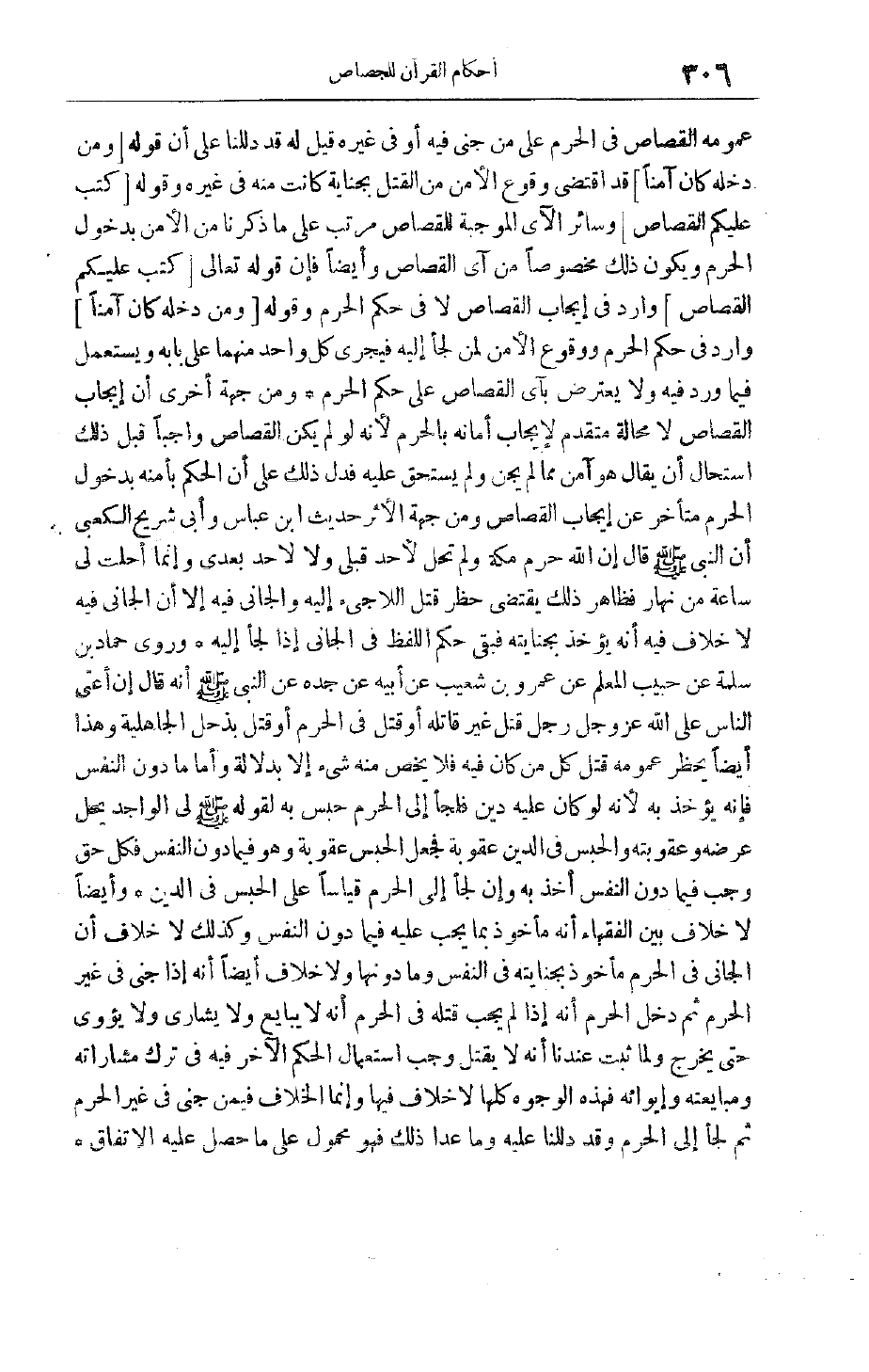 عُمُومُهُ الْقِصَاصَ فِي الْحَرَمِ عَلَى مَنْ جَنَى فِيهِ أَوْ فِي غَيْرِهِ قِيلَ لَهُ قَدْ دَلَّلْنَا عَلَى أَنَّ قَوْلَهُ وَمَنْ دَخَلَهُ كانَ آمِناً قَدْ اقْتَضَى وُقُوعَ الْأَمْنِ مِنْ الْقَتْلِ بِجِنَايَةٍ كَانَتْ مِنْهُ فِي غَيْرِهِ وَقَوْلُهُ كُتِبَ عَلَيْكُمُ الْقِصاصُ وَسَائِرُ الْآيِ الْمُوجِبَةِ لِلْقِصَاصِ مُرَتَّبٌ عَلَى مَا ذَكَرْنَا مِنْ الْأَمْنِ بِدُخُولِ الْحَرَمِ وَيَكُونُ ذَلِكَ مَخْصُوصًا مِنْ آيِ الْقِصَاصِ وَأَيْضًا فَإِنَّ قَوْله تعالى كُتِبَ عَلَيْكُمُ الْقِصاصُ وَارِدٌ فِي إيجَابِ الْقِصَاصِ لَا فِي حُكْمِ الحرم وقوله وَمَنْ دَخَلَهُ كانَ آمِناً وَارِدٌ فِي حُكْمِ الْحَرَمِ وَوُقُوعِ الْأَمْنِ لِمَنْ لَجَأَ إلَيْهِ فَيُجْرَى كُلُّ وَاحِدٍ مِنْهُمَا عَلَى بَابِهِ وَيُسْتَعْمَلُ فِيمَا وَرَدَ فِيهِ وَلَا يَعْتَرِضُ بِآيِ الْقِصَاصِ عَلَى حُكْمِ الْحَرَمِ وَمِنْ جِهَةٍ أُخْرَى أَنَّ إيجَابَ الْقِصَاصِ لَا مَحَالَةَ مُتَقَدِّمٌ لِإِيجَابِ أَمَانِهِ بِالْحَرَمِ لِأَنَّهُ لَوْ لَمْ يَكُنْ الْقِصَاصُ وَاجِبًا قَبْلَ ذَلِكَ اسْتَحَالَ أَنْ يُقَالَ هو آمن مما لَمْ يَجْنِ وَلَمْ يُسْتَحَقَّ عَلَيْهِ فَدَلَّ ذَلِكَ عَلَى أَنَّ الْحُكْمَ بِأَمْنِهِ بِدُخُولِ الْحَرَمِ مُتَأَخِّرٌ عَنْ إيجَابِ الْقِصَاصِ وَمِنْ جِهَةِ الْأَثَرِ