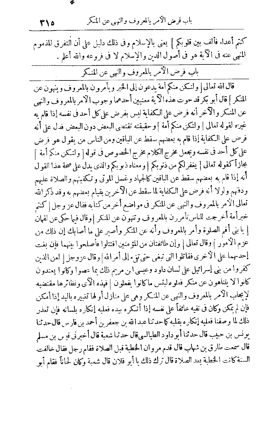 قَالَ اللَّهُ تَعَالَى وَلْتَكُنْ مِنْكُمْ أُمَّةٌ يَدْعُونَ إِلَى الْخَيْرِ وَيَأْمُرُونَ بِالْمَعْرُوفِ وَيَنْهَوْنَ عَنِ الْمُنْكَرِ قَالَ أَبُو بَكْرٍ قَدْ حَوَتْ هَذِهِ الْآيَةُ مَعْنَيَيْنِ أَحَدُهُمَا وُجُوبُ الْأَمْرِ بِالْمَعْرُوفِ وَالنَّهْيِ عَنْ الْمُنْكَرِ وَالْآخَرُ أَنَّهُ فَرْضٌ عَلَى الْكِفَايَةِ لَيْسَ بِفَرْضٍ عَلَى كُلِّ أَحَدٍ فِي نَفْسِهِ إذَا قَامَ بِهِ غَيْرُهُ لِقَوْلِهِ تَعَالَى وَلْتَكُنْ مِنْكُمْ أُمَّةٌ وَحَقِيقَتُهُ تَقْتَضِي الْبَعْضَ دُونَ الْبَعْضِ فَدَلَّ عَلَى أَنَّهُ فَرْضٌ عَلَى الْكِفَايَةِ إذَا قَامَ بِهِ بَعْضُهُمْ سَقَطَ عَنْ الْبَاقِينَ وَمِنْ النَّاسِ مَنْ يَقُولُ هُوَ فَرْضٌ عَلَى كُلِّ أَحَدٍ فِي نَفْسِهِ وَيَجْعَلُ مَخْرَجَ الْكَلَامِ مَخْرَجَ الْخُصُوصِ فِي قوله وَلْتَكُنْ مِنْكُمْ أُمَّةٌ مجازا كقوله تعالى لِيَغْفِرَ لَكُمْ مِنْ ذُنُوبِكُمْ وَمَعْنَاهُ ذُنُوبَكُمْ وَاَلَّذِي يَدُلُّ عَلَى صِحَّةِ هَذَا الْقَوْلِ أَنَّهُ إذَا قَامَ بِهِ بَعْضُهُمْ سَقَطَ عَنْ الْبَاقِينَ كَالْجِهَادِ وَغُسْلِ الْمَوْتَى وَتَكْفِينِهِمْ وَالصَّلَاةِ عَلَيْهِمْ وَدَفْنِهِمْ وَلَوْلَا أَنَّهُ فَرْضٌ عَلَى الْكِفَايَةِ لَمَا سَقَطَ عَنْ الْآخَرِينَ بِقِيَامِ بَعْضِهِمْ بِهِ