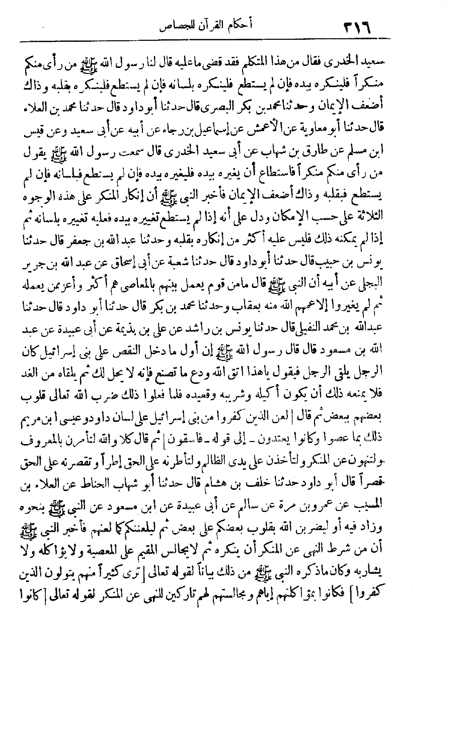 فَأَخْبَرَ النَّبِيُّ صَلَّى اللَّهُ عَلَيْهِ وَسَلَّمَ أَنَّ مِنْ شَرْطِ النَّهْيِ عَنْ الْمُنْكَرِ أَنْ يُنْكِرَهُ ثُمَّ لَا يُجَالِسَ الْمُقِيمَ عَلَى الْمَعْصِيَةِ وَلَا يُؤَاكِلَهُ وَلَا يُشَارِبَهُ وَكَانَ مَا ذَكَرَهُ النَّبِيُّ صَلَّى اللَّهُ عَلَيْهِ وَسَلَّمَ مِنْ ذَلِكَ بَيَانًا لِقَوْلِهِ تَعَالَى تَرى كَثِيراً مِنْهُمْ يَتَوَلَّوْنَ الَّذِينَ كَفَرُوا فَكَانُوا بِمُؤَاكَلَتِهِمْ إيَّاهُمْ وَمُجَالَسَتِهِمْ لَهُمْ تَارِكِينَ لِلنَّهْيِ عَنْ الْمُنْكَرِ لِقَوْلِهِ تَعَالَى كانُوا