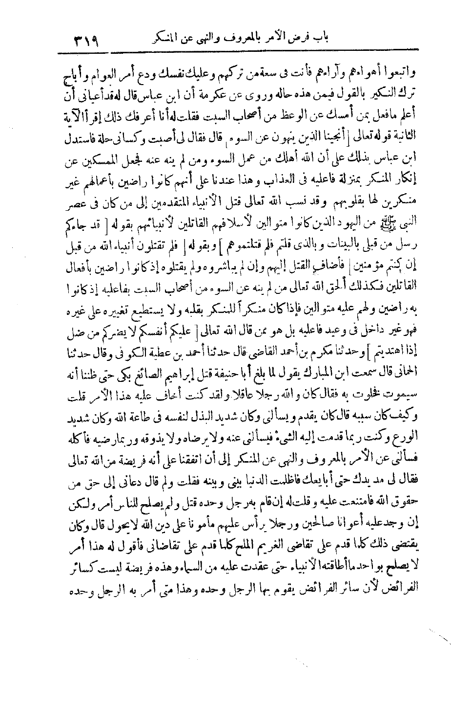 وَاتَّبَعُوا أَهْوَاءَهُمْ وَآرَاءَهُمْ فَأَنْتَ فِي سَعَةٍ مِنْ تَرْكِهِمْ وَعَلَيْك نَفْسَك وَدَعْ أَمْرَ الْعَوَامّ وَأَبَاحَ تَرْكَ النَّكِيرِ بِالْقَوْلِ فِيمَنْ هَذِهِ حَالُهُ وَرُوِيَ عَنْ عِكْرِمَةَ أَنَّ ابْنَ عَبَّاسٍ قَالَ لَهُ قَدْ أَعْيَانِي أَنْ أَعْلَمَ مَا فُعِلَ بِمَنْ أَمْسَكَ عَنْ الْوَعْظِ مِنْ أَصْحَابِ السَّبْتِ فَقُلْت لَهُ أَنَا أُعَرِّفُك ذَلِكَ اقْرَأْ الْآيَةَ الثَّانِيَةَ قَوْله تَعَالَى أَنْجَيْنَا الَّذِينَ يَنْهَوْنَ عَنِ السُّوءِ قَالَ فَقَالَ لِي أَصَبْت وَكَسَانِي حُلَّةً فَاسْتَدَلَّ ابْنُ عَبَّاسٍ بِذَلِكَ عَلَى أَنَّ اللَّهَ أَهْلَكَ مَنْ عَمِلَ السُّوءَ وَمَنْ لَمْ يَنْهَ عَنْهُ فَجَعَلَ الْمُمْسِكِينَ عَنْ إنْكَارِ الْمُنْكَرِ بِمَنْزِلَةِ فَاعِلِيهِ فِي الْعَذَابِ وَهَذَا عِنْدَنَا عَلَى أَنَّهُمْ كَانُوا رَاضِينَ بِأَعْمَالِهِمْ غَيْرَ مُنْكِرِينَ لَهَا بِقُلُوبِهِمْ وَقَدْ نَسَبَ اللَّهُ تَعَالَى قَتْلَ الْأَنْبِيَاءِ الْمُتَقَدِّمِينَ إلَى مَنْ كَانَ فِي عَصْرِ النَّبِيِّ صَلَّى اللَّهُ عَلَيْهِ وَسَلَّمَ مِنْ الْيَهُودِ الَّذِينَ كَانُوا مُتَوَالِينَ لِأَسْلَافِهِمْ الْقَاتِلِينَ لِأَنْبِيَائِهِمْ بِقَوْلِهِ قَدْ جاءَكُمْ رُسُلٌ مِنْ قَبْلِي بِالْبَيِّناتِ وَبِالَّذِي قُلْتُمْ فَلِمَ قَتَلْتُمُوهُمْ وَبِقَوْلِهِ فَلِمَ تَقْتُلُونَ أَنْبِياءَ اللَّهِ مِنْ قَبْلُ إِنْ كُنْتُمْ مُؤْمِنِينَ فَأَضَافَ الْقَتْلَ إلَيْهِمْ وَإِنْ لَمْ يُبَاشِرُوهُ وَلَمْ يَقْتُلُوهُ إذْ كَانُوا رَاضِينَ بِأَفْعَالِ الْقَاتِلِينَ فَكَذَلِكَ أَلْحَقَ اللَّهُ تَعَالَى مَنْ لَمْ يَنْهَ عَنْ السُّوءِ مِنْ أَصْحَابِ السَّبْتِ بِفَاعِلِيهِ إذْ كَانُوا بِهِ رَاضِينَ وَلَهُمْ عَلَيْهِ مُتَوَالِينَ فَإِذَا كَانَ مُنْكِرًا لِلْمُنْكَرِ بِقَلْبِهِ وَلَا يَسْتَطِيعُ تَغْيِيرَهُ عَلَى غَيْرِهِ فَهُوَ غَيْرُ دَاخِلٍ فِي وَعِيدِ فَاعِلِيهِ بَلْ هُوَ مِمَّنْ قَالَ اللَّهُ تَعَالَى عَلَيْكُمْ أَنْفُسَكُمْ لا يَضُرُّكُمْ مَنْ ضَلَّ إِذَا اهْتَدَيْتُمْ وَحَدَّثَنَا مَكْرَمُ بْنُ أَحْمَدَ الْقَاضِي قَالَ حَدَّثَنَا أحمد بن عطية الكوفي وقال حَدَّثَنَا الْحِمَّانِيُّ قَالَ سَمِعْت ابْنَ الْمُبَارَكِ يَقُولُ لَمَّا بَلَغَ أَبَا حَنِيفَةَ قَتْلُ إبْرَاهِيمَ الصَّائِغَ بَكَى حَتَّى ظَنَنَّا أَنَّهُ سَيَمُوتُ فَخَلَوْت بِهِ فَقَالَ كَانَ وَاَللَّهِ رَجُلًا عَاقِلًا وَلَقَدْ كُنْت أَخَافُ عَلَيْهِ هَذَا الْأَمْرَ قُلْت وَكَيْفَ كَانَ سَبَبُهُ قَالَ كَانَ يَقْدُمُ وَيَسْأَلُنِي وَكَانَ شَدِيدَ الْبَذْلِ لِنَفْسِهِ فِي طَاعَةِ اللَّهِ وَكَانَ شَدِيدَ الورع وكنت رُبَّمَا قَدَّمْت إلَيْهِ الشَّيْءَ فَيَسْأَلُنِي عَنْهُ وَلَا يَرْضَاهُ وَلَا يَذُوقُهُ وَرُبَّمَا رَضِيَهُ فَأَكْلَهُ فَسَأَلَنِي عَنْ الْأَمْرِ بِالْمَعْرُوفِ وَالنَّهْيِ عَنْ الْمُنْكَرِ إلَى أَنْ اتَّفَقْنَا عَلَى أَنَّهُ فَرِيضَةٌ مِنْ اللَّهِ تَعَالَى فَقَالَ لِي مُدَّ يَدَك حَتَّى أُبَايِعَك فَأَظْلَمَتْ الدُّنْيَا بَيْنِي وَبَيْنَهُ فَقُلْت وَلِمَ قَالَ دَعَانِي إلَى حَقٍّ مِنْ حُقُوقِ اللَّهِ فَامْتَنَعْت عَلَيْهِ وَقُلْت لَهُ إنْ قَامَ بِهِ رَجُلٌ وَحْدَهُ قُتِلَ وَلَمْ يَصْلُحْ لِلنَّاسِ أَمْرٌ وَلَكِنْ إنْ وَجَدَ عَلَيْهِ أَعْوَانًا صَالِحِينَ وَرَجُلًا يَرْأَسُ عَلَيْهِمْ مَأْمُونًا عَلَى دَيْنِ اللَّهِ لَا يَحُولُ قَالَ وَكَانَ يَقْتَضِي ذَلِكَ كُلَّمَا قَدِمَ عَلَى تَقَاضِي الْغَرِيمِ الْمُلِحِّ كُلَّمَا قَدِمَ عَلَيَّ تَقَاضَانِي فَأَقُولُ لَهُ هَذَا أَمْرٌ لَا يَصْلُحُ بِوَاحِدٍ مَا أَطَاقَتْهُ الْأَنْبِيَاءُ حَتَّى عَقَدَتْ عَلَيْهِ مِنْ السَّمَاءِ وَهَذِهِ فَرِيضَ