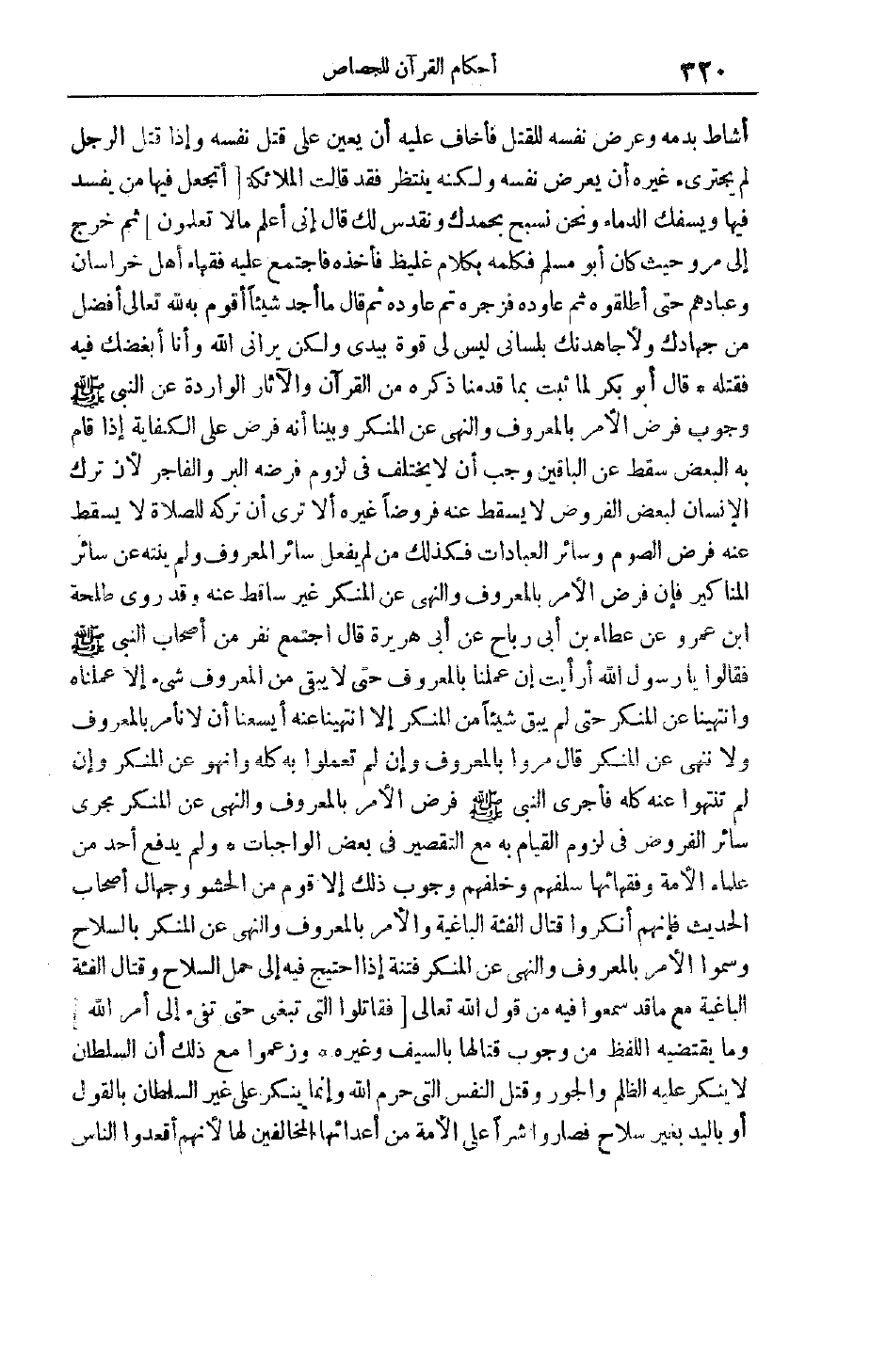 أَشَاطَ بِدَمِهِ وَعَرَّضَ نَفْسَهُ لِلْقَتْلِ فَأَخَافُ عَلَيْهِ أَنْ يُعِينَ عَلَى قَتْلِ نَفْسِهِ وَإِذَا قُتِلَ الرَّجُلُ لَمْ يَجْتَرِئْ غَيْرُهُ أَنْ يُعَرِّضَ نَفْسَهُ وَلَكِنَّهُ يَنْتَظِرُ فَقَدْ قَالَتْ الْمَلَائِكَةُ أَتَجْعَلُ فِيها مَنْ يُفْسِدُ فِيها وَيَسْفِكُ الدِّماءَ وَنَحْنُ نُسَبِّحُ بِحَمْدِكَ وَنُقَدِّسُ لَكَ قالَ إِنِّي أَعْلَمُ مَا لا تَعْلَمُونَ ثُمَّ خَرَجَ إلَى مَرْوَ حَيْثُ كَانَ أَبُو مُسْلِمٍ فَكَلَّمَهُ بِكَلَامٍ غَلِيظٍ فَأَخْذَهُ فَاجْتَمَعَ عَلَيْهِ فُقَهَاءُ أَهْلِ خُرَاسَانَ وَعِبَادُهُمْ حَتَّى أَطْلَقُوهُ ثُمَّ عَاوَدَهُ فَزَجْرَهُ ثُمَّ عَاوَدَهُ ثُمَّ قَالَ مَا أَجِدُ شَيْئًا أَقُومُ بِهِ لِلَّهِ تَعَالَى أَفْضَلَ مِنْ جِهَادِك وَلَأُجَاهِدَنَّك بِلِسَانِي لَيْسَ لِي قُوَّةٌ بِيَدِي وَلَكِنْ يَرَانِي اللَّهُ وَأَنَا أُبْغِضُك فِيهِ فَقَتْلَهُ قَالَ أَبُو بَكْرٍ لَمَّا ثَبَتَ بِمَا قَدَّمْنَا ذِكْرَهُ مِنْ الْقُرْآنِ وَالْآثَارِ الْوَارِدَةِ عَنْ النَّبِيِّ صَلَّى اللَّهُ عَلَيْهِ وَسَلَّمَ وُجُوبُ فَرْضِ الْأَمْرِ بِالْمَعْرُوفِ وَالنَّهْيِ عَنْ الْمُنْكَرِ وَبَيَّنَّا أَنَّهُ فَرْضٌ عَلَى الْكِفَايَةِ إذَا قَامَ بِهِ الْبَعْضُ سَقَطَ عَنْ الْبَاقِينَ وَجَبَ أَنْ لَا يَخْتَلِفَ فِي لُزُومِ فَرْضِهِ الْبَرُّ وَالْفَاجِرُ لِأَنَّ تَرْكَ الإنسان لبعض الفروض لا يسقط عنه فروضا غَيْرِهِ أَلَا تَرَى أَنَّ تَرْكَهُ لِلصَّلَاةِ لَا يُسْقِطُ عَنْهُ فَرْضَ الصَّوْمِ وَسَائِرَ الْعِبَادَاتِ فَكَذَلِكَ مَنْ لَمْ يَفْعَلْ سَائِرَ الْمَعْرُوفِ وَلَمْ يَنْتَهِ عَنْ سَائِرِ الْمَنَاكِيرِ فَإِنَّ فَرْضَ الْأَمْرِ بِالْمَعْرُوفِ وَالنَّهْيِ عَنْ الْمُنْكَرِ غَيْرُ سَاقِطٍ عَنْهُ