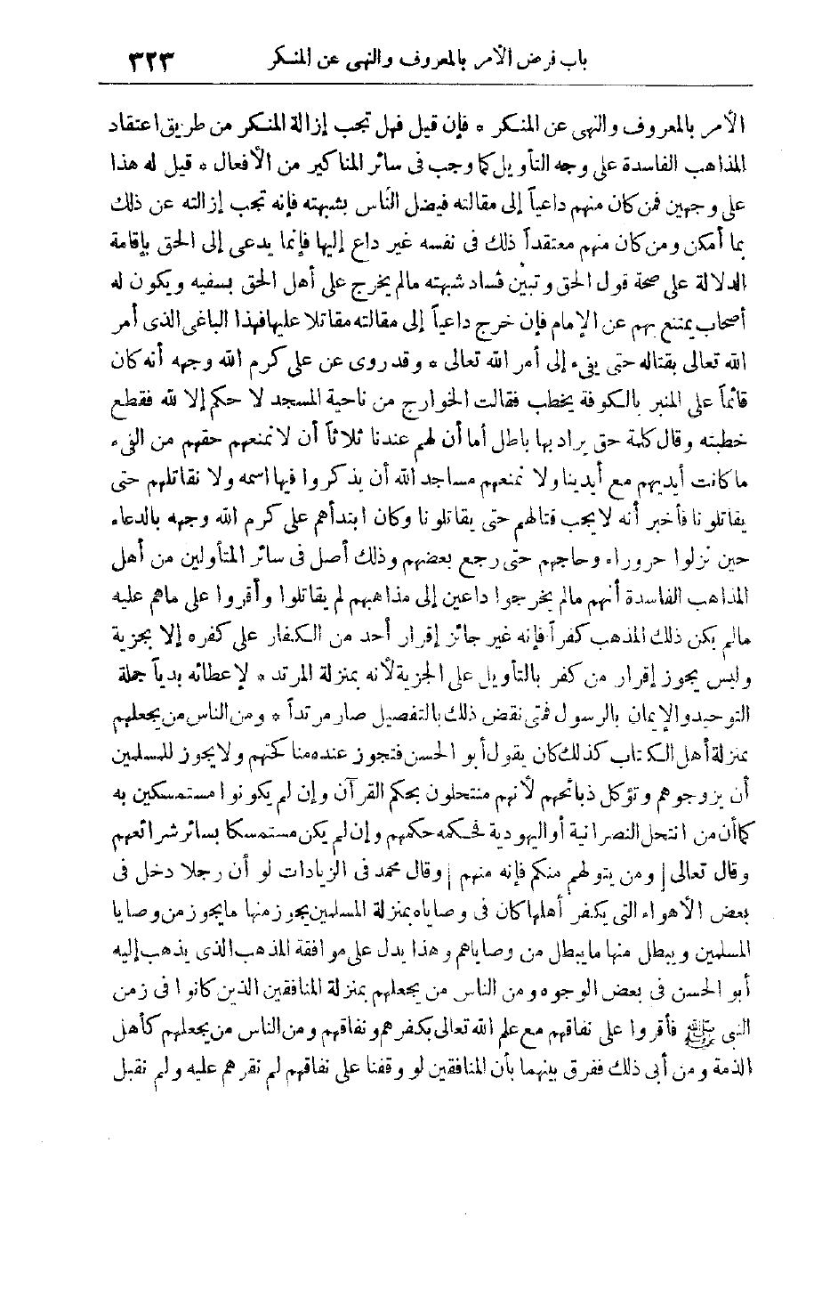 الْأَمْرِ بِالْمَعْرُوفِ وَالنَّهْيِ عَنْ الْمُنْكَرِ فَإِنْ قِيلَ فَهَلْ تَجِبُ إزَالَةُ الْمُنْكَرِ مِنْ طَرِيقِ اعْتِقَادِ الْمَذَاهِبِ الْفَاسِدَةِ عَلَى وَجْهِ التَّأْوِيلِ كَمَا وَجَبَ فِي سَائِرِ الْمَنَاكِيرِ مِنْ الْأَفْعَالِ قِيلَ لَهُ هَذَا عَلَى وَجْهَيْنِ فَمَنْ كَانَ مِنْهُمْ دَاعِيًا إلَى مَقَالَتِهِ فَيُضِلُّ النَّاسَ بِشُبْهَتِهِ فَإِنَّهُ تَجِبُ إزَالَتُهُ عَنْ ذَلِكَ بِمَا أَمْكَنَ وَمَنْ كَانَ مِنْهُمْ مُعْتَقِدًا ذَلِكَ فِي نَفْسِهِ غَيْرَ دَاعٍ إلَيْهَا فَإِنَّمَا يُدْعَى إلَى الْحَقِّ بِإِقَامَةِ الدَّلَالَةِ عَلَى صِحَّةِ قَوْلِ الْحَقِّ وَتَبَيُّنِ فَسَادِ شُبْهَتِهِ ما لم يخرج على أهل الحق بسفيه وَيَكُونُ لَهُ أَصْحَابٌ يَمْتَنِعُ بِهِمْ عَنْ الْإِمَامِ فَإِنْ خَرَجَ دَاعِيًا إلَى مَقَالَتِهِ مُقَاتِلًا عَلَيْهَا فَهَذَا الْبَاغِي الَّذِي أَمَرَ اللَّهُ تَعَالَى بِقِتَالِهِ حَتَّى يَفِيءَ إلَى أَمْرِ اللَّهِ تَعَالَى